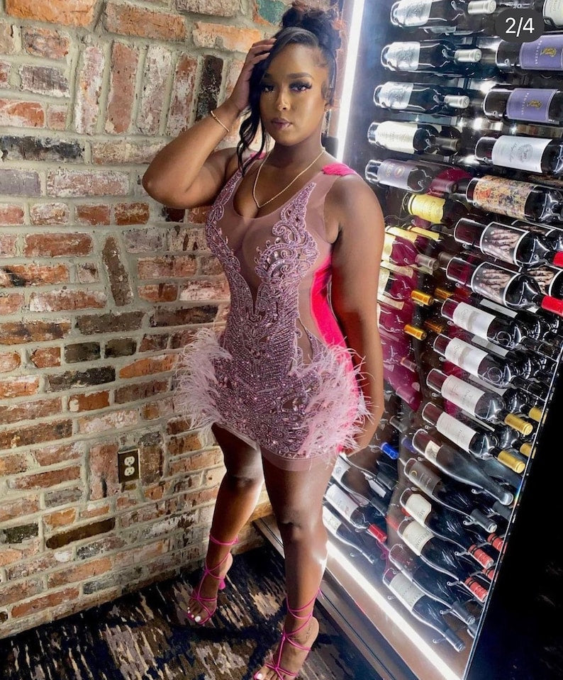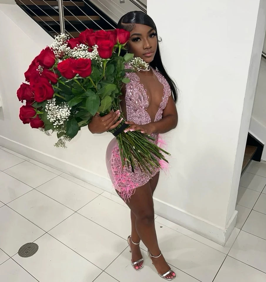 This Luxury Sheer Crystal Feather Mini Dress is perfect for any birthday event. Featuring a classic silhouette and luxurious sheer fabric with crystal feather detailing. this dress ensures an elegant look for any special occasion.