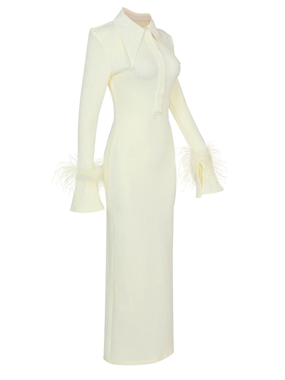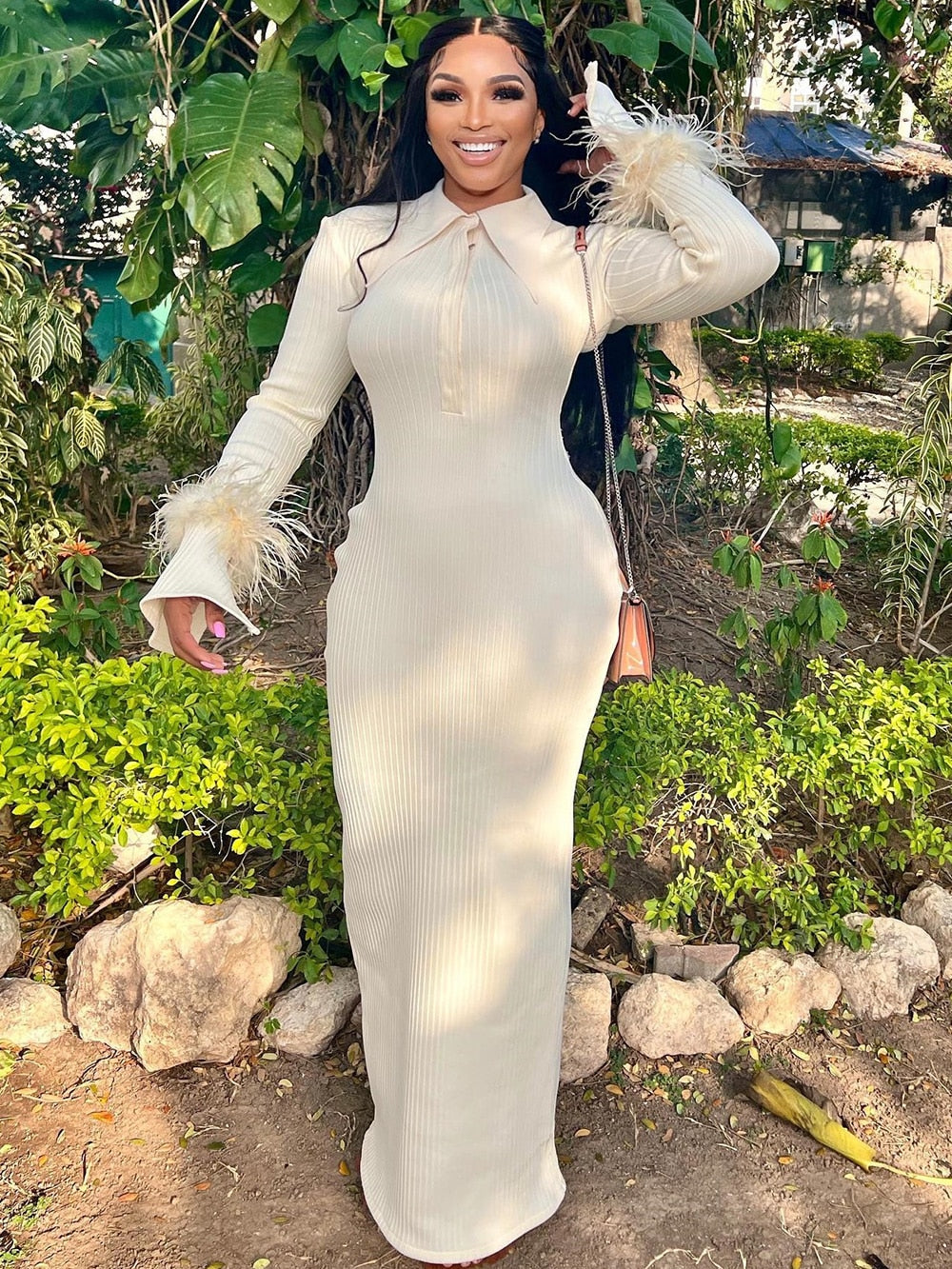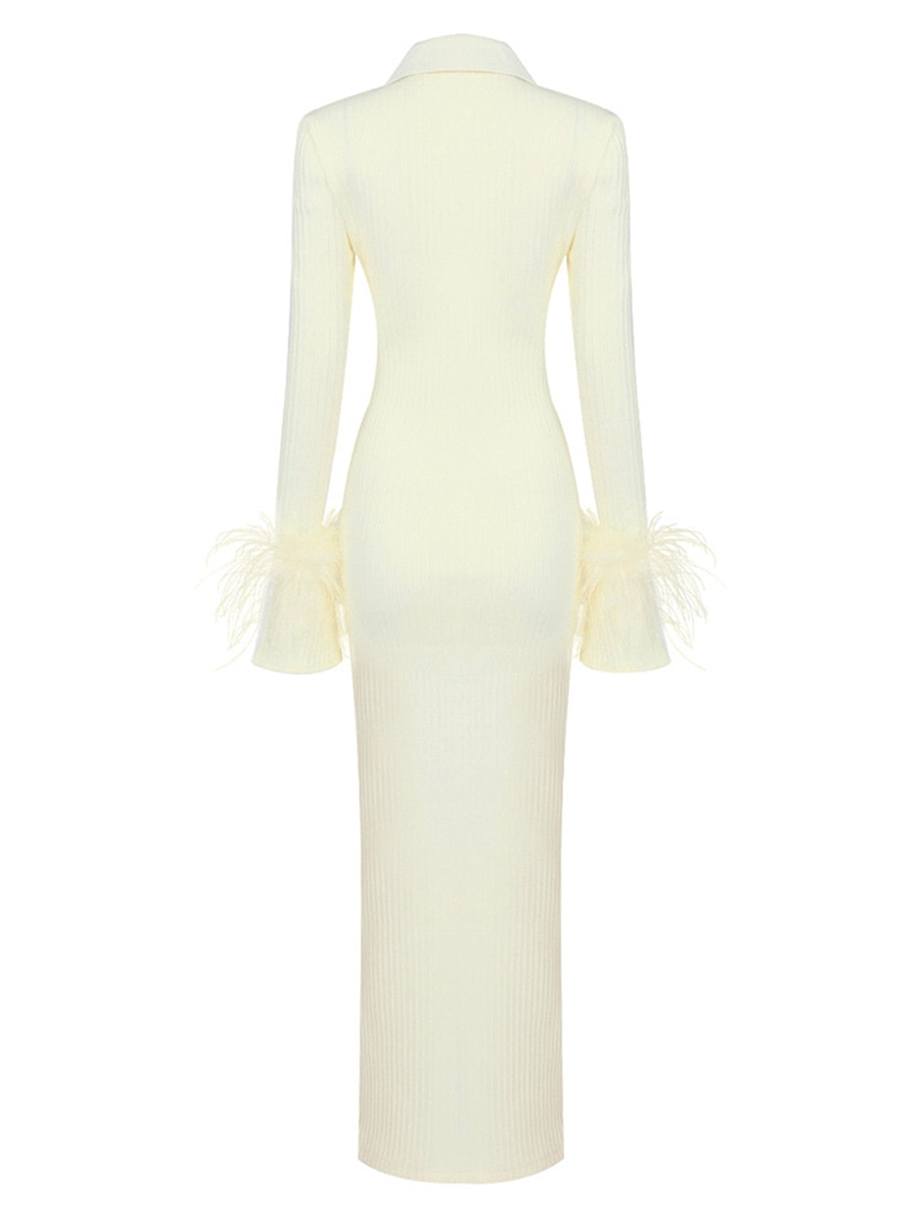 The Maddy Feather Bandage Maxi Dress brings eye-catching style with a modern twist to any event. It is made from 95% Polyester and 5% Spandex for a figure-hugging fit that is lightweight and comfortable.