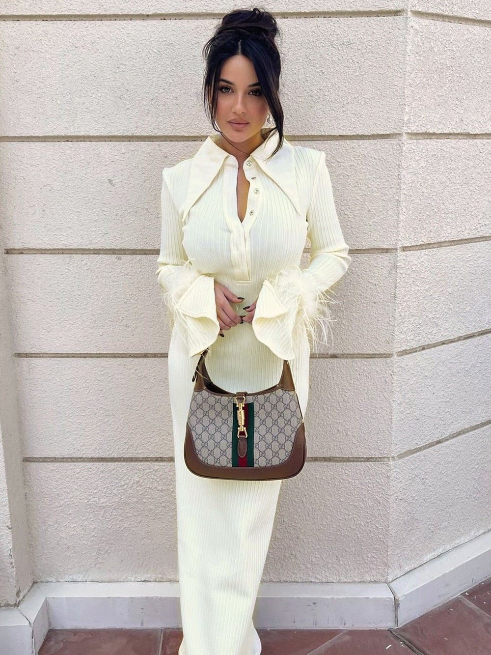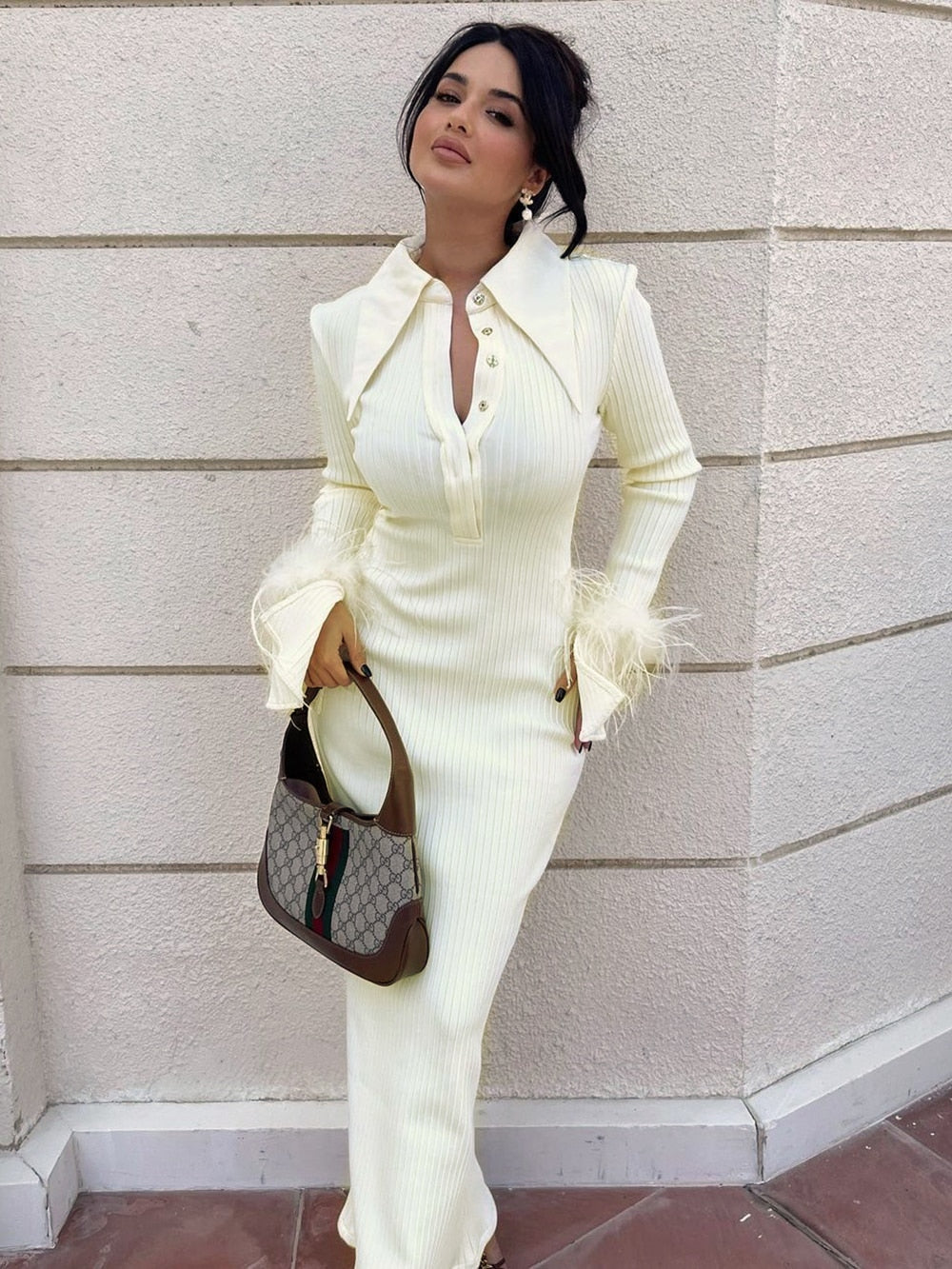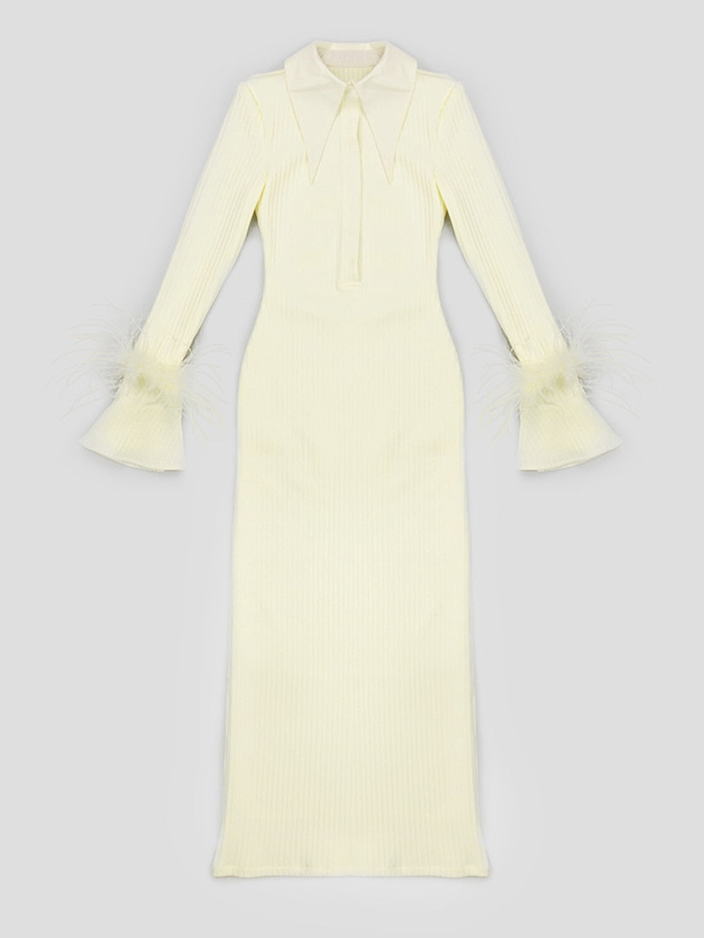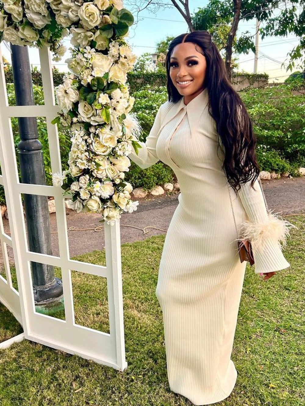 The Maddy Feather Bandage Maxi Dress brings eye-catching style with a modern twist to any event. It is made from 95% Polyester and 5% Spandex for a figure-hugging fit that is lightweight and comfortable.