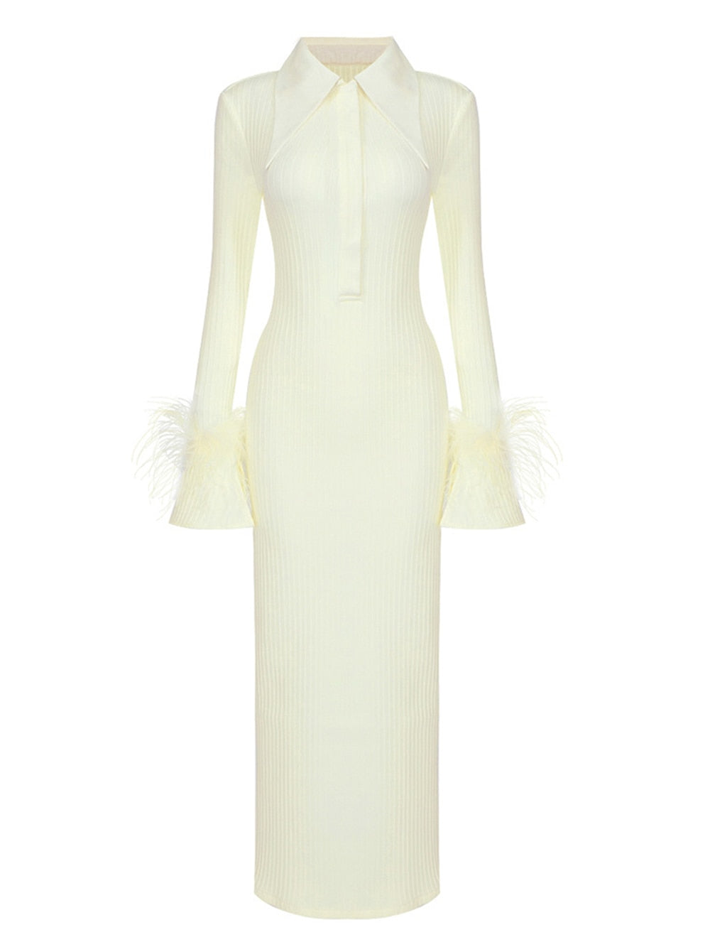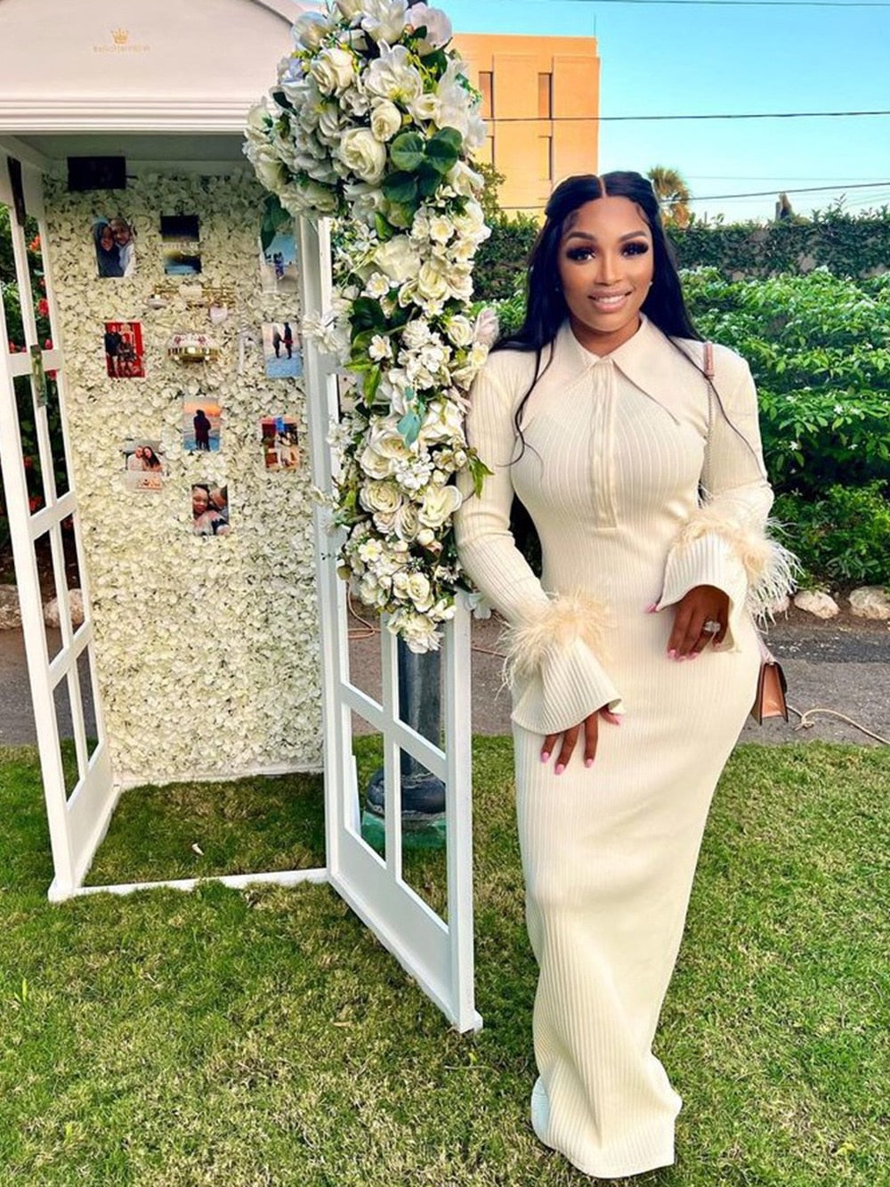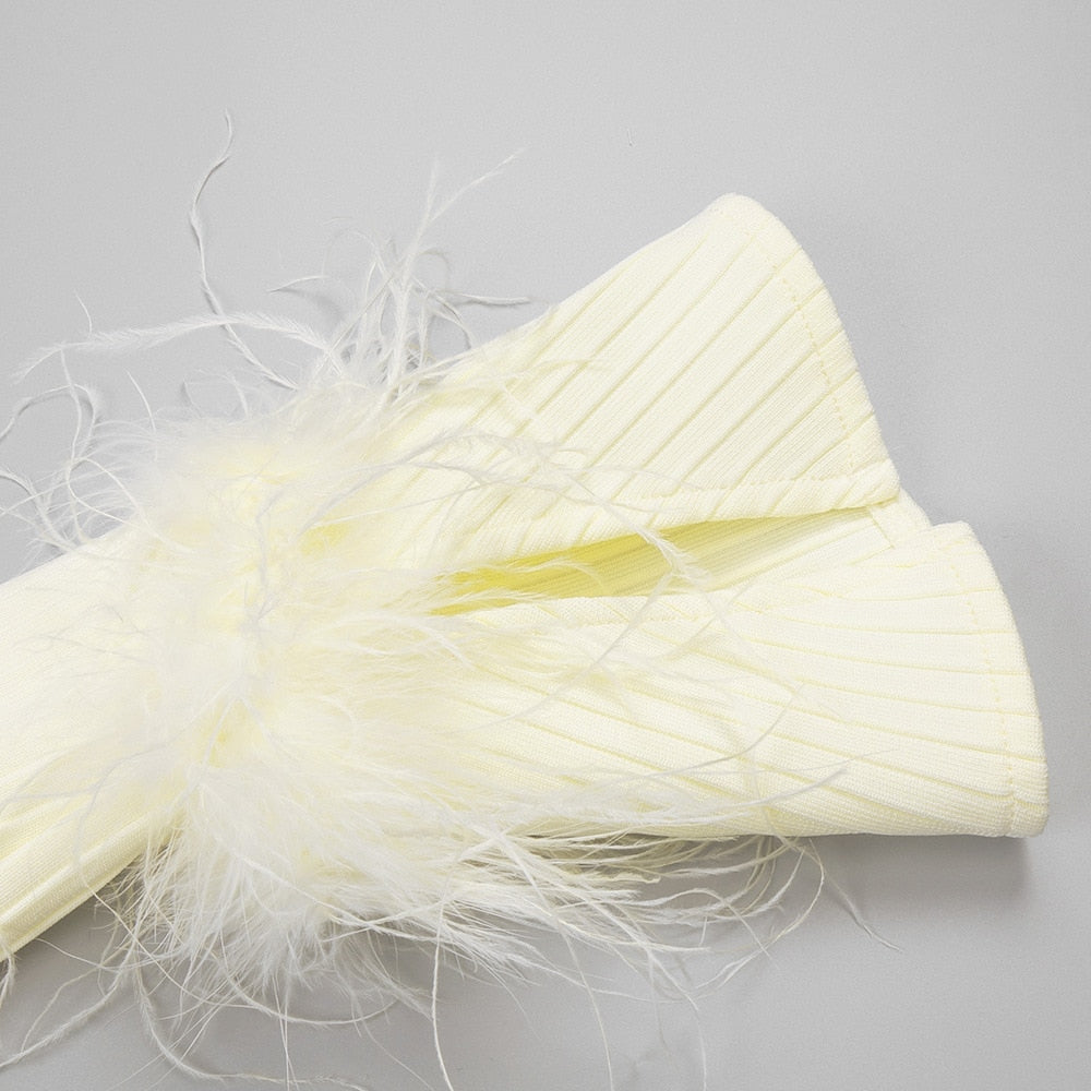 Make a statement in the Maddy Feather Bandage Maxi Dress! This sophisticated dress is designed with a luxurious feather bandage bodice and a delicate maxi style. Perfect for any special occasion. the feather detailing adds an extra luxe touch. Show off your style and make an impression.