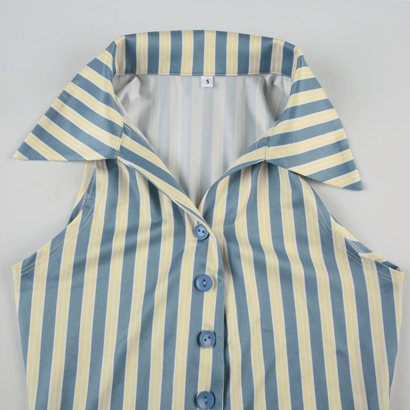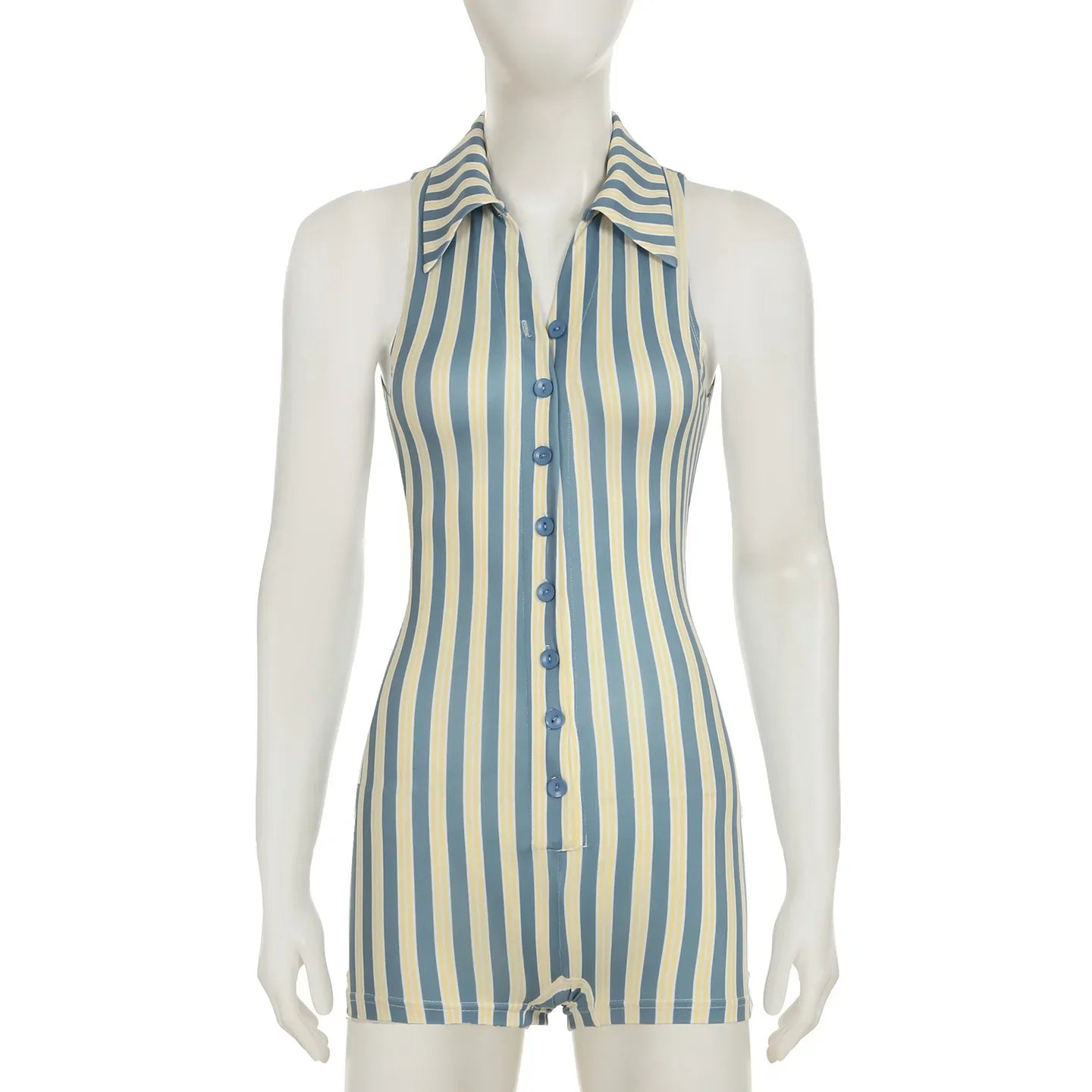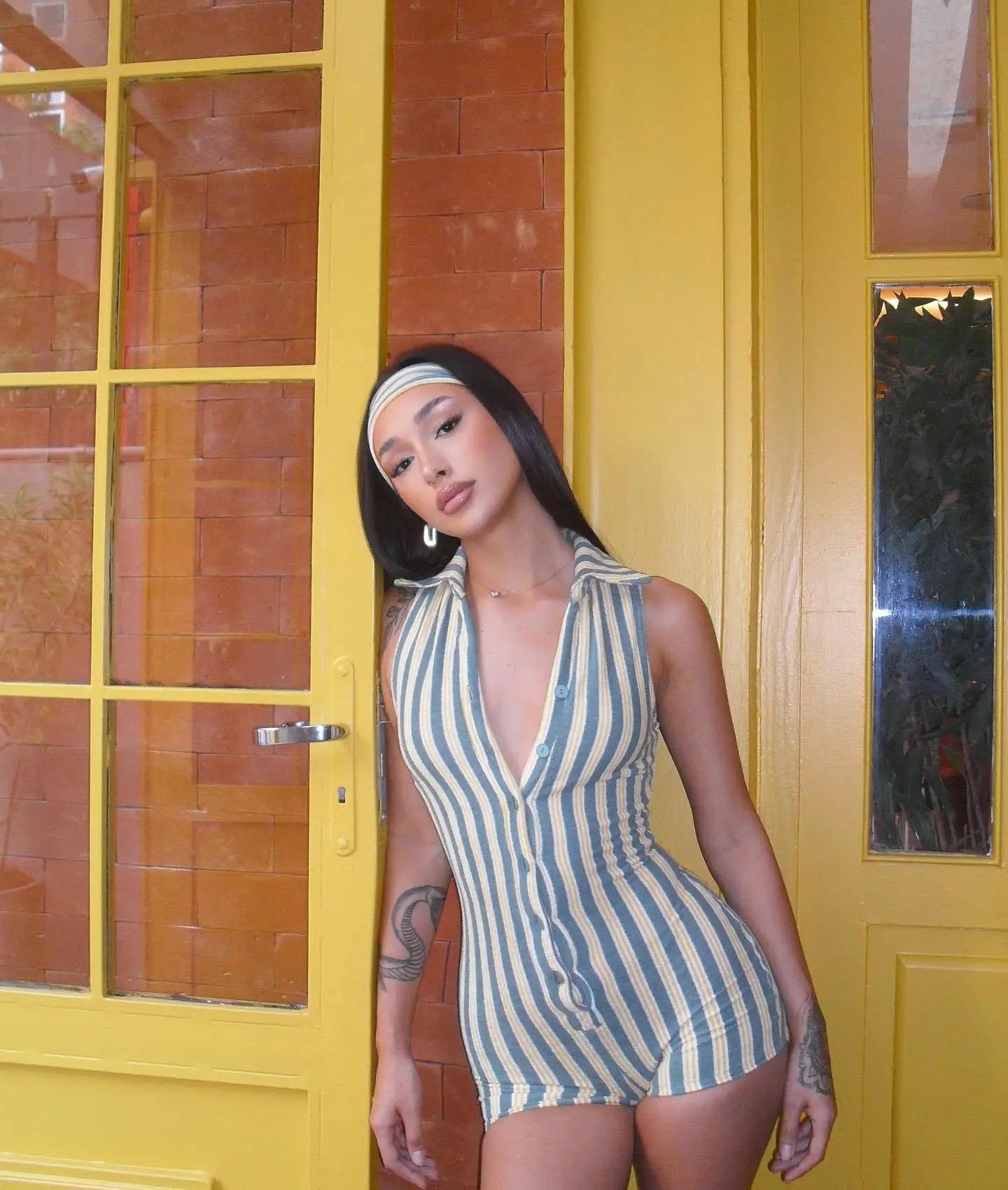Time to meet your new favorite outfit with this Madrid Striped One Piece Set. Crafted from blue striped material with pinstripe patterning. this romper features a halter neckline with button fastenings. Perfect for your Summer days out. simply style with sleek gold earrings and classic kitten heels.