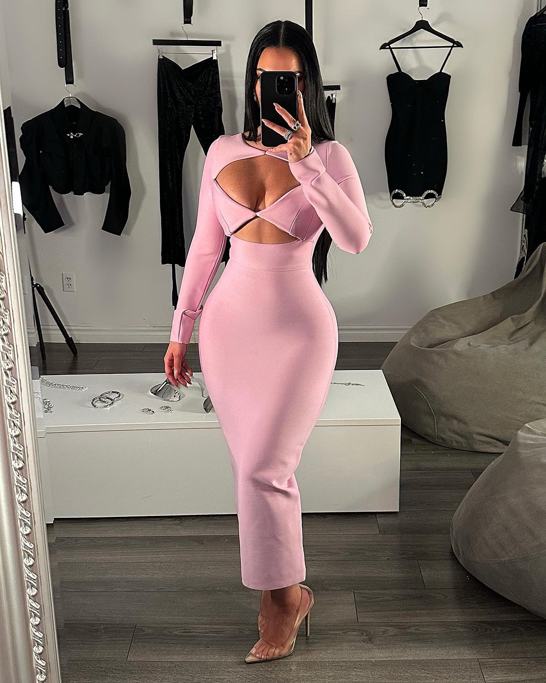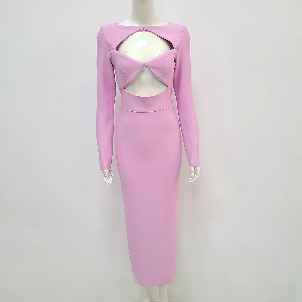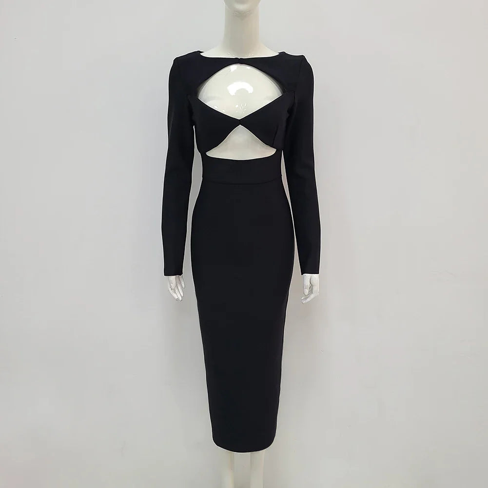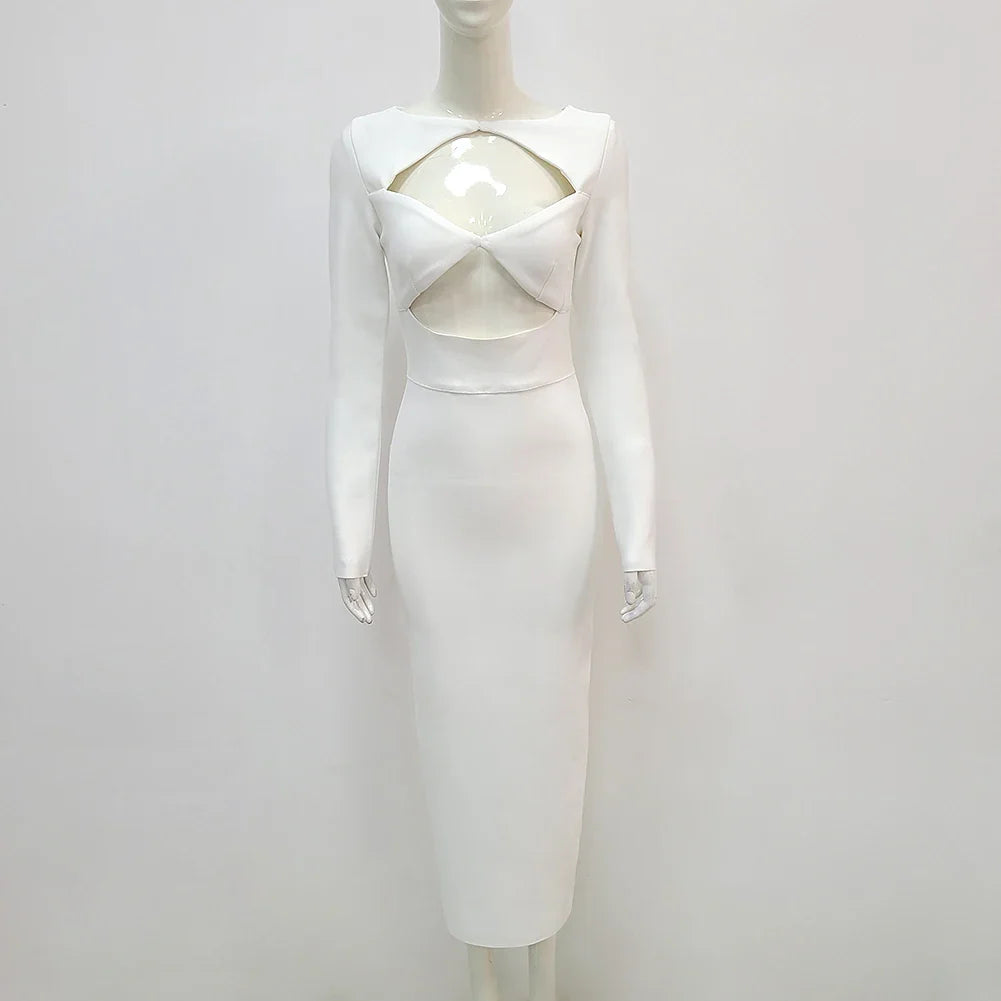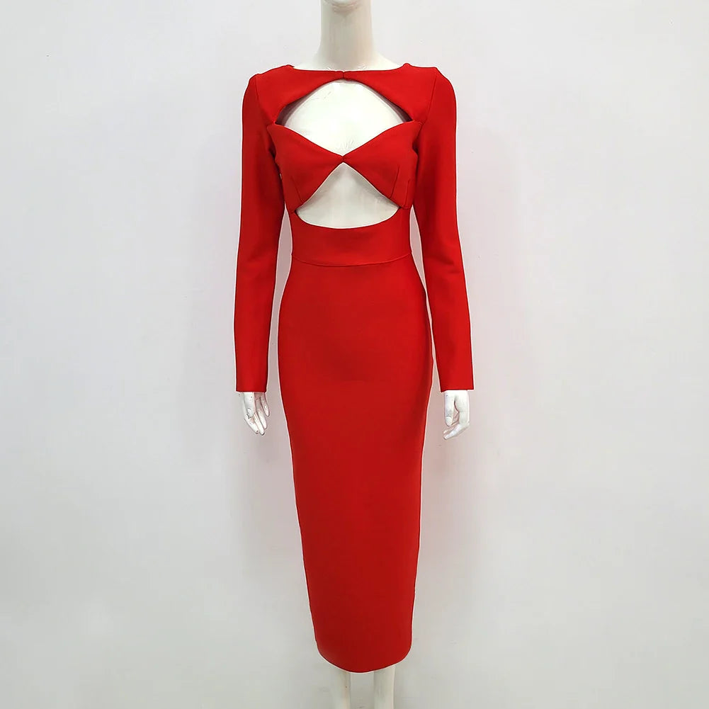 Experience timeless elegance with the Mariah Bandage Midi Dress. Crafted from luxuriously rich fabric. this classy dress is perfect for any special occasion. with its figure-hugging silhouette and tasteful design. Whether you're attending a cocktail party or a formal event. every eye is sure to be on you in this exquisite garment.