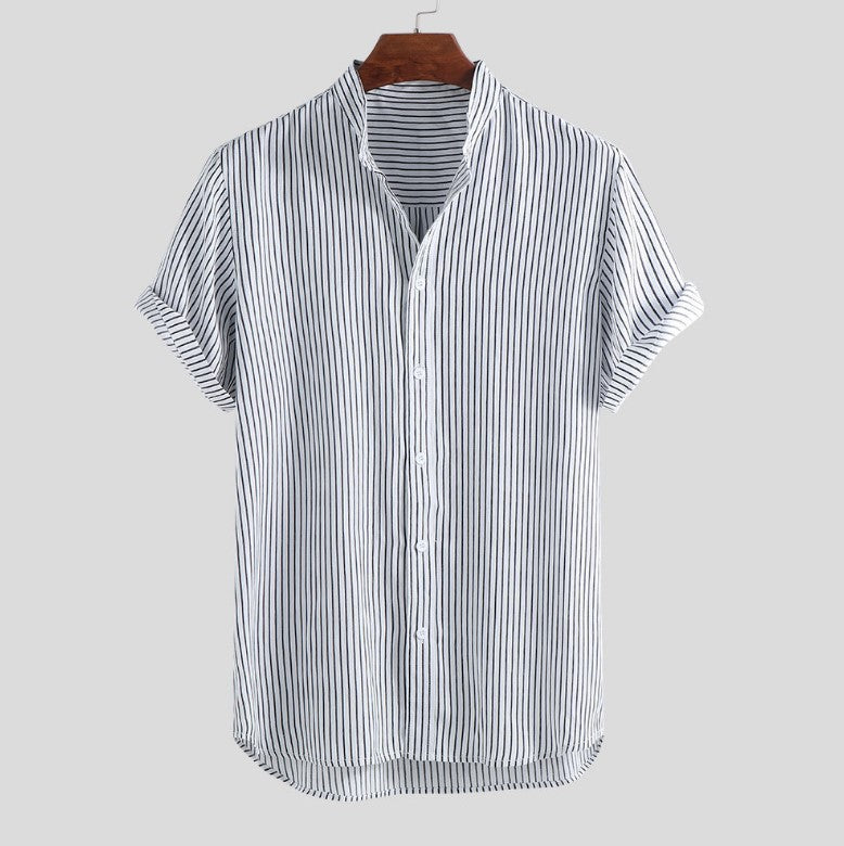The Stand Collar Striped Shirt is the perfect way to enjoy summer in your favorite beach town. Made from a lightweight and airy cotton. this shirt is perfect for those hot summer days.
