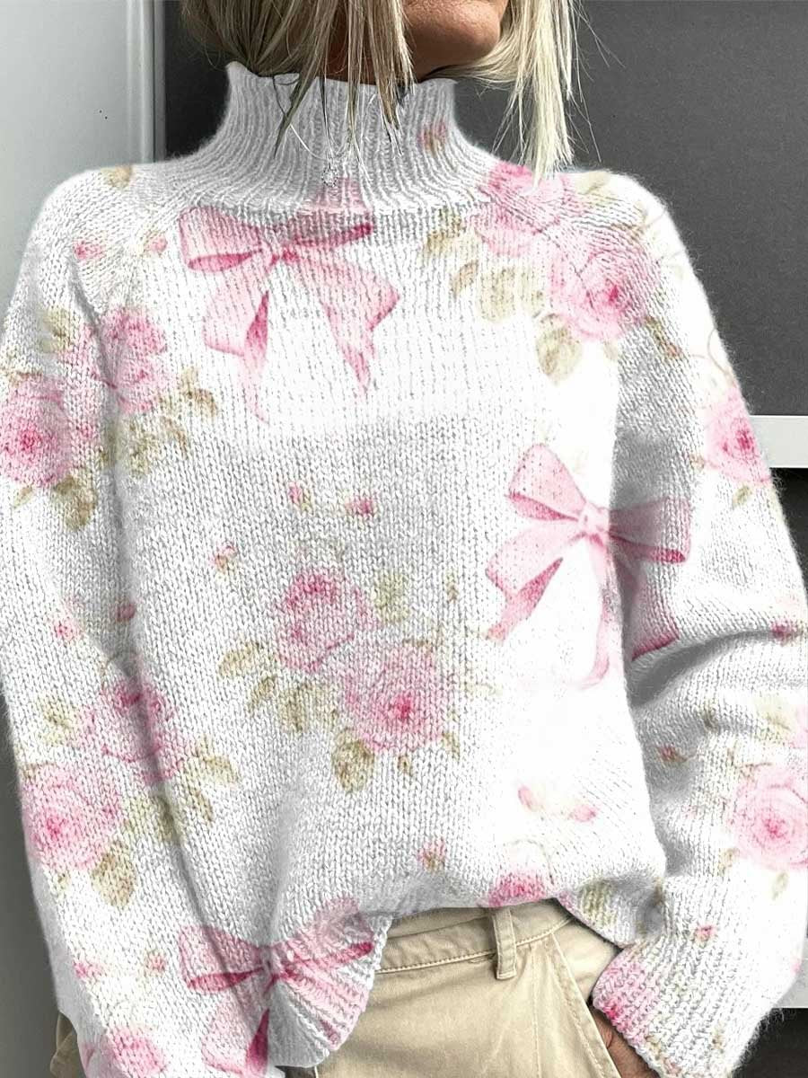 Merry Christmas Rosette Flowers Print Knit Turtleneck Pullover Sweater