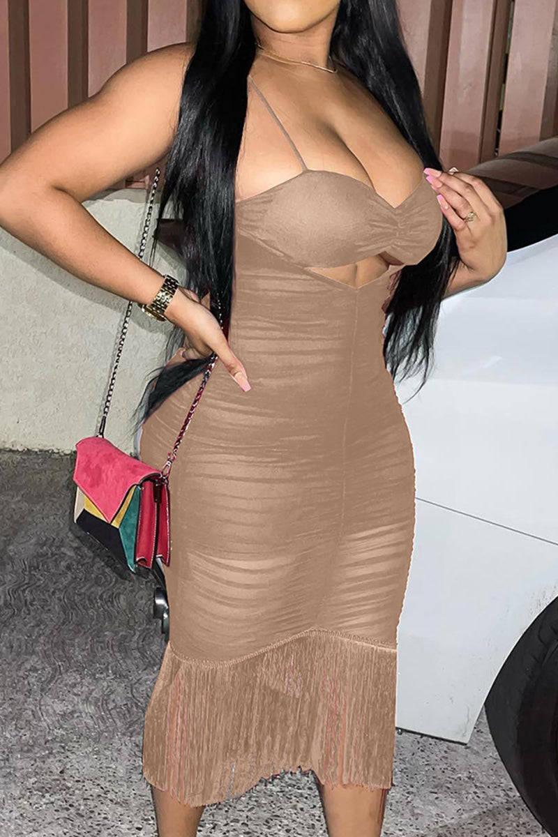 Mesh Insert Cut Out Fringe Trim Cami Dress