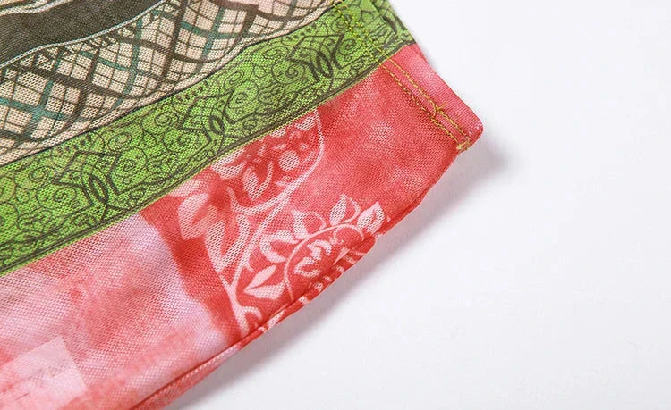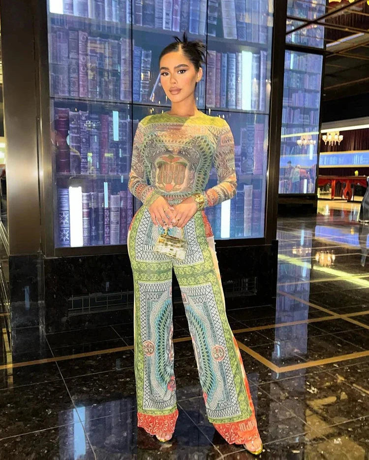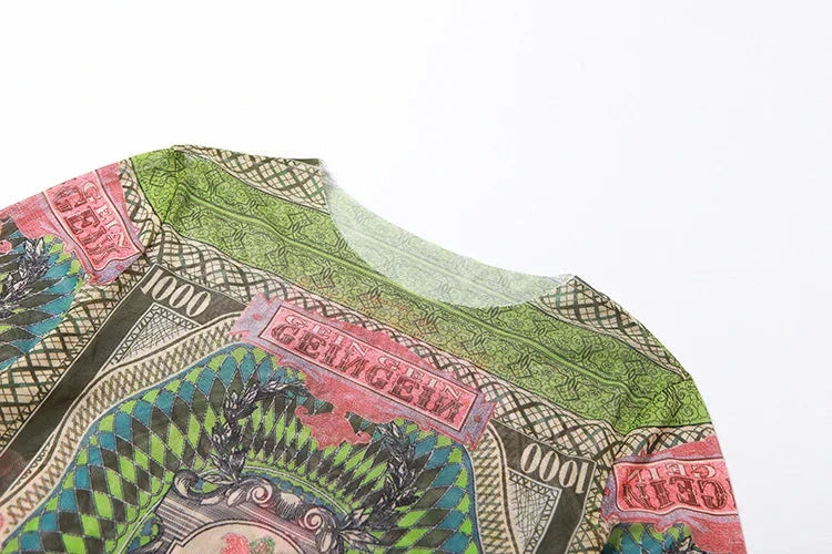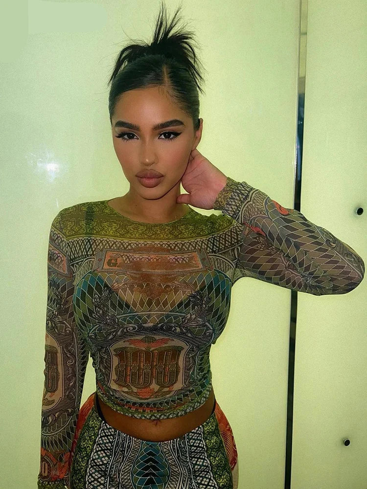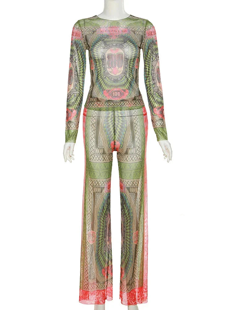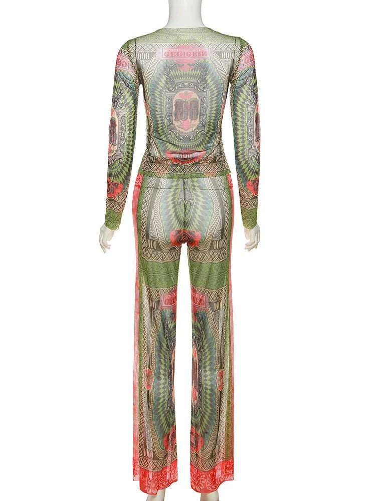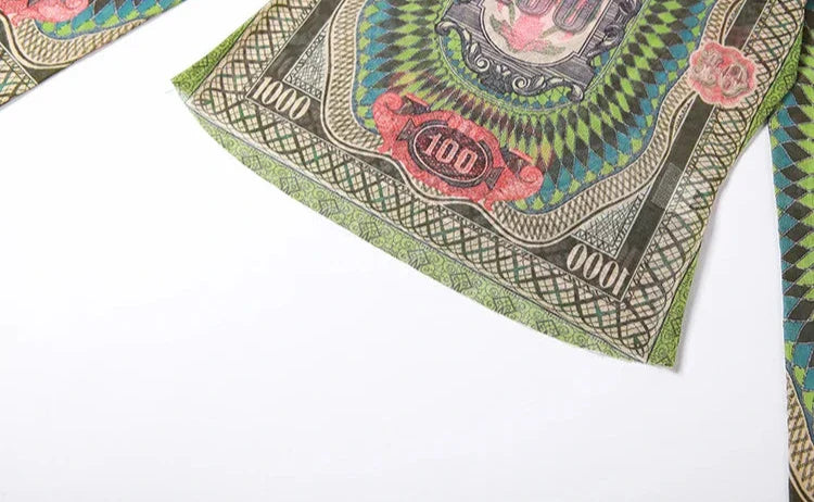 Elevate your weekend look with this Money Team Mesh Two Piece Set. Featuring a green multi color mesh stretch material with an all over money print design. long sleeve top. and matching high waisted wide leg pants. Team with heels and accessories for a vibe we are obsessed with.