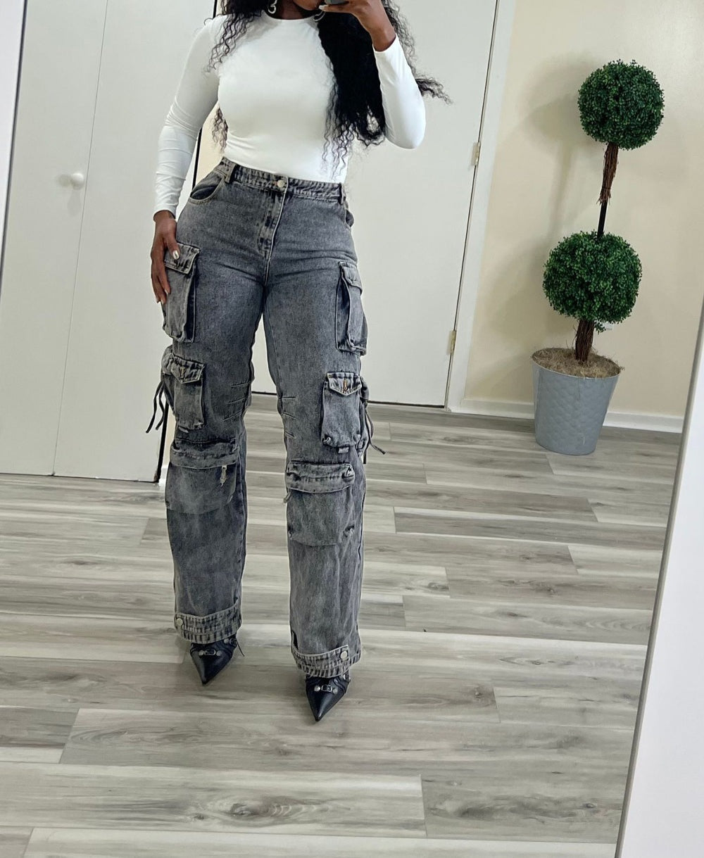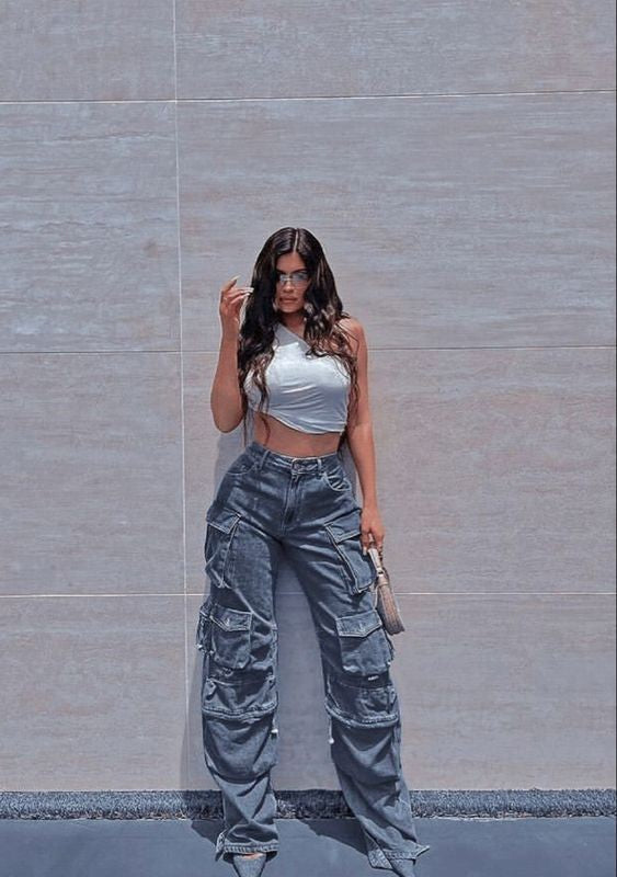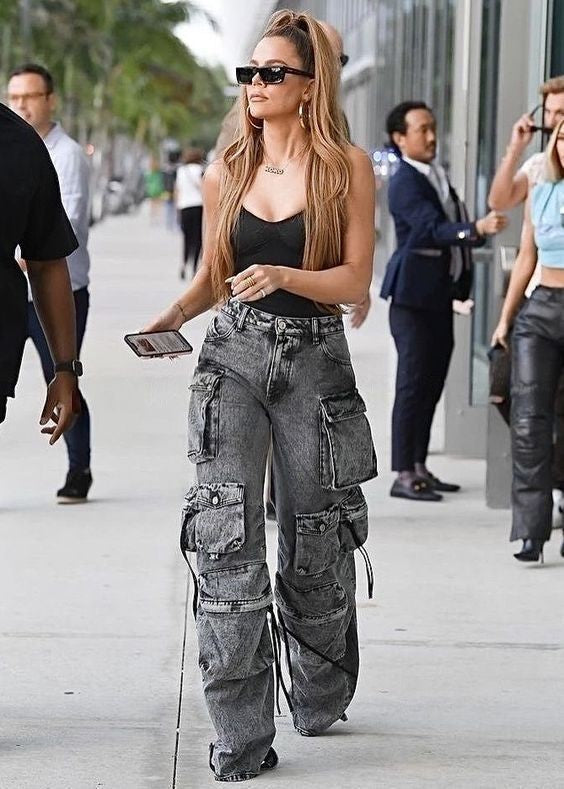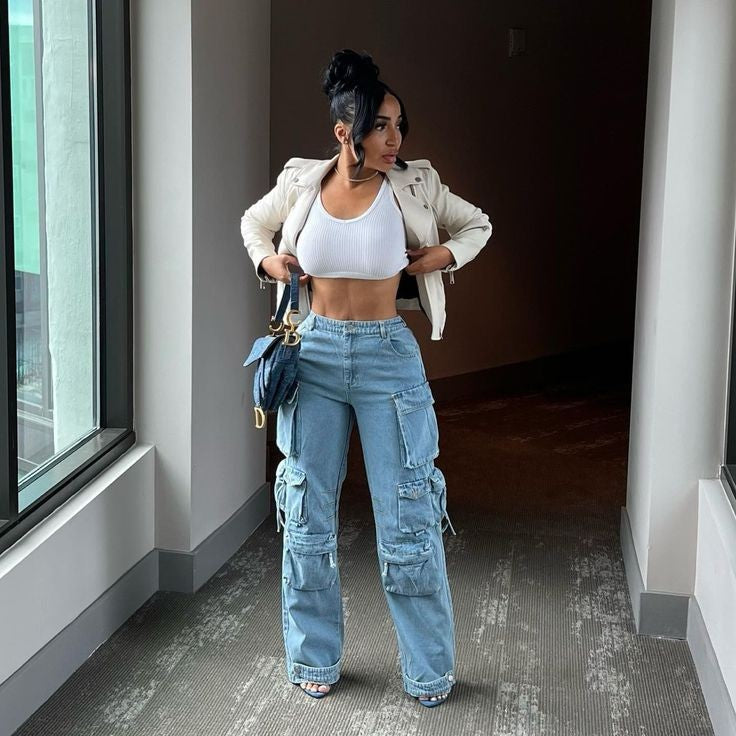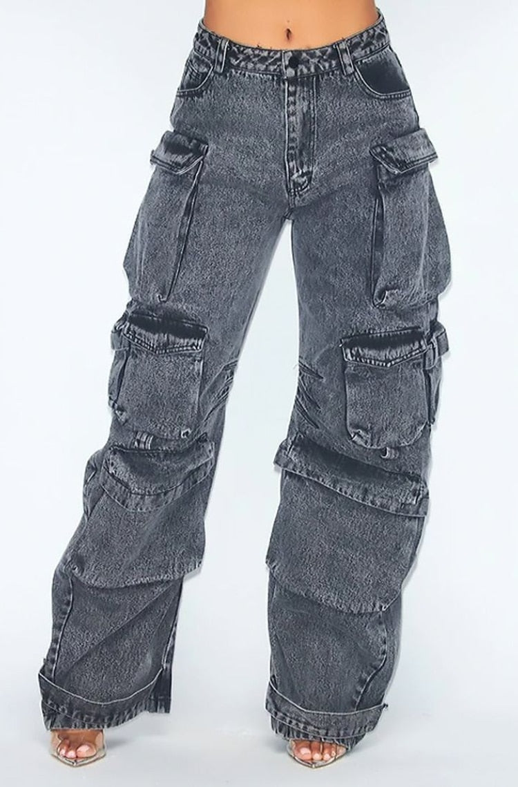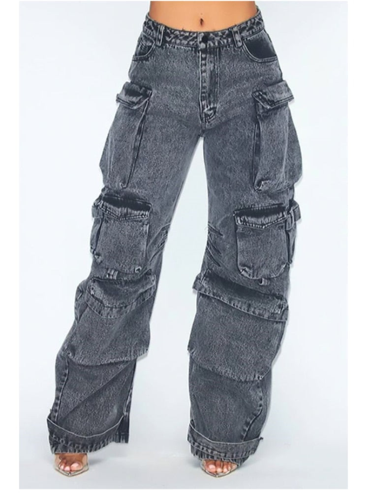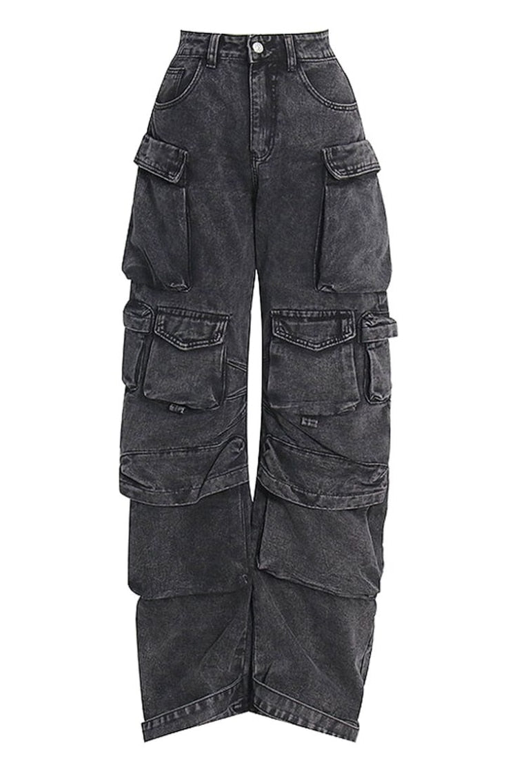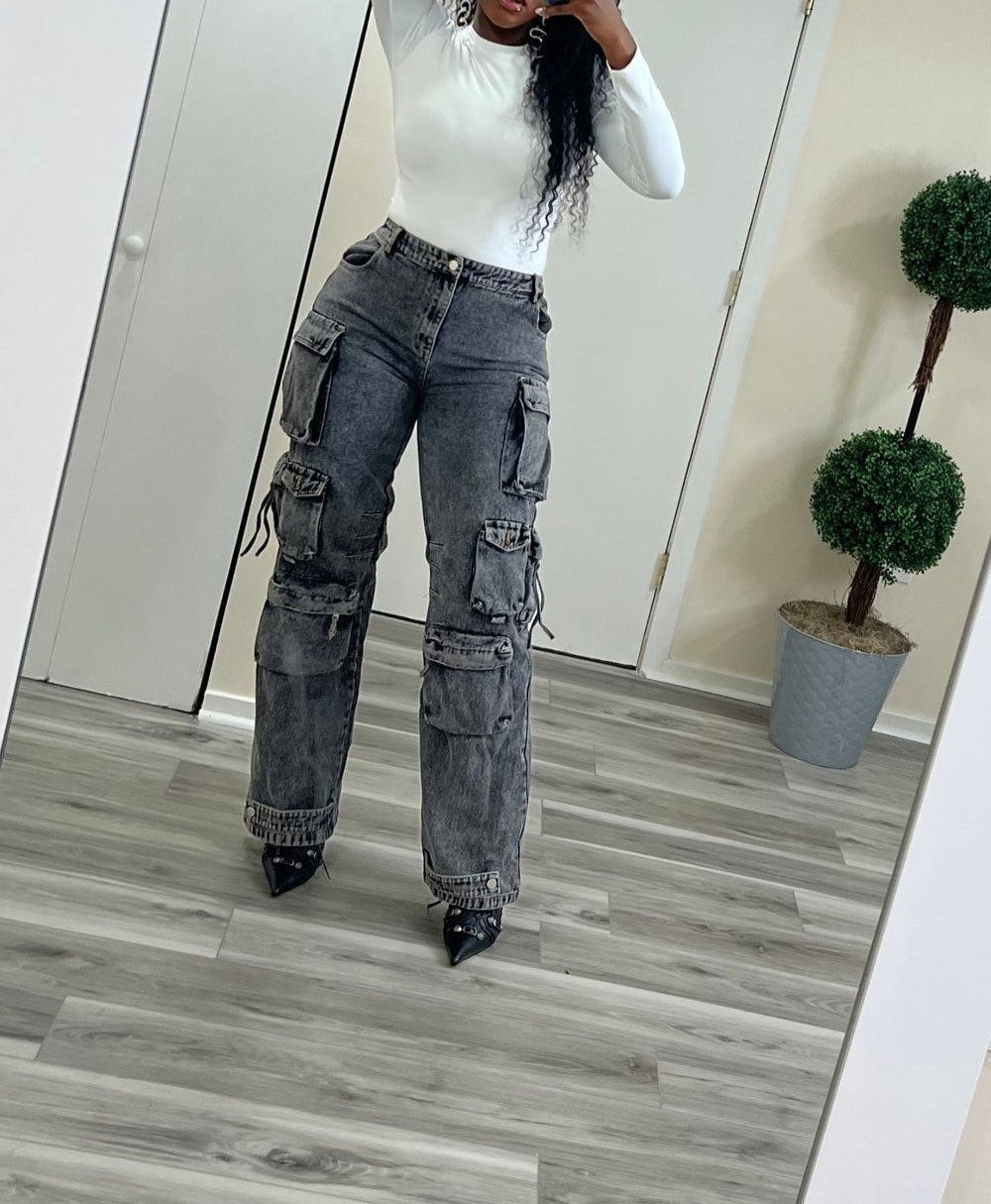 This stylish pair of cargo jeans feature multiple pockets offering ample storage for everyday items. Crafted from durable material. these jeans are designed to provide comfort and security on the go. Perfect for everyday wear. they offer a modern. professional look.