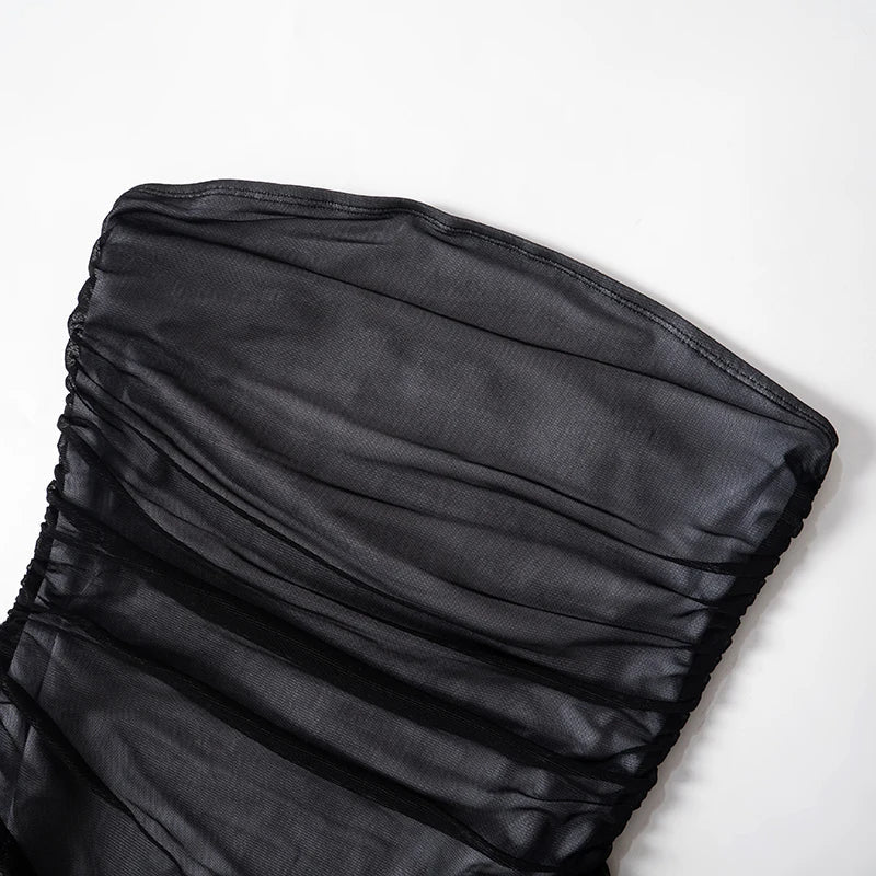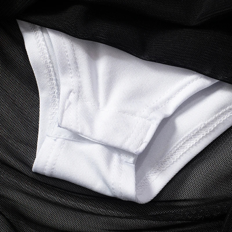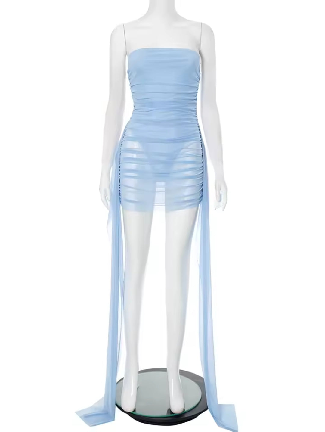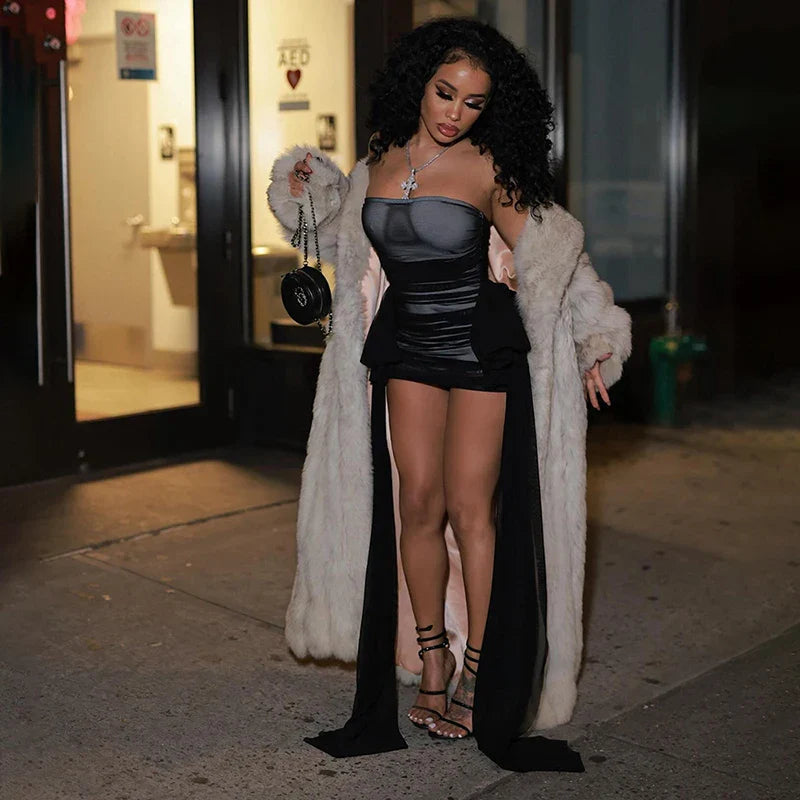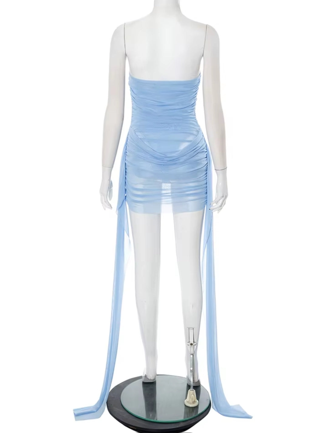 Please note: The yellow and blue versions of this dress feature an overhang with ruching at the back. enhancing the buttocks area. In contrast. the black. white. and red versions are designed with boned sides at the hips for added structure and shape.