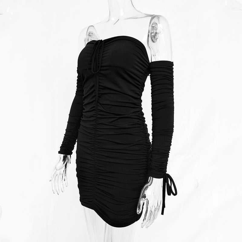 Off the shoulder long sleeve runched front bodycon dress is made out of cotton spandex material. This cute dress is super comfortable and comes with a bardot neckline. This dress stops above the knee.