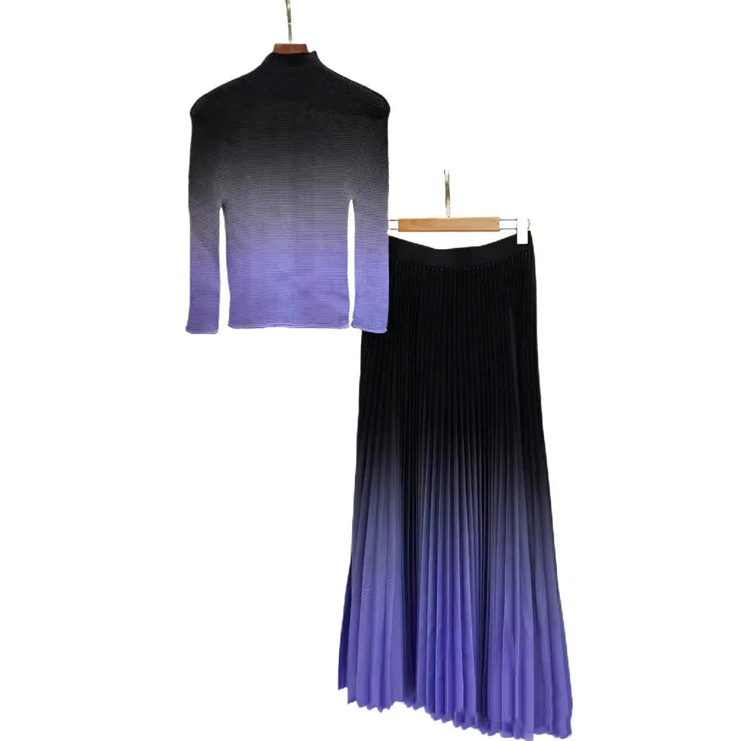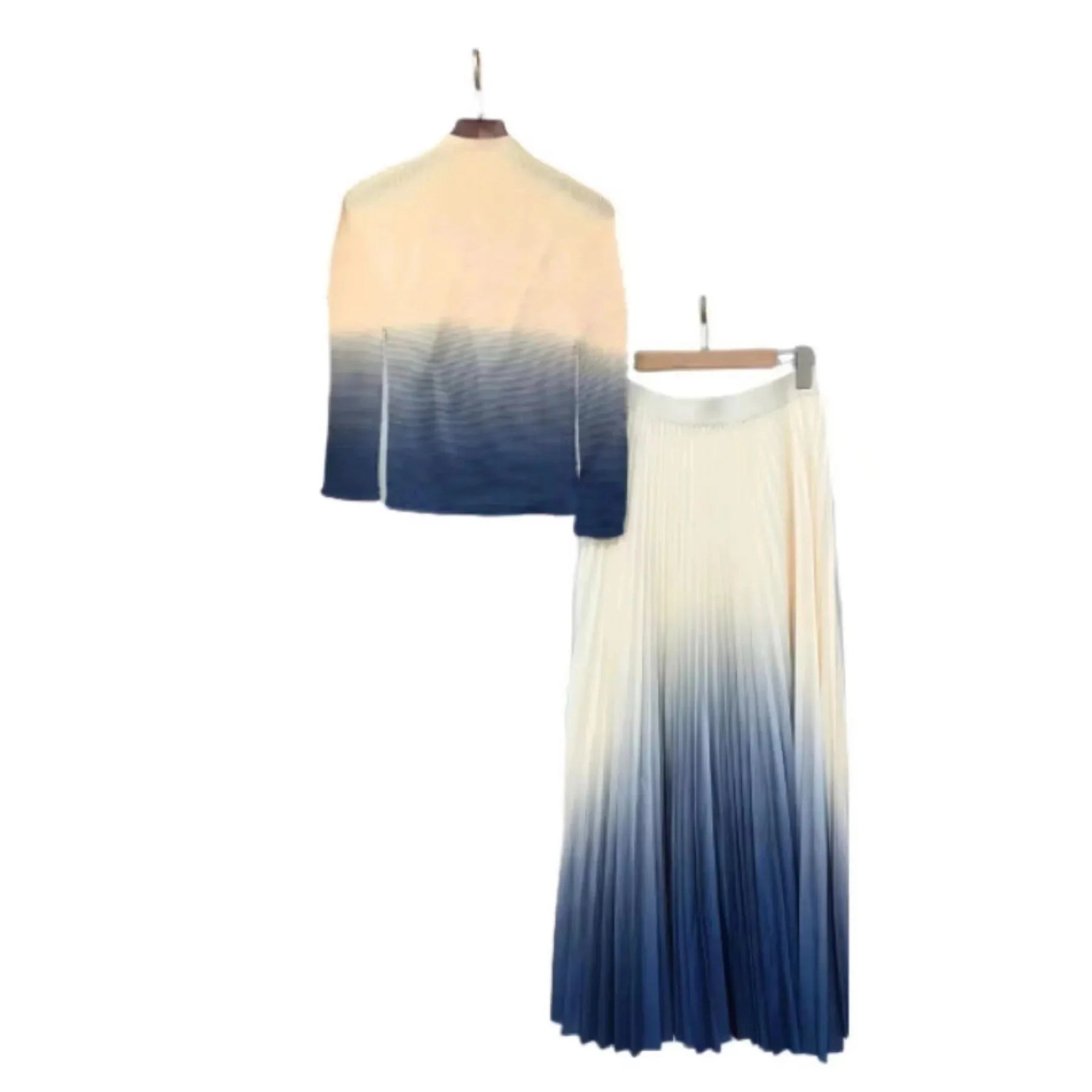 This Paris Gradient Pleated Skirt Set provides a timeless. classy look with its gradient pleated skirt and chic blouse. The pleats create a flattering silhouette and the fabric is comfortable and breathable. Perfect for any occasion.