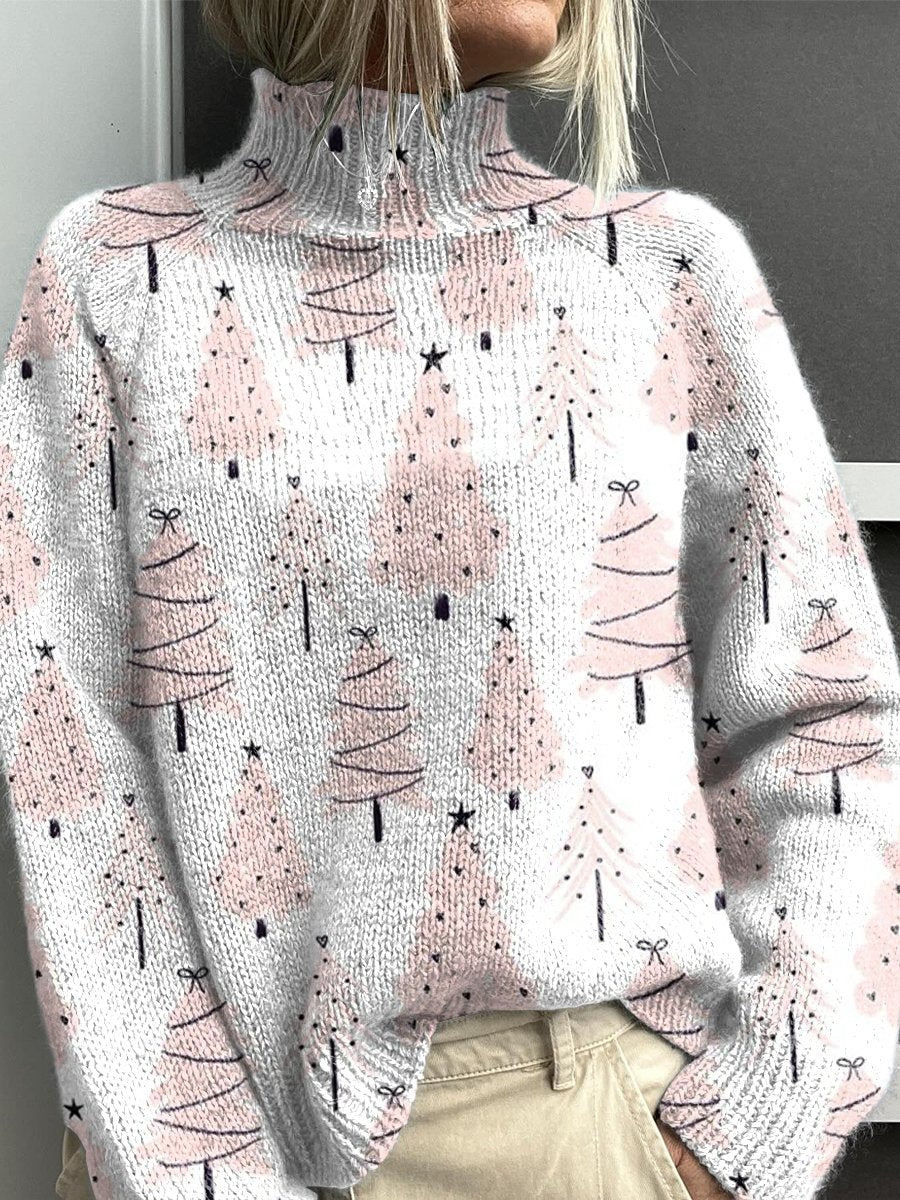 Pink Christmas Art Tree Print Knit Turtleneck Pullover Sweater
