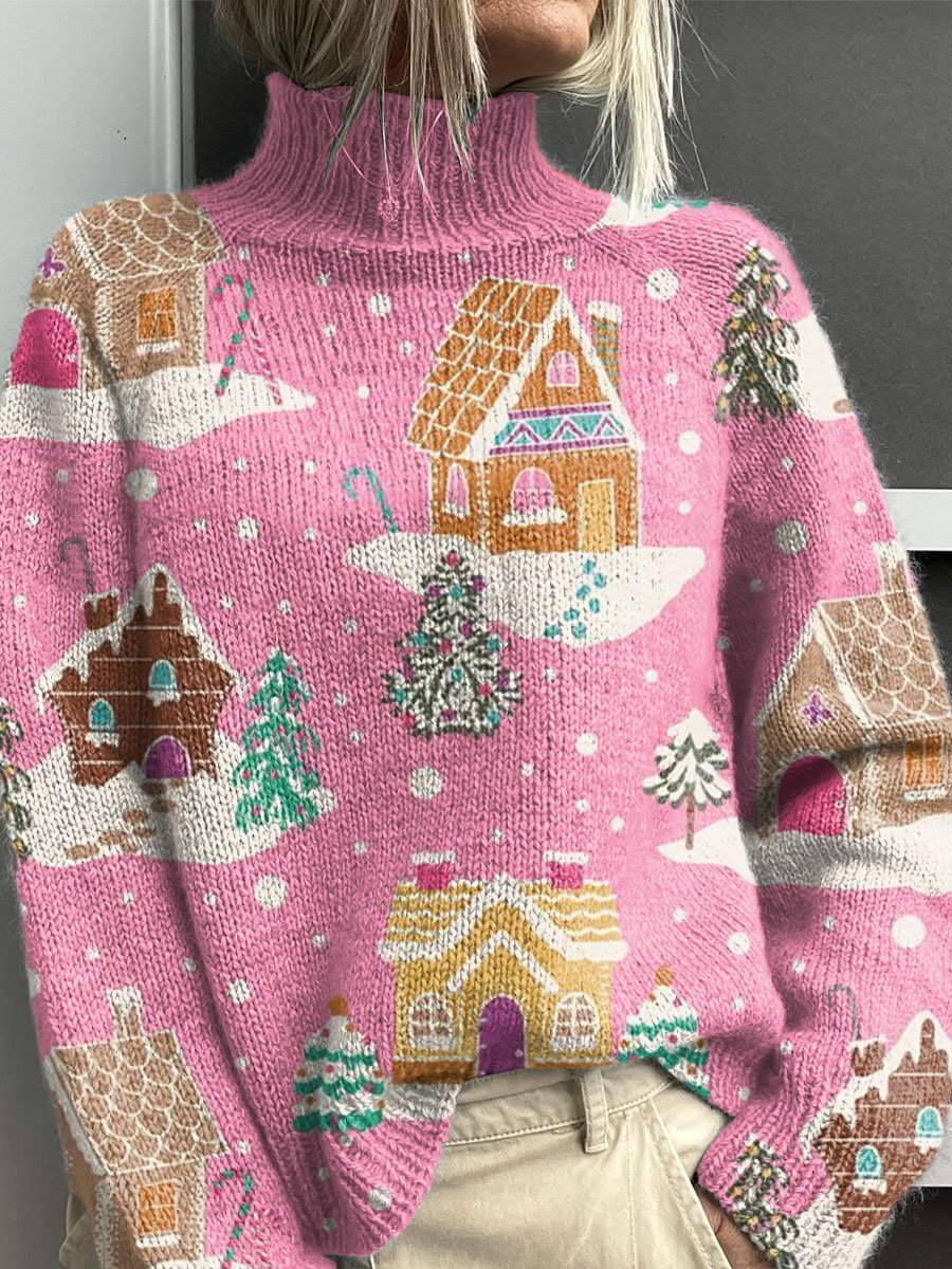 Pink Christmas Christmas Tree Pattern Art Print Knit Turtleneck Pullover Sweater