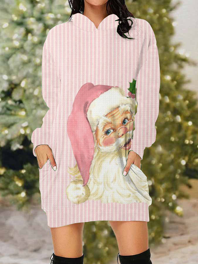 Pink Christmas Santa Claus Print Hooded Sweatshirt Dress