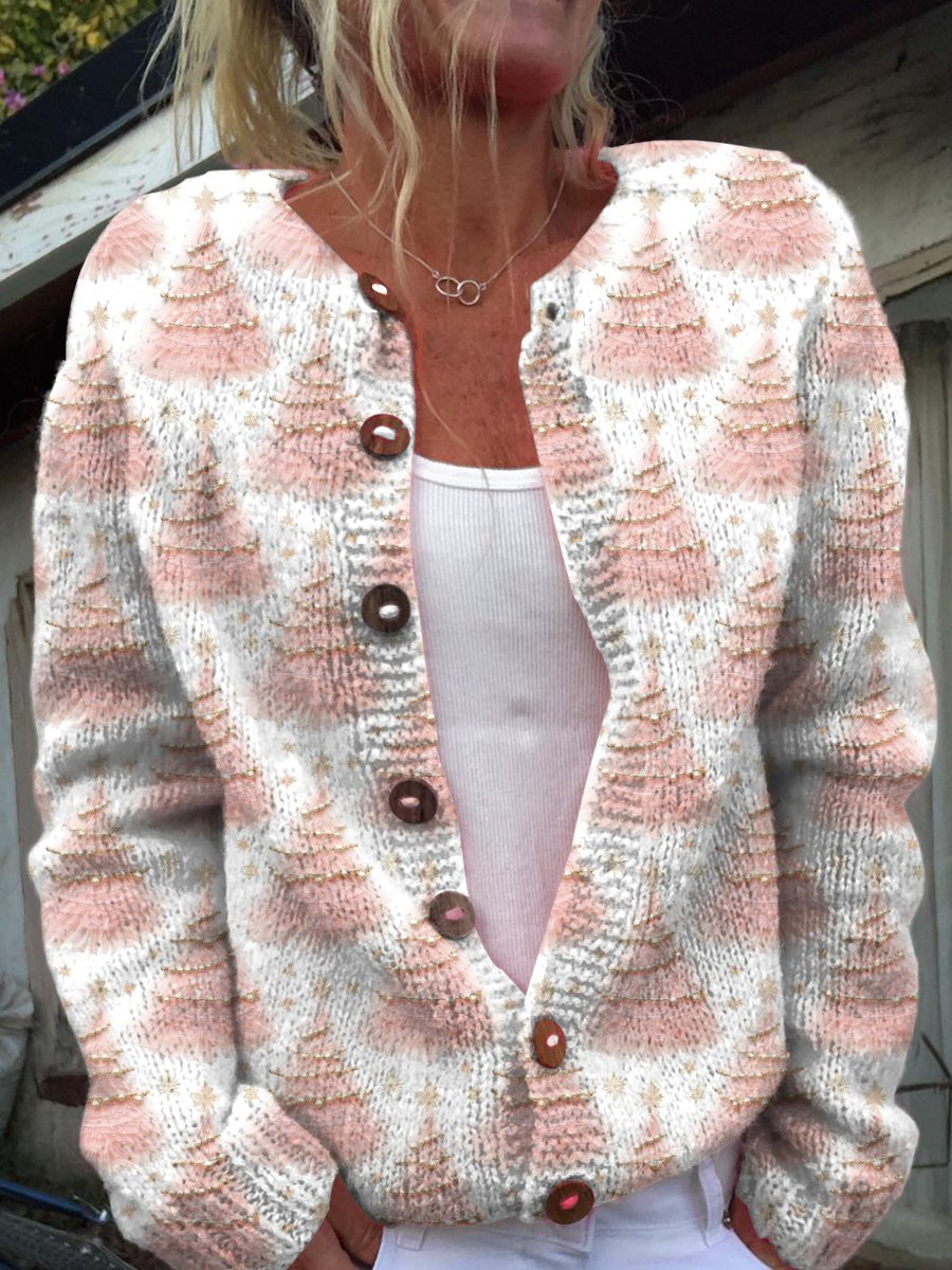 Pink Christmas Tree Print Buttoned Cardigan Sweater