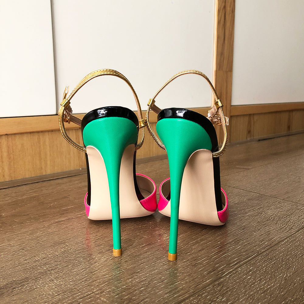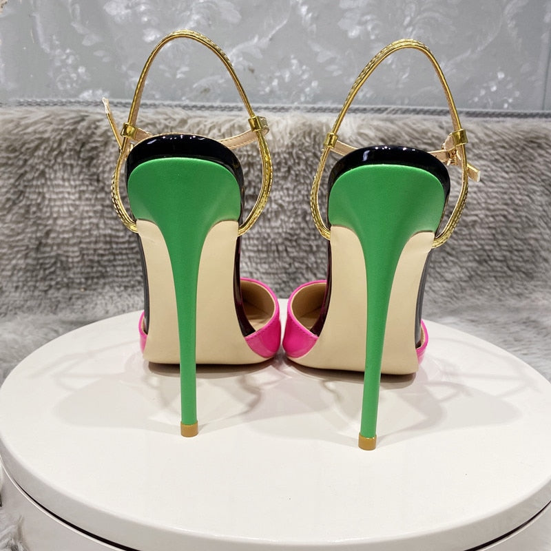 These Pink Fusion Stiletto Heels are at the top of our hit-list right now. Featuring a patent PU material with a gold ankle strap. and a green skinny heel. we are obsessed. Team these with jeans for a look we're loving.