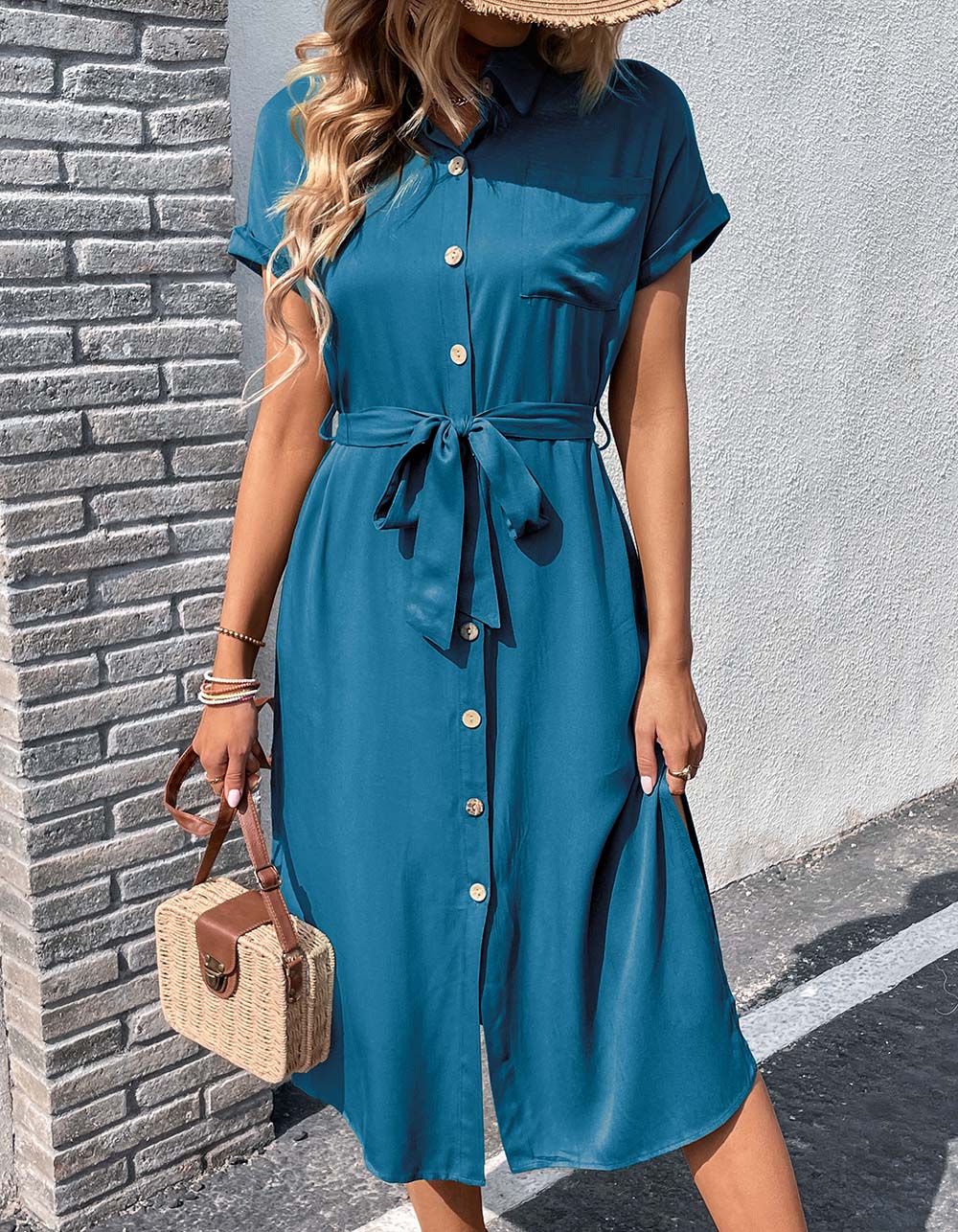 This versatile and comfortable Plain Lapel Button Front Belted Pocket Slits Long Dress features a high-waisted fit. lapel neckline. short batwing sleeves and ruffle hem. Crafted from viscose with slight stretch. the dress also has a button front. belted waist and side pockets for effortless styling. Choose from timeless Green and Blue hues for a chic. elegant look.