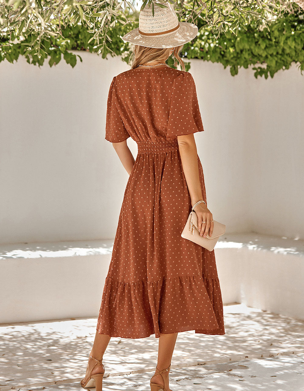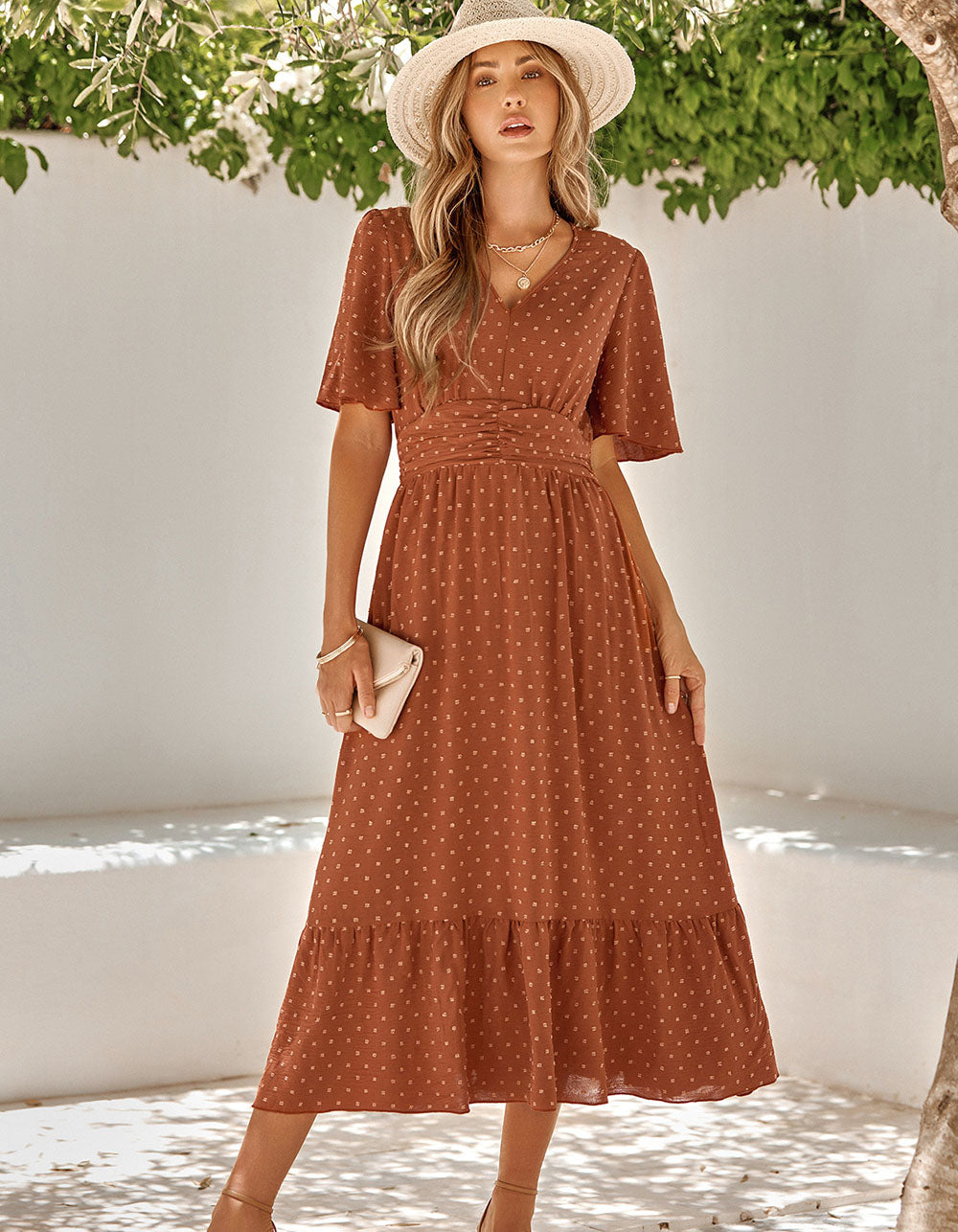 This stylish A-Line dress features a flattering V-neckline. short flounce sleeve and an elegant mid-waist silhouette. crafted from a lightweight yet durable polyester fabric. The dress is adorned with pleated ruffle detailing and comes in almond. green. and red color options. Perfect for both casual and formal occasions.