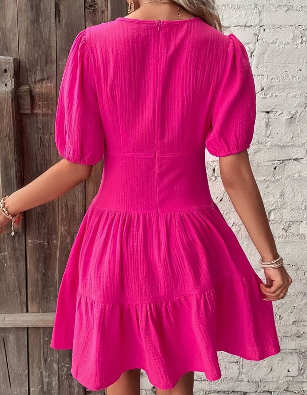 Make an elegant statement in this Plain Solid-color Slim Fit High Waist V-Neck Short A-Line Dress. The classic pink dress features a flattering puff sleeve. a high waist for an elongated figure. and a ruffled hem for a feminine touch. The polyester fabrication and slim fit ensures a comfortable fit and ensures it won't stretch. Make it your stylish go-to!
