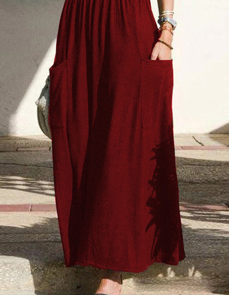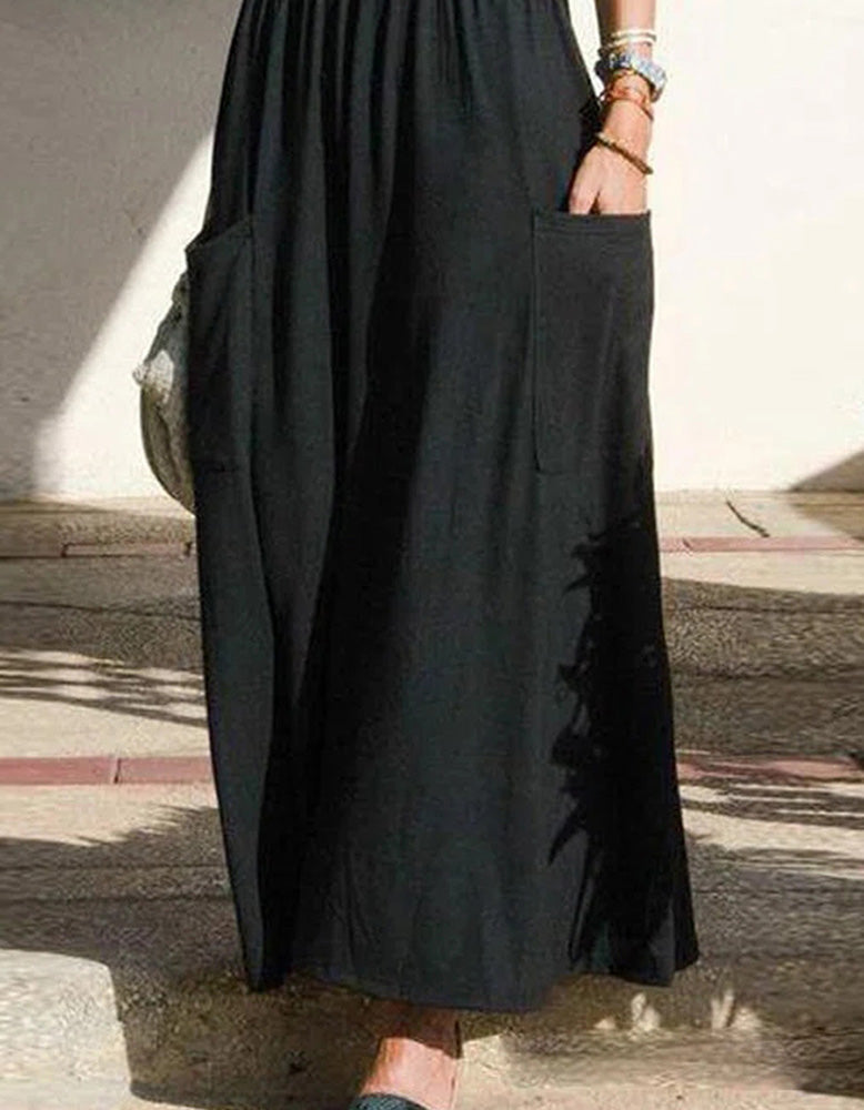 This Plain Strap Pocket Pleated Long A Line Dress features cheerful colors and elegant. casual style that adds an effortless charm to any wardrobe. Its pleated details and pocket accents add a touch of visual depth to the solid-color. plain design. Crafted from high-stretch Polyester fabric. this sleeveless dress features midi waist. ruffle hem. and fitted design for a flattering and comfortable fit.