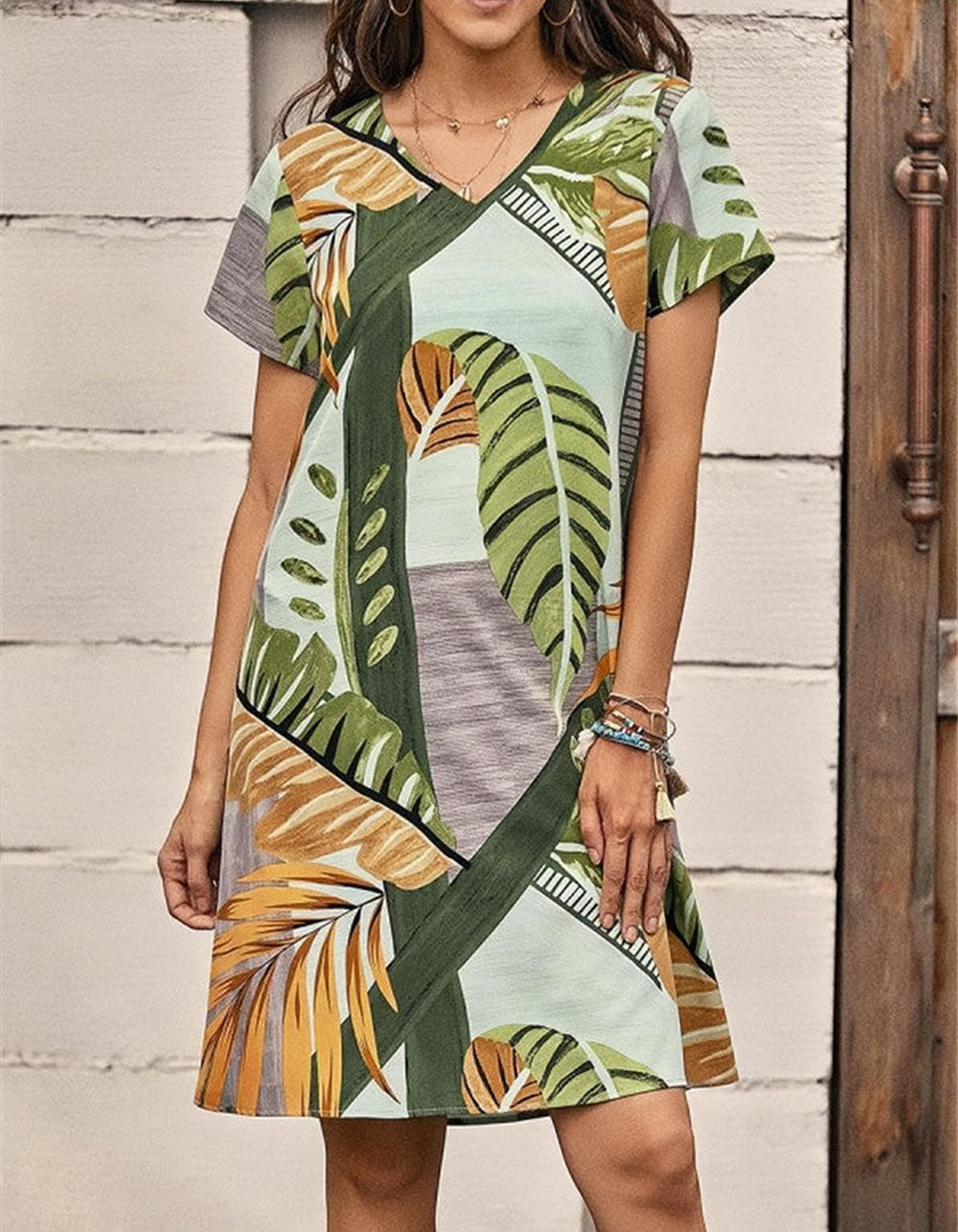 This Plants Printed V Neck Short Sleeve Short A-Line Dress is the perfect combination of style and comfort. It is made of lightweight polyester fabric and features a cute. lively print and V-neck style. The loose waist with a ruffle hemline creates an additional flowy silhouette. The fit is perfect and the regular sleeves provide all-day comfort.
