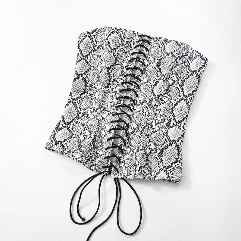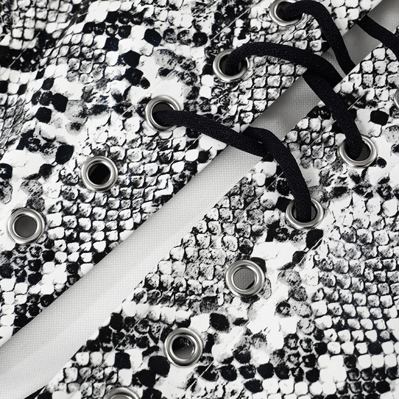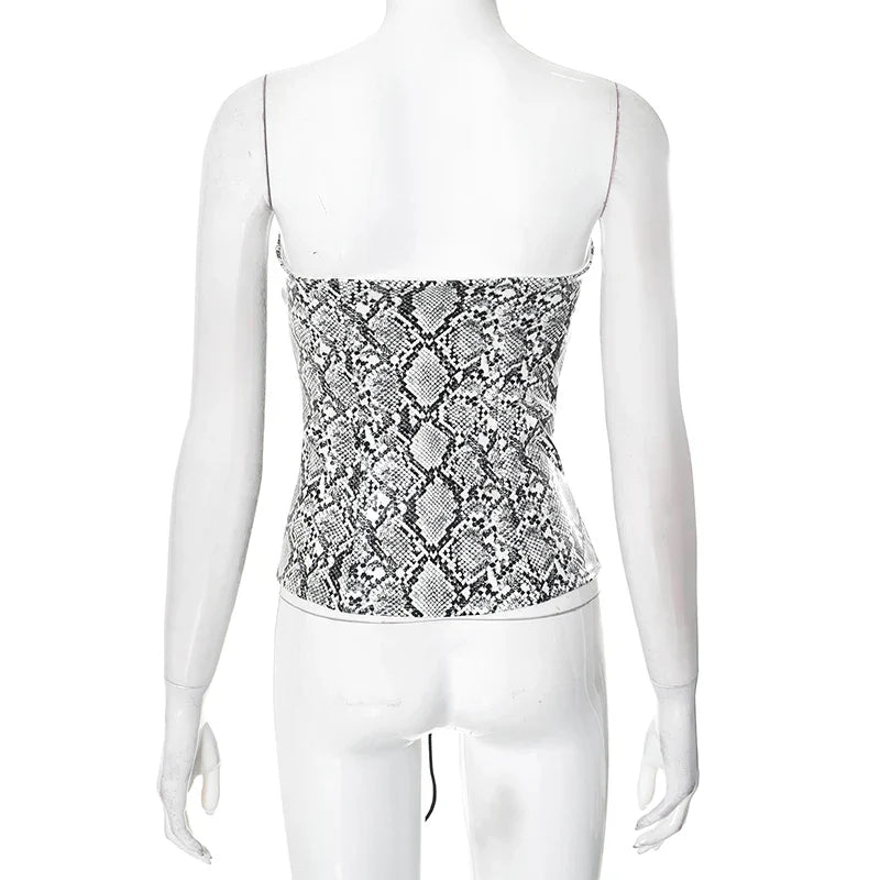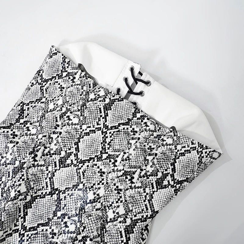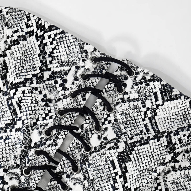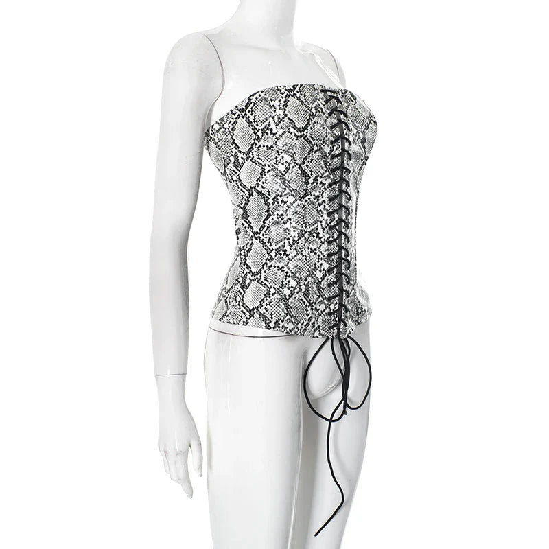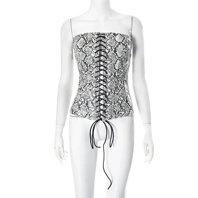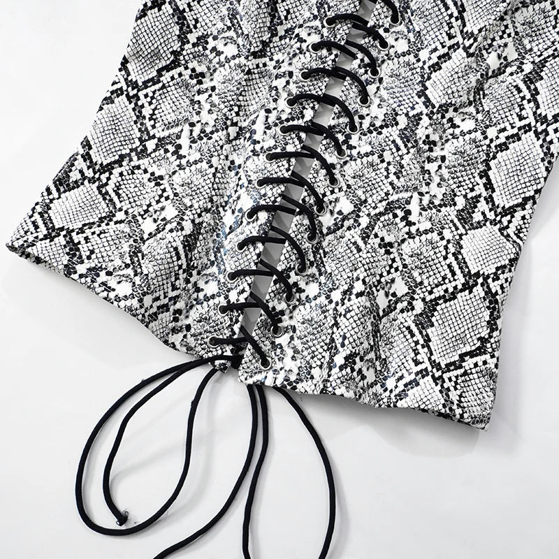 Take your weekend wardrobe to a whole new level with this No Intro Needed Snake Print Lace Up Top. Its white printed snake material adds an extra edge to your look while its lace-up fastening gives you that glam touch. Pair with tailored pants. clear heels. and accessories for a vibe that won't go unnoticed.