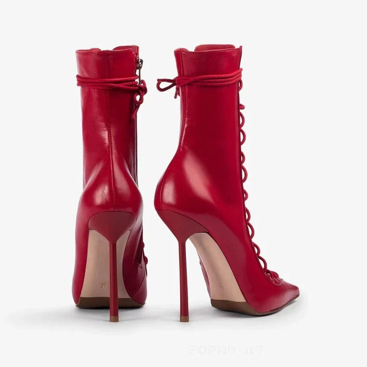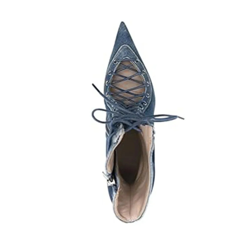 Elevate your after-dark aesthetic with these Pointed In The Right Direction Ankle Boot Heels. a lesson in contemporary styling. The sleek silhouette is crafted from a high-shine or denim patent PU material. extending into a pointed toe lace up design that flatters the leg. Wear yours with tailored pants for a sharp. modern take.