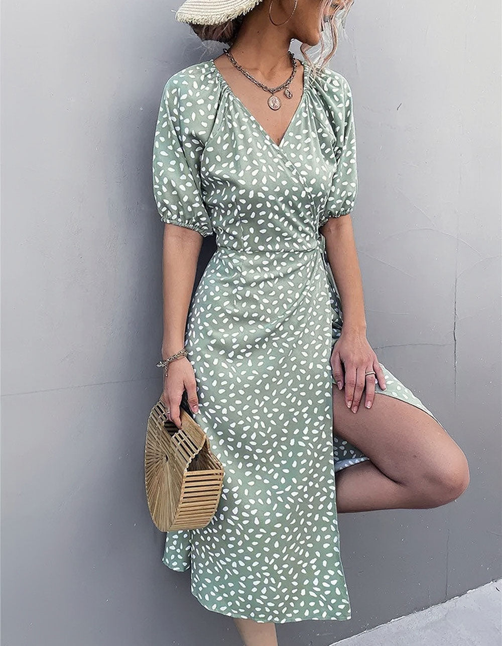 This elegant midi dress is perfect for any occasion. With a V-neck. puff sleeves. and a high waist line. it echoes classic feminine style while its ruffle hem and slits add modern touches. Crafted from polyester with slight stretch. this dress has a timeless polka dot print with your choice of green. black. and white colors.