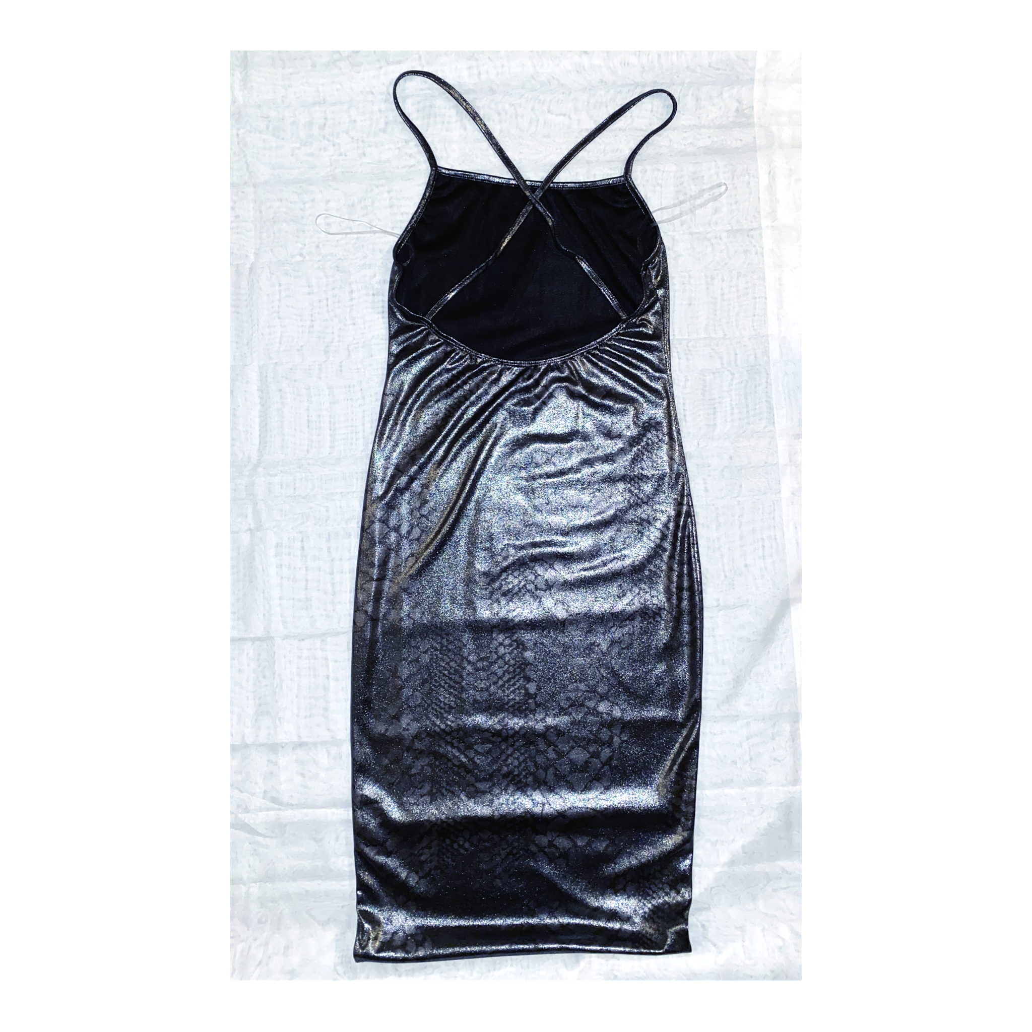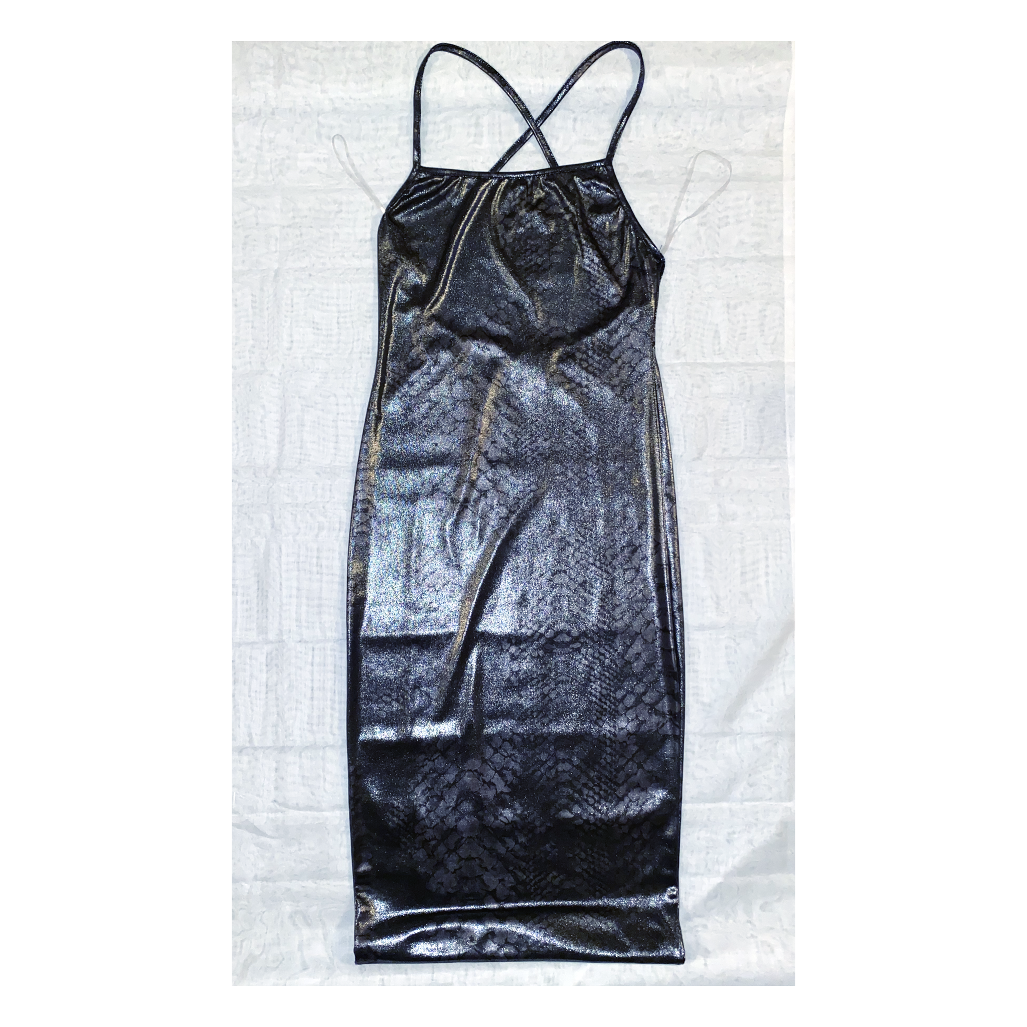 This is a metallic dress with straps that cross in the back. This dress is fitted and typically stops over the knee. The material is spandex material making the fitting super comfortable.