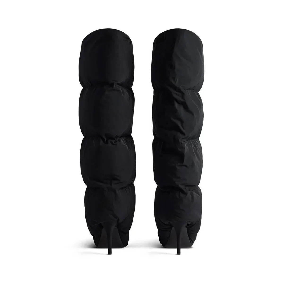 Channel all the fierce vibes into your new season wardrobe with these Black Puffer Coat Boot Heels. get ready to bring all the attitude to your look. These boots are made with a black puffer material with a pointed toe design and a knee-high style. how could you not be in love? Team with your favorite weekend fit for a look that can't be matched.