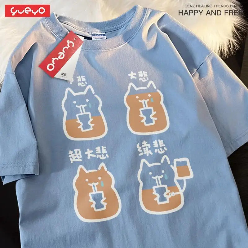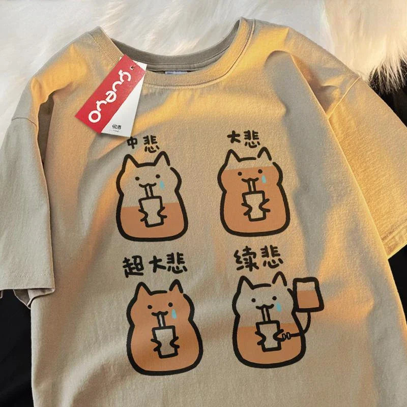Indulge in the ultimate feline fashion statement with this adorable Super Large Cup Sad Cat Spring Cat Coffee Shoulder Drop Short Sleeve T-shirt.