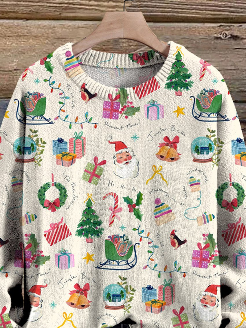 Retro Watercolor Christmas Pattern Printed Knit Pullover Sweater