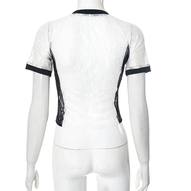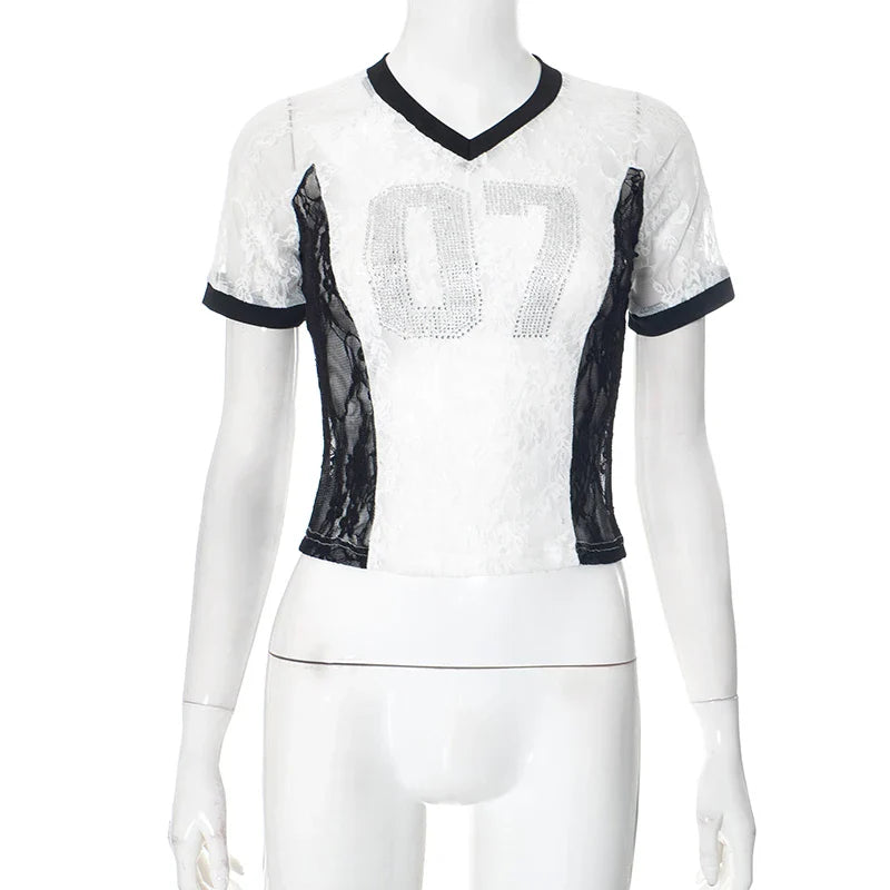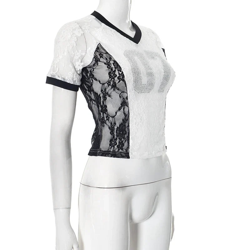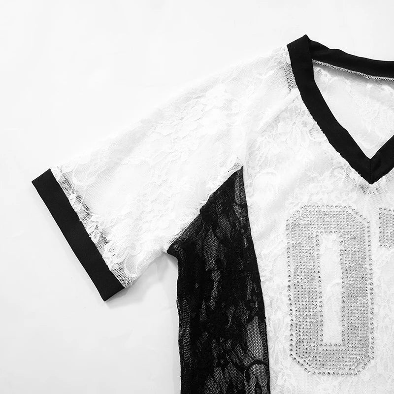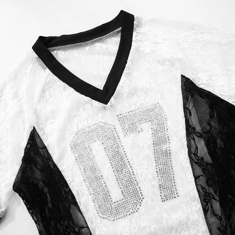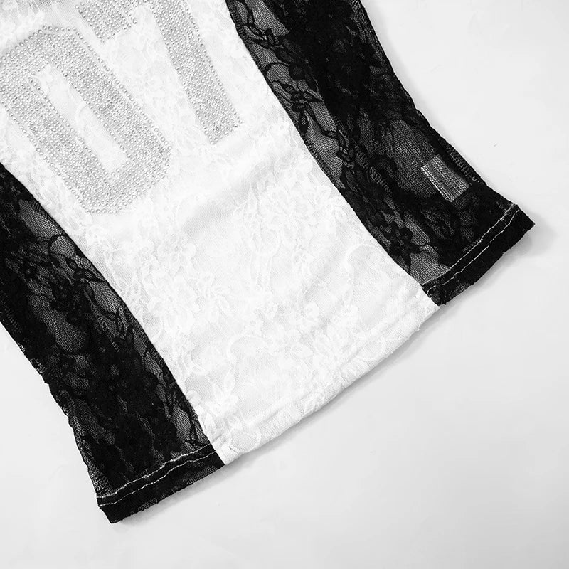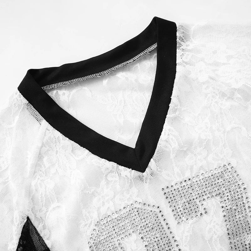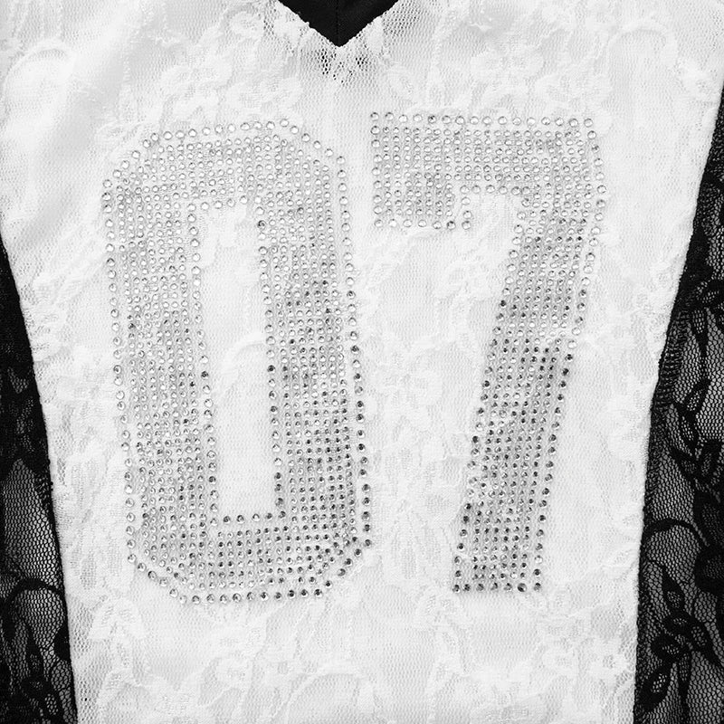 Switch up your weekend style game with this Rhinestone Seven Lace Top. Brought to you in a white hue lace material with a rhinestone detailing for that extra touch of luxe. how can you resist? Style this top with our ruffle mini shorts and heels for a weekend-worthy look that will really make a statement.