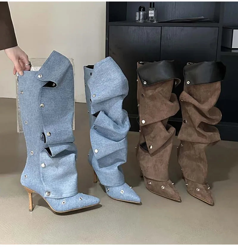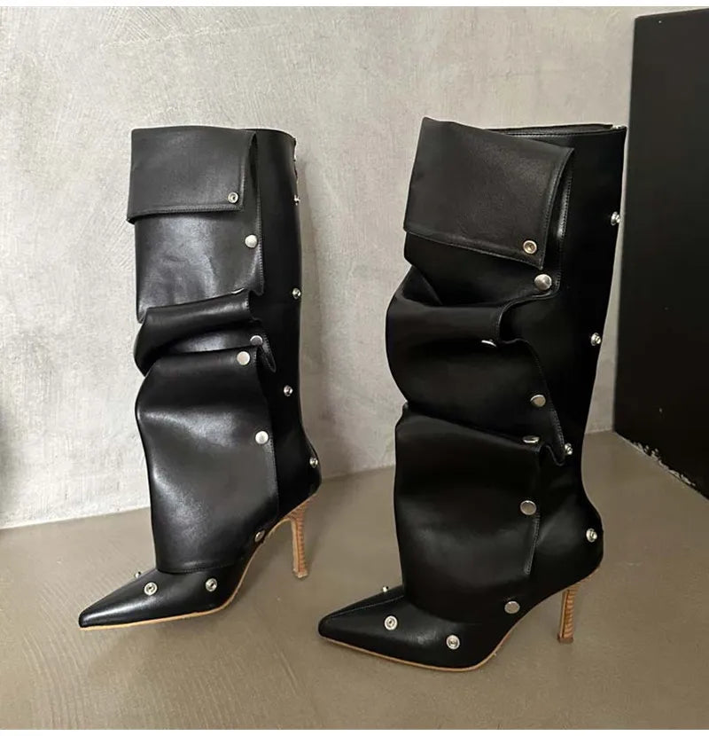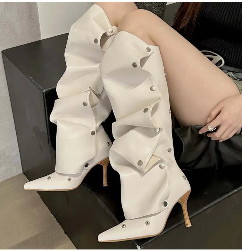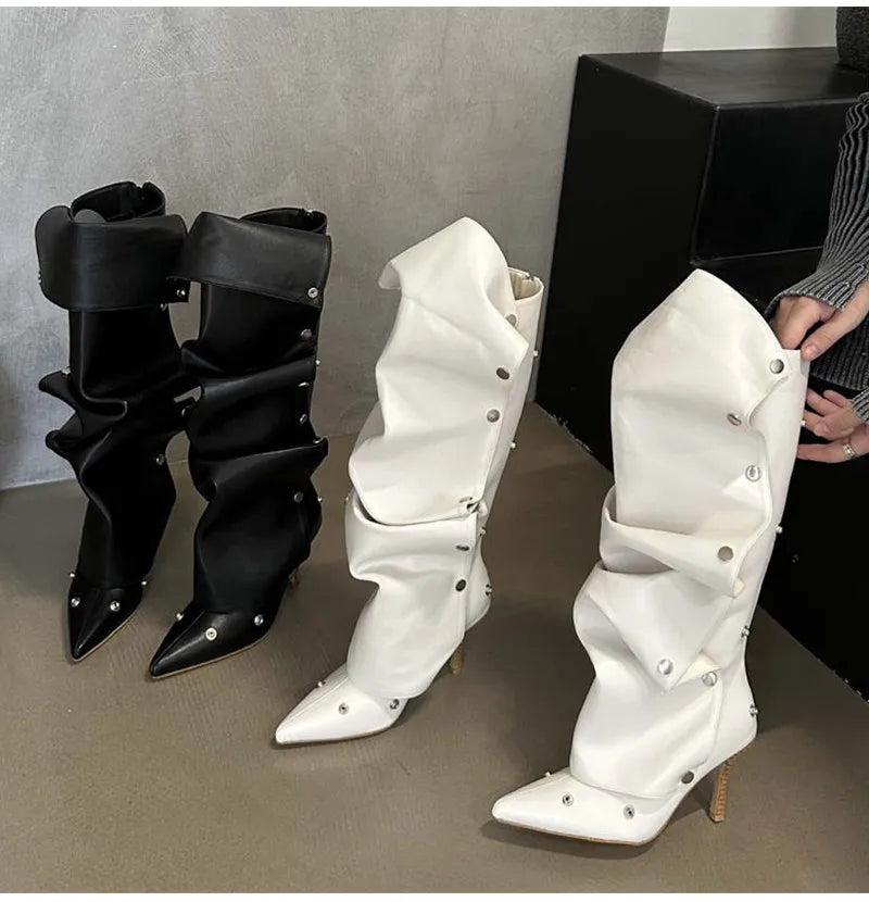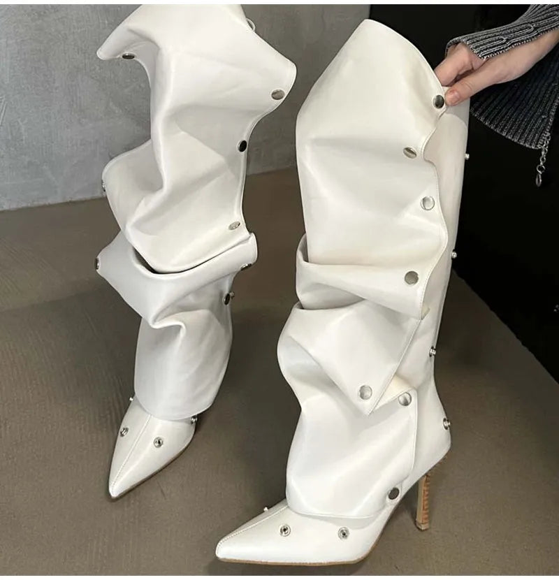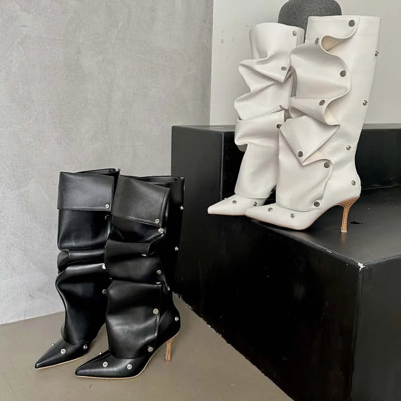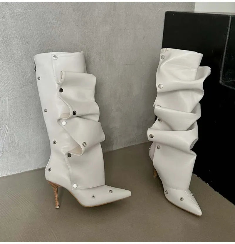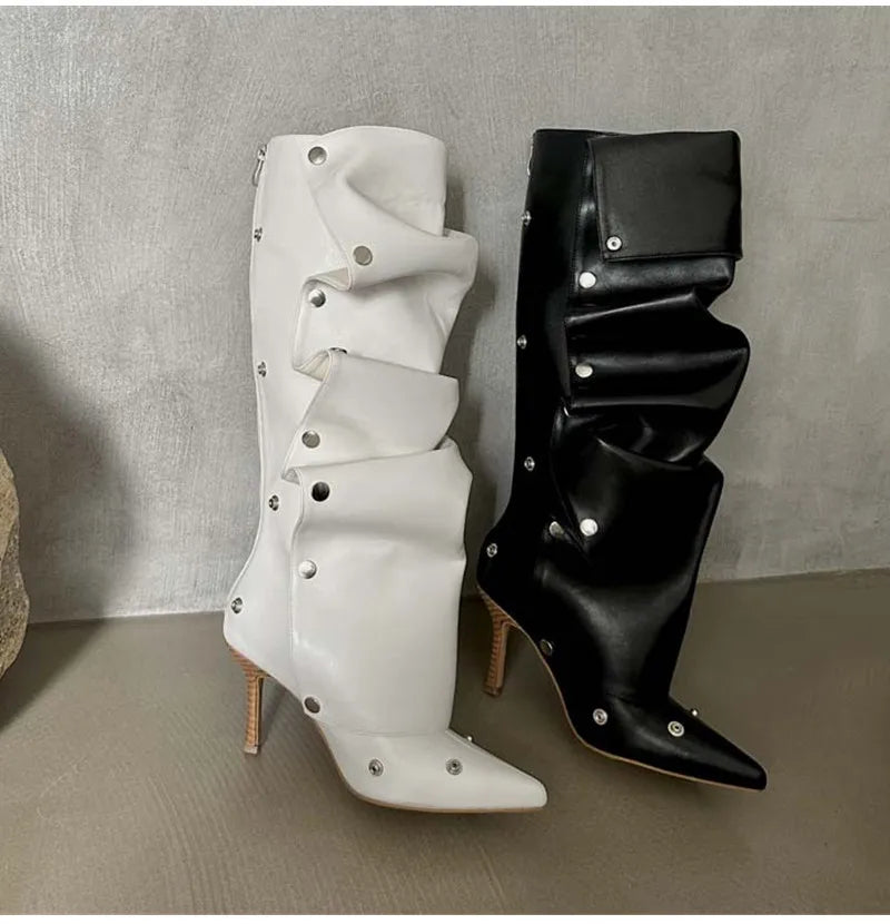 Experience the latest trend with our Rivet Button Pleated Knee-High Boots. Featuring a sophisticated design and luxurious pleated detailing. these boots are perfect for making a statement. Elevate your style and step into the world of high fashion with these must-have boots.