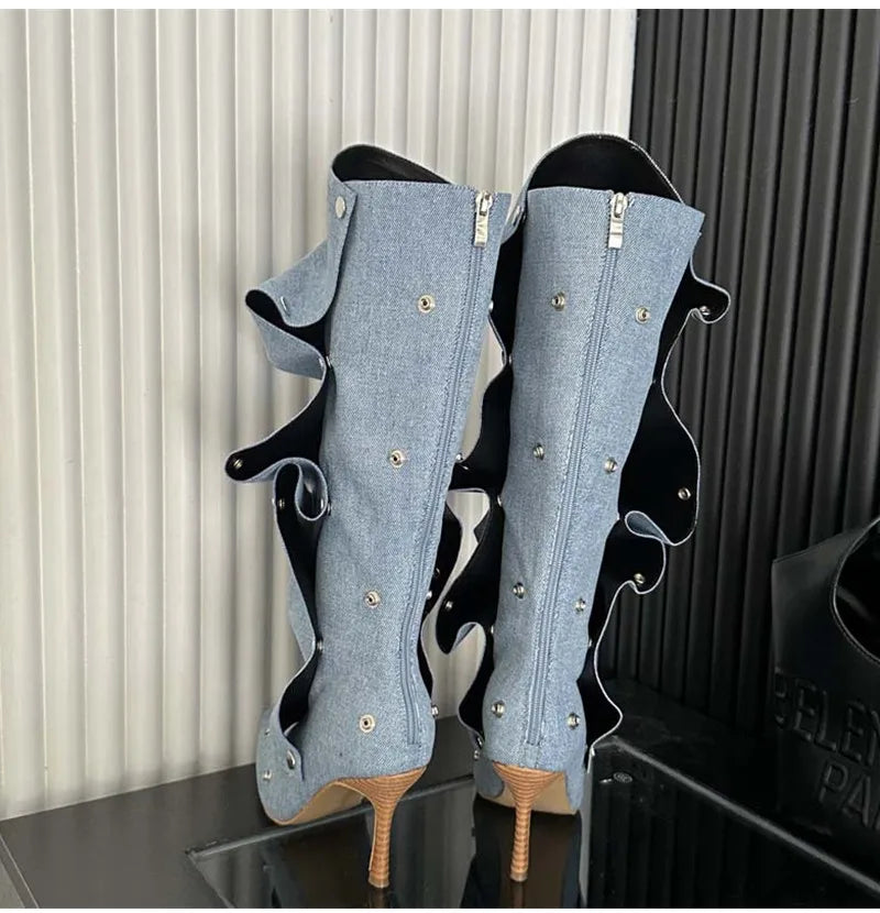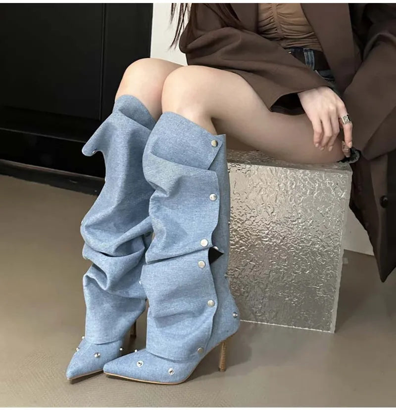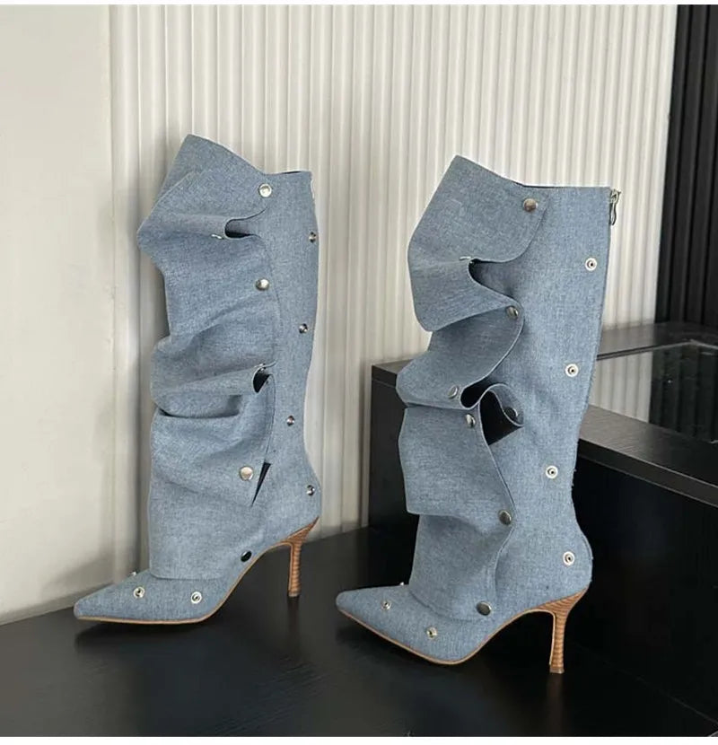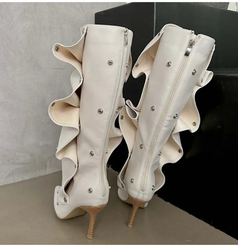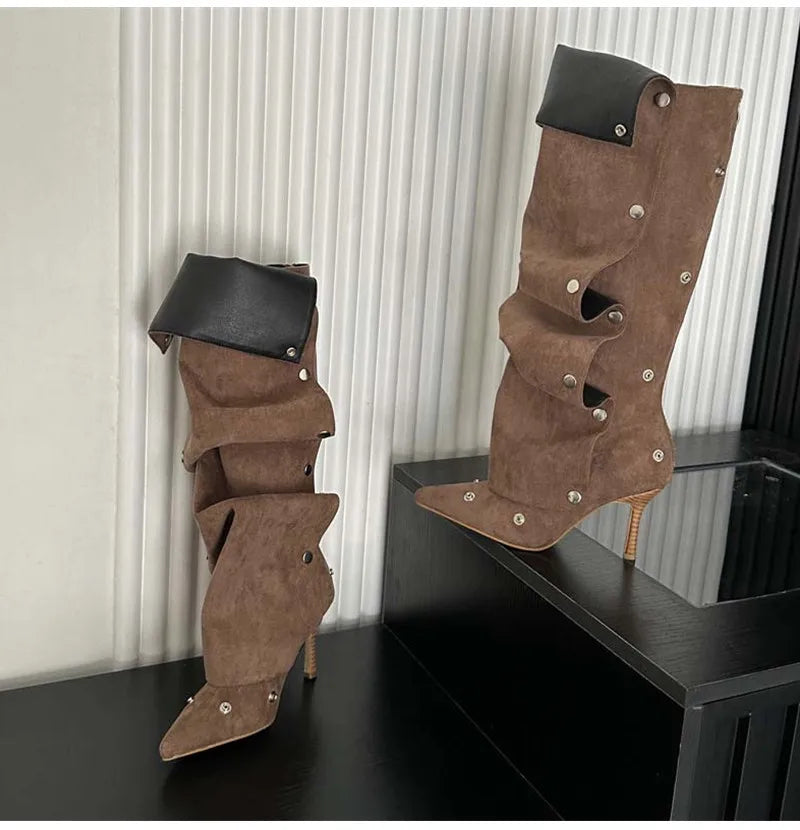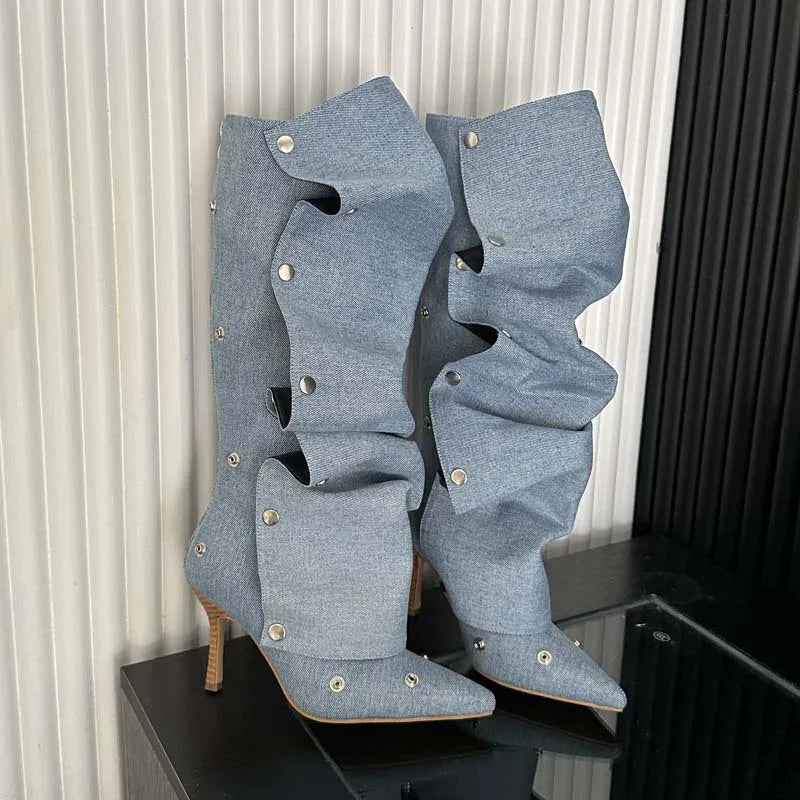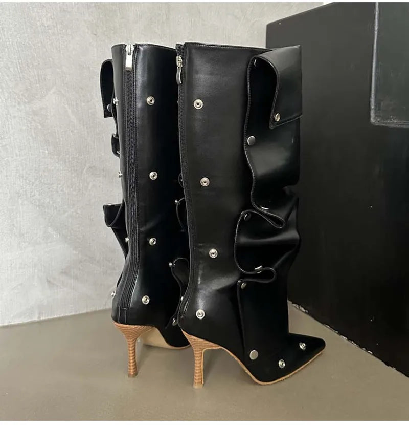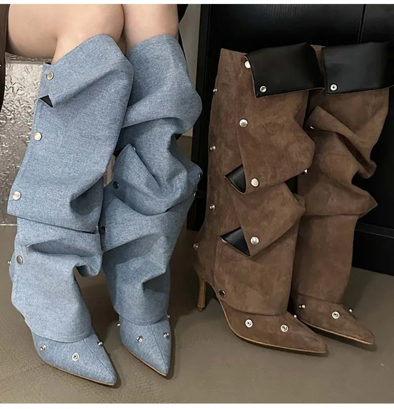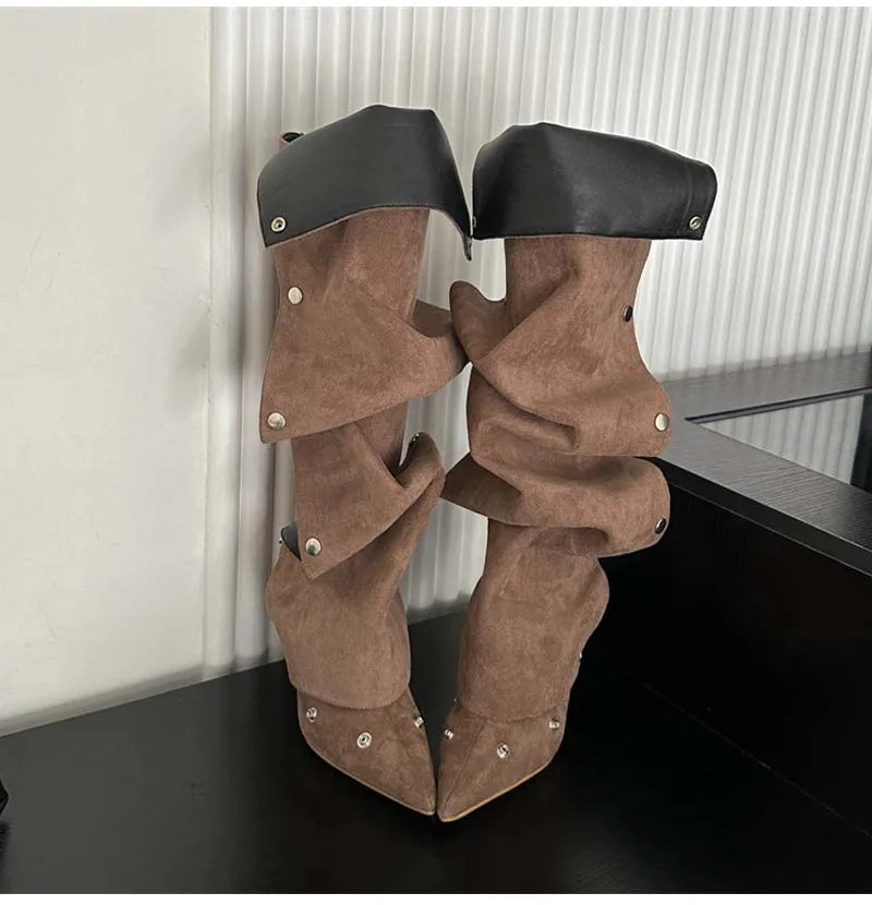 Experience the latest trend with our Rivet Button Pleated Knee-High Boots. Featuring a sophisticated design and luxurious pleated detailing. these boots are perfect for making a statement. Elevate your style and step into the world of high fashion with these must-have boots.
