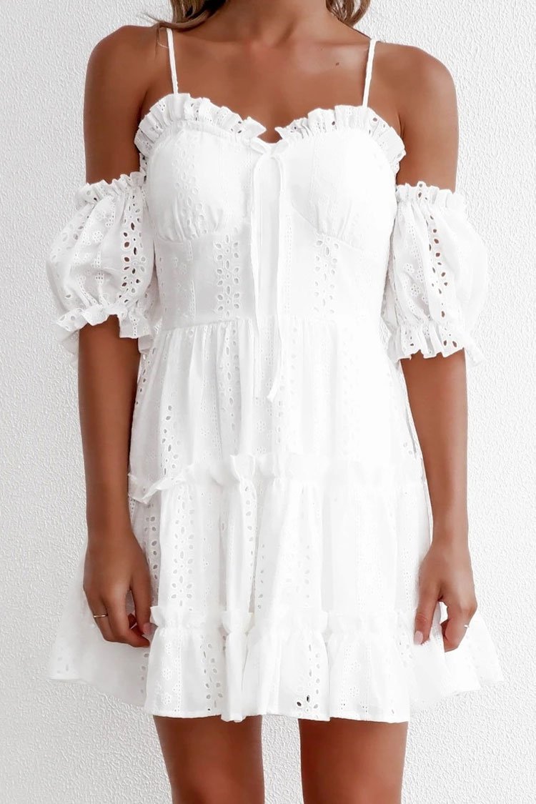 Exquisite mini dress featuring sweetheart neckline with frill trim. detachable short sleeves. bowknot trim on the front. stringy-selvedge trim. openwork design overlay. and flare hemline. Wear this sweetest little white sundress for summer.