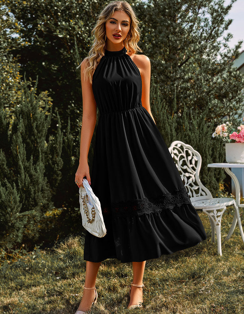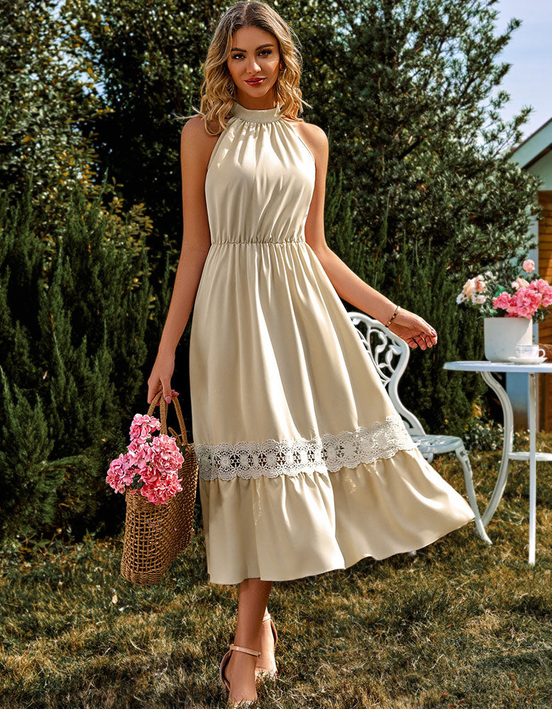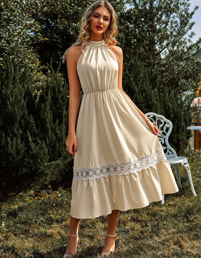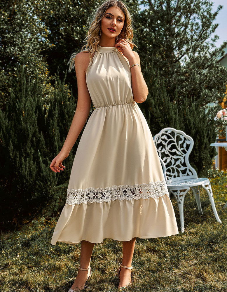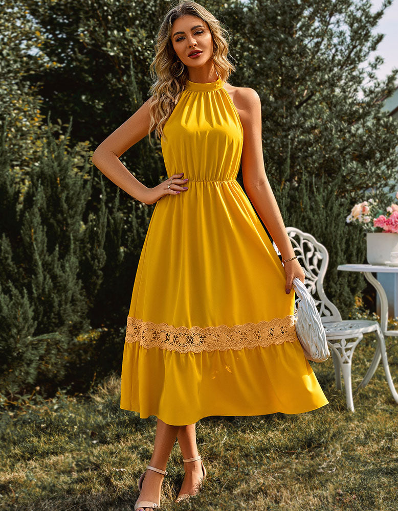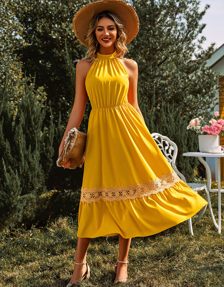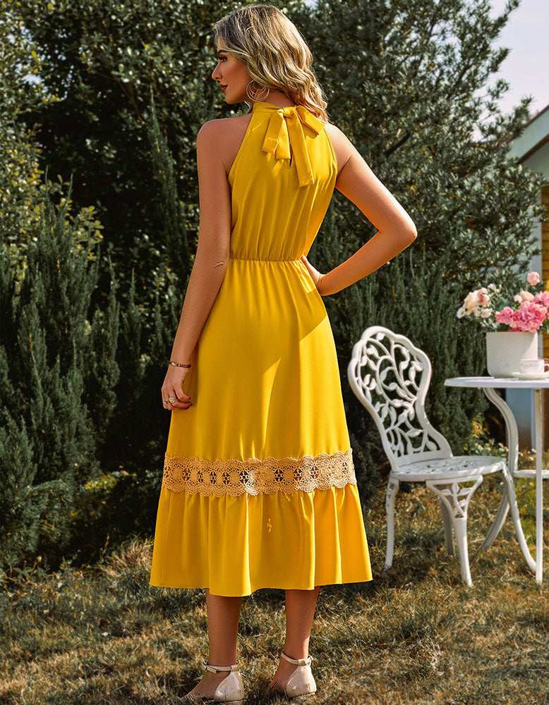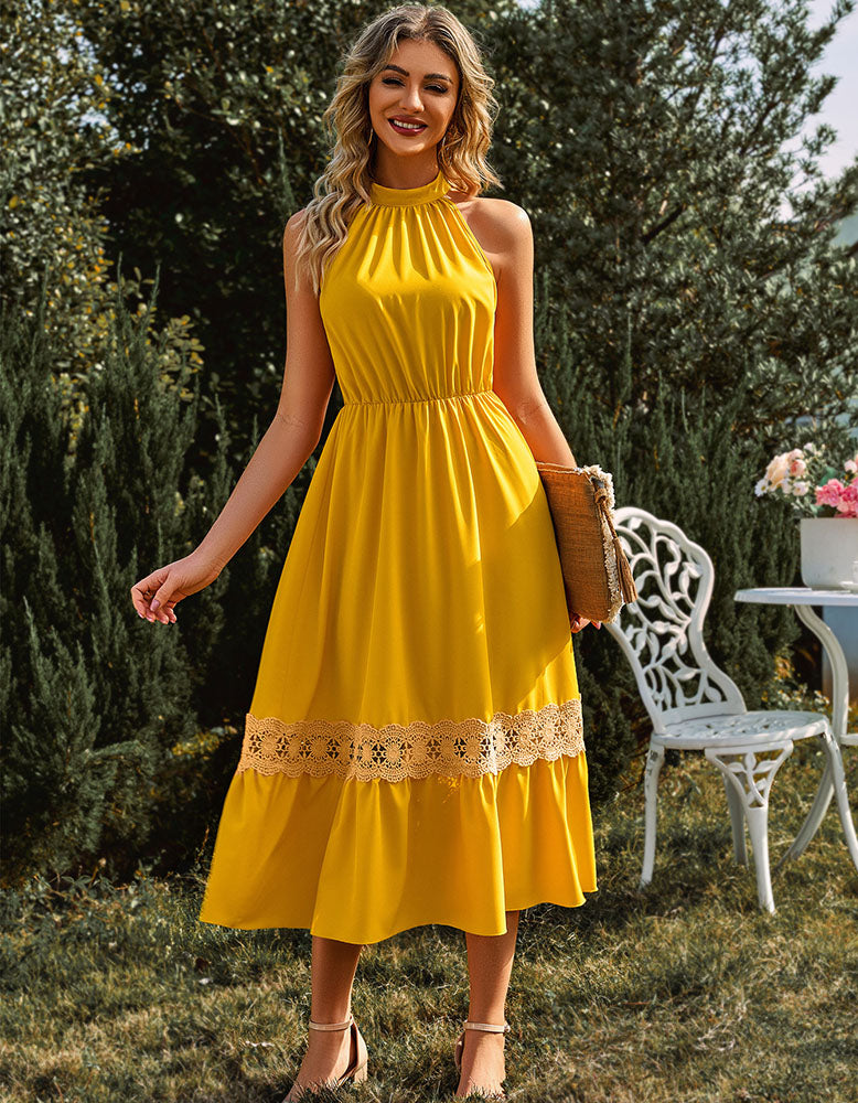 This sleeveless halter lace ruffle long A line dress is perfect for occasions ranging from casual to elegant. Crafted from polyester with a slight stretch to ensure a comfortable fit. it features a classic A-line silhouette with a ruffled hem. lace detailing. and a midi waist. Choose from black. almond. or yellow to find your perfect look.