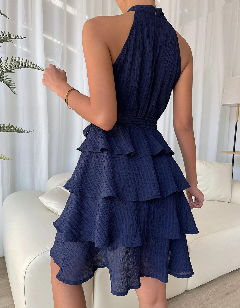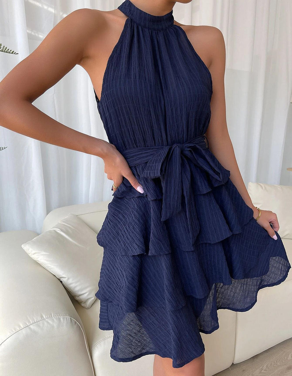 This Sleeveless Halter Round Neck Ruffle Short A Line Dress is sure to make a statement with its elegant and cute style. Featuring a solid-color. plain pattern. ruffle details. and a midi waist. this dress is tailored to fit perfectly in polyester. with slight stretch fabric. Whether you're looking for something casual or formal. this sleeveless dress is sure to be the highlight of your ensemble.