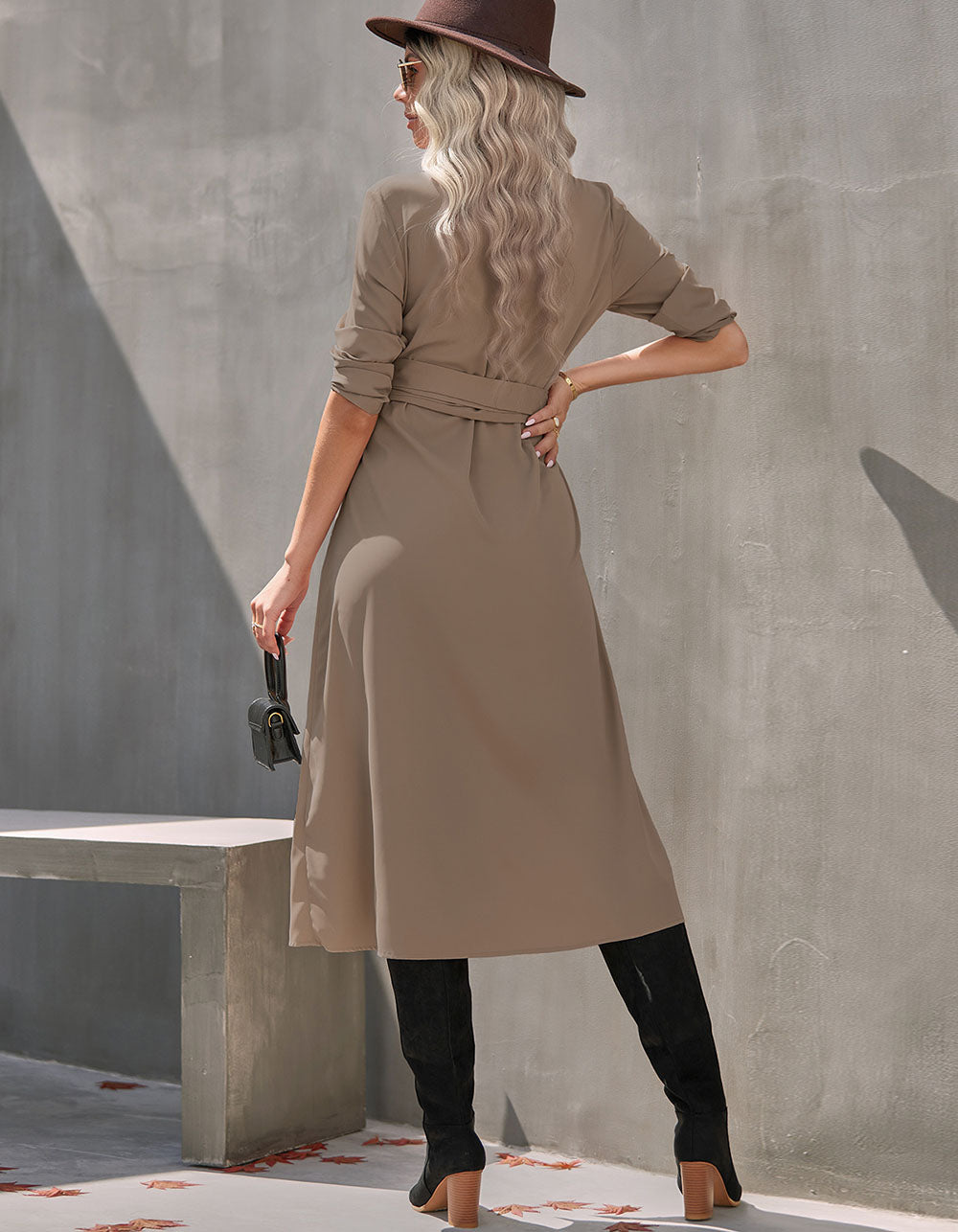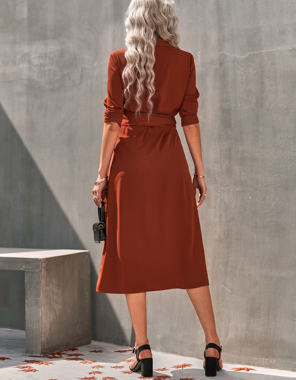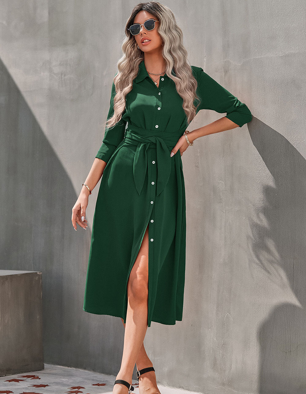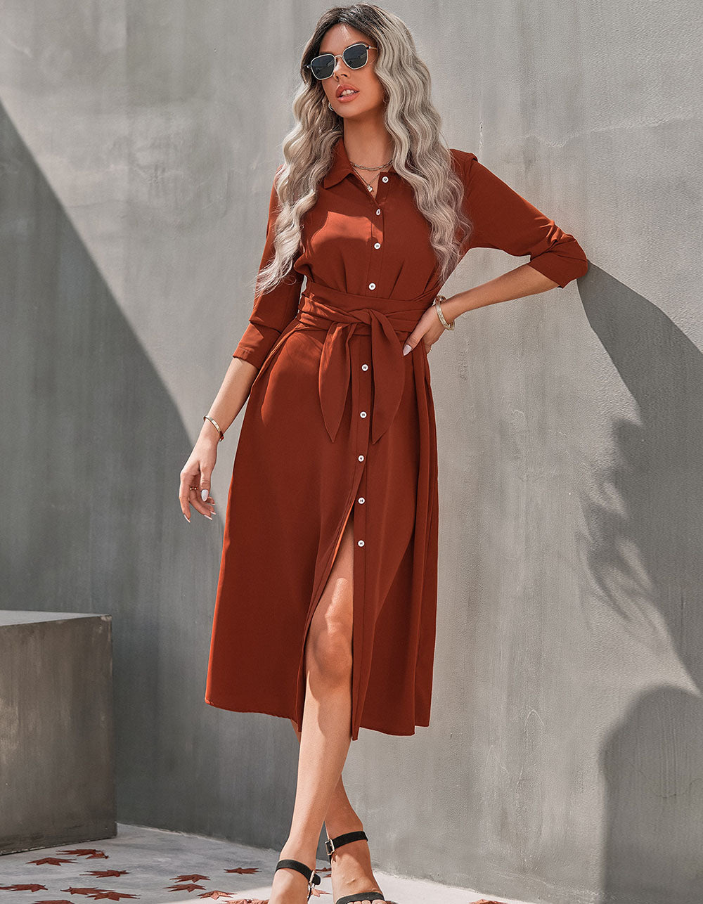 Add a stylish touch to your wardrobe with this Solid-color Collar Button Belted Slits Long Dress. Crafted from Polyester for a comfortable fit and slightly-stretchy feel. this elegant dress features a high waistline. long sleeves. and straight hem. Its sleek collar. belted accents. and button detailing further elevate its allure. Choose between three colors and two patterns to find the perfect look for any occasion.