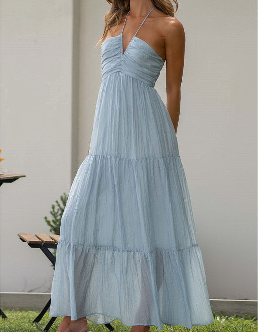This Solid-color Halter Backless Sleeveless Long Ruffle Hem A-Line Dress flaunts a bright. solid-color that is sure to draw attention. Featuring a sleeveless. halter neckline and a ruffle hem. this dress has a mid-waist fit and is crafted from a slight-stretch polyester material. The A-line silhouette makes it suitable for a variety of occasions.