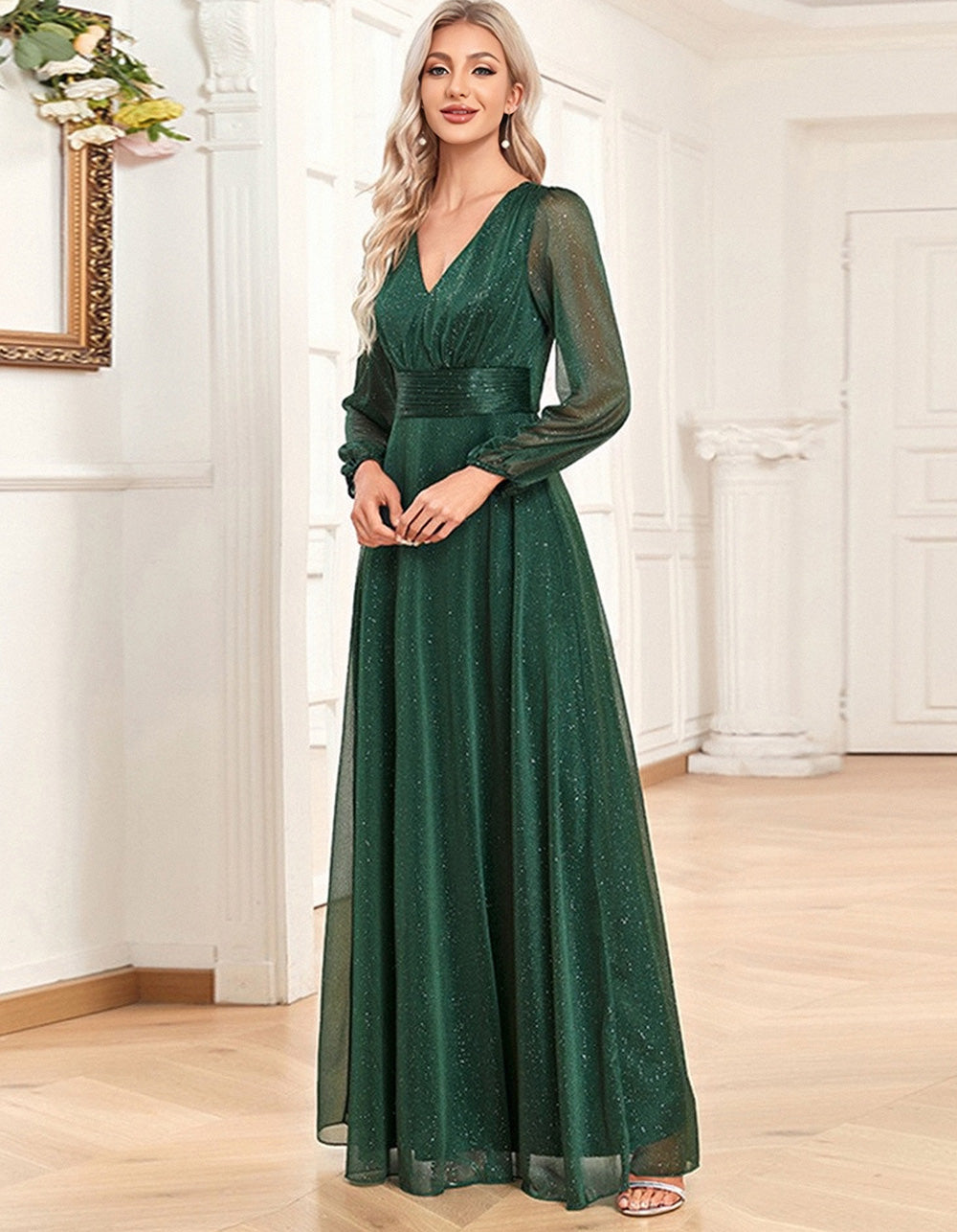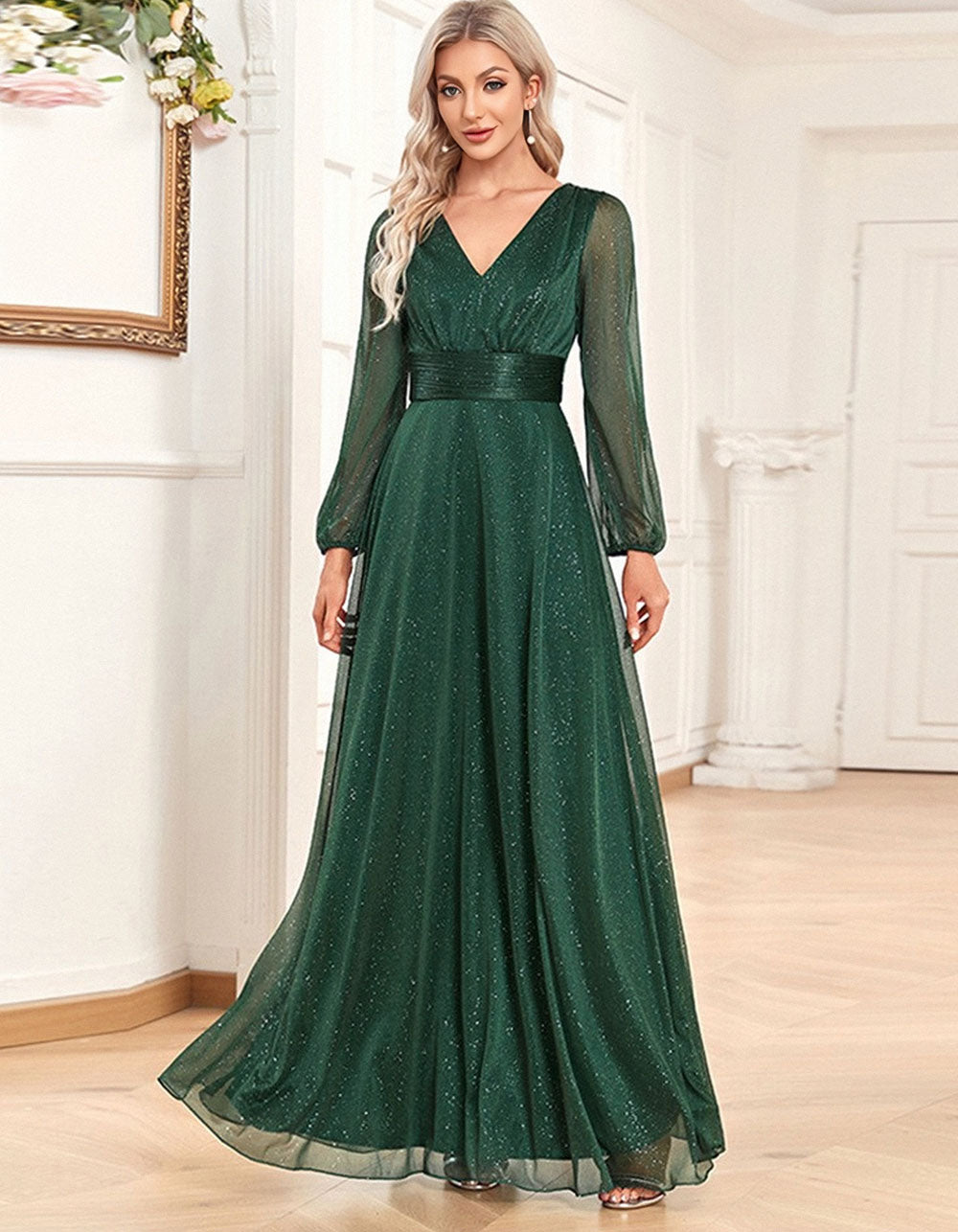 This stylish and timeless A-Line dress features a solid green hue. V neckline. long-sleeves. high waist. and a flattering ruffle hem. Further enhanced by stitching details and made from a slight stretch-polyester. this beautiful dress is perfect for both casual and elegant occasions.