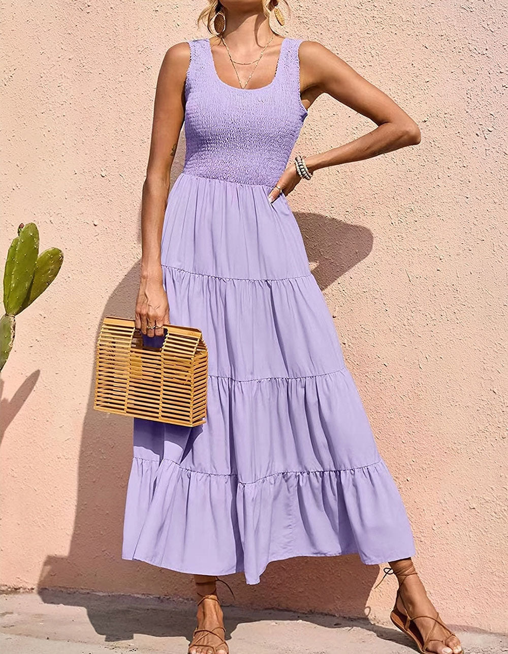 This Solid-color Plain Round Neck Sleeveless Pleated Long A-Line Cami Dress is perfect for a chic. elegant look. It features a classic A-line silhouette with backless and pleated details for added charm. Crafted with a soft and slight-stretch fabric. it's available in four colors: Green. Purple. Khaki. and Black. This dress is sure to complete any wardrobe.