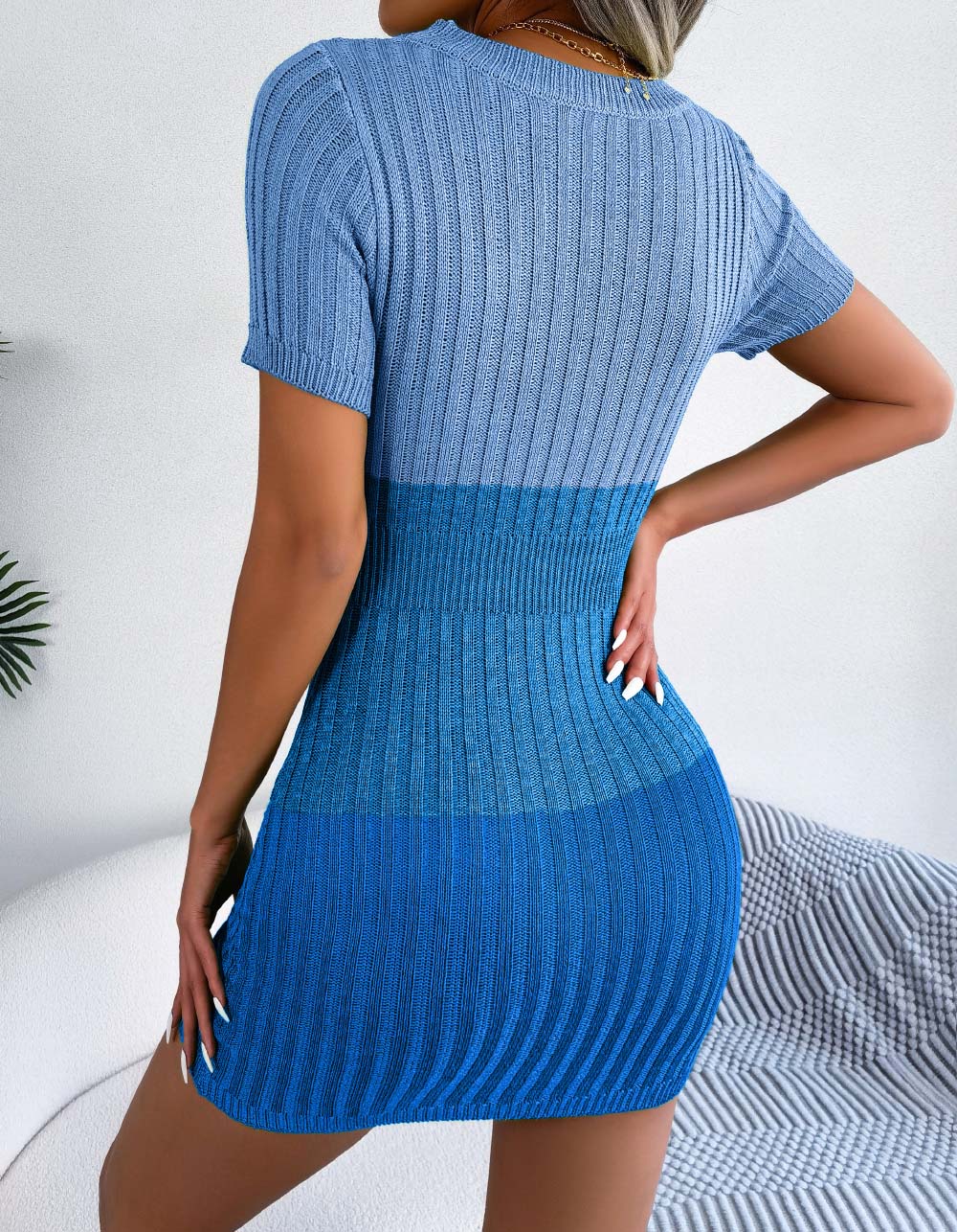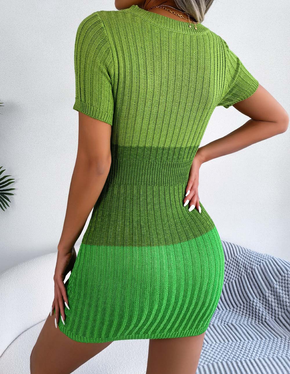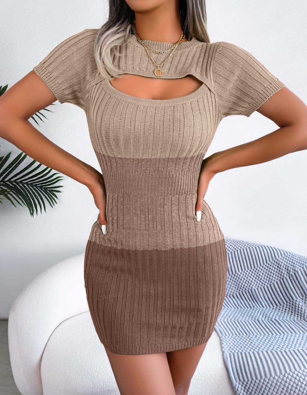 This Solid-color Round Neck Cutout Short Sleeve Knit Bodycon Dress is designed to flatter your curves and make a statement. Made of high-quality viscoce material with a slight stretch. this dress is available in three colorsï¿?green. khaki. and blue. It has a round neck and short sleeves and features an eye-catching cutout detail. The pencil hem shape creates a slim fit to complete the look.