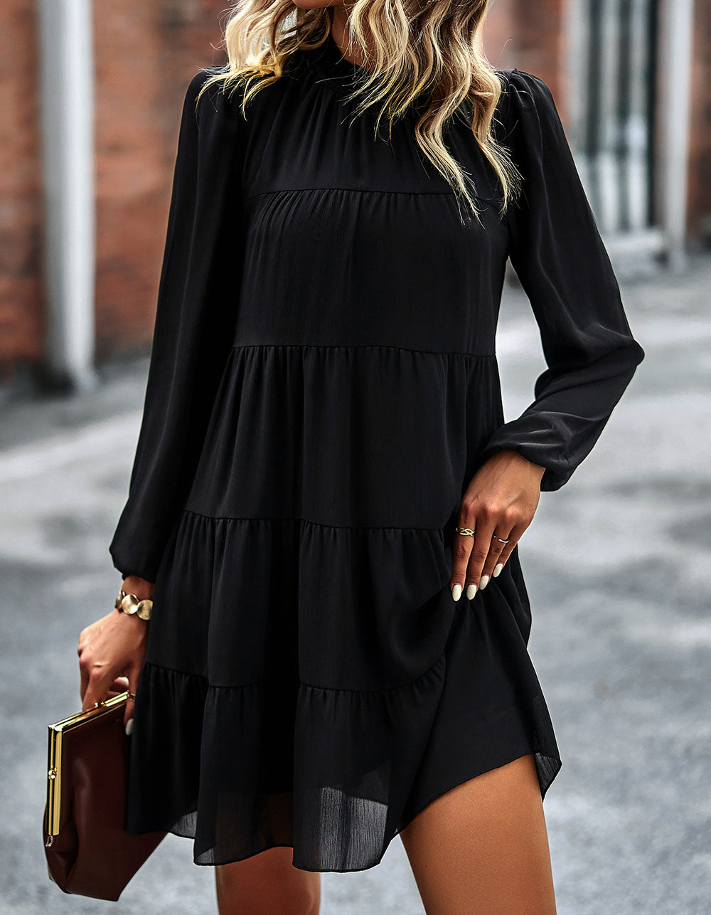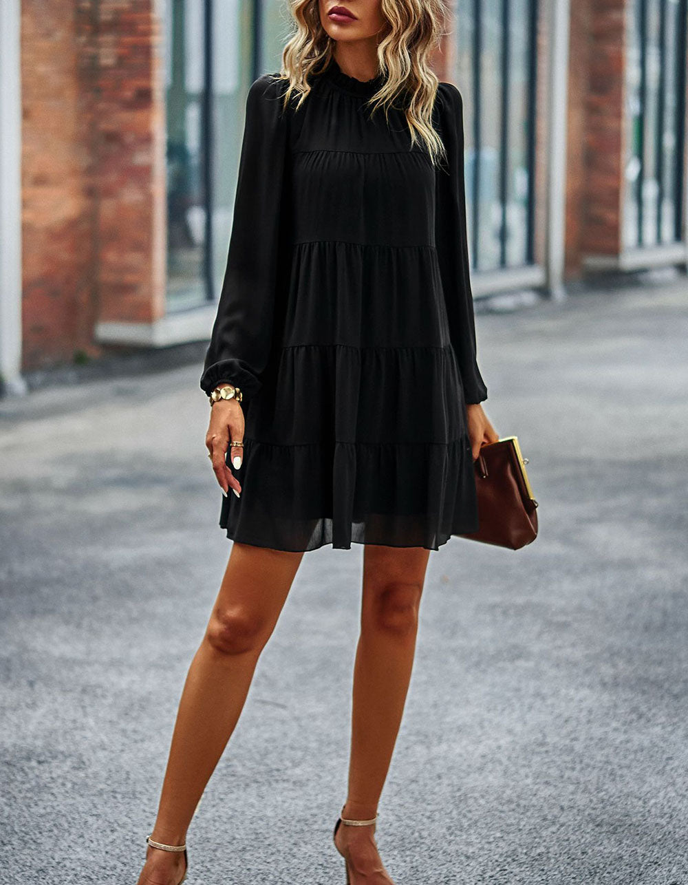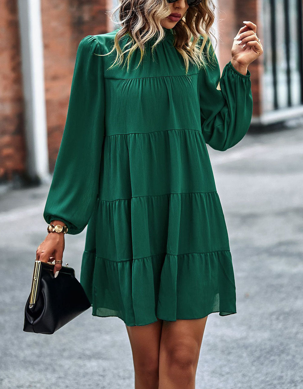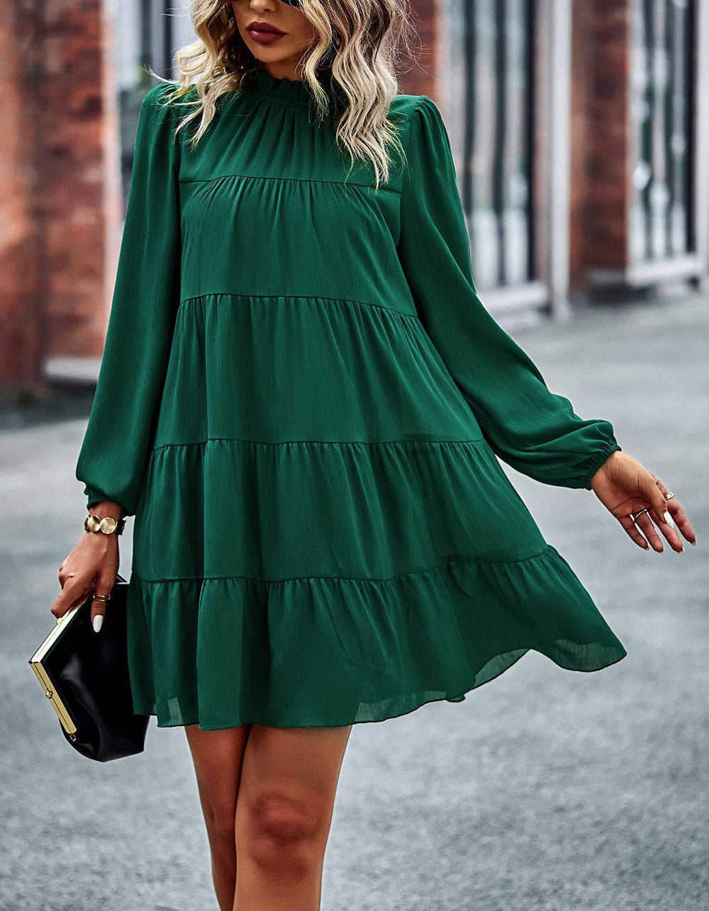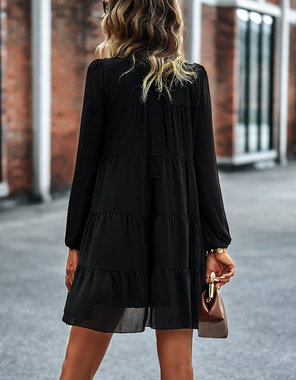 Stay fashionable with this Solid-color Round Neck Long Sleeve Loose Short A-Line Ruffle Hem Dress! It features a striking silhouette in a variety of stunning colors. an elegant round neckline. mid-waist fit. and lightweight polyester fabric with slight stretch. Look great for any casual occasion!