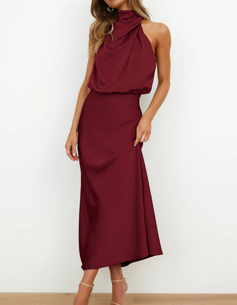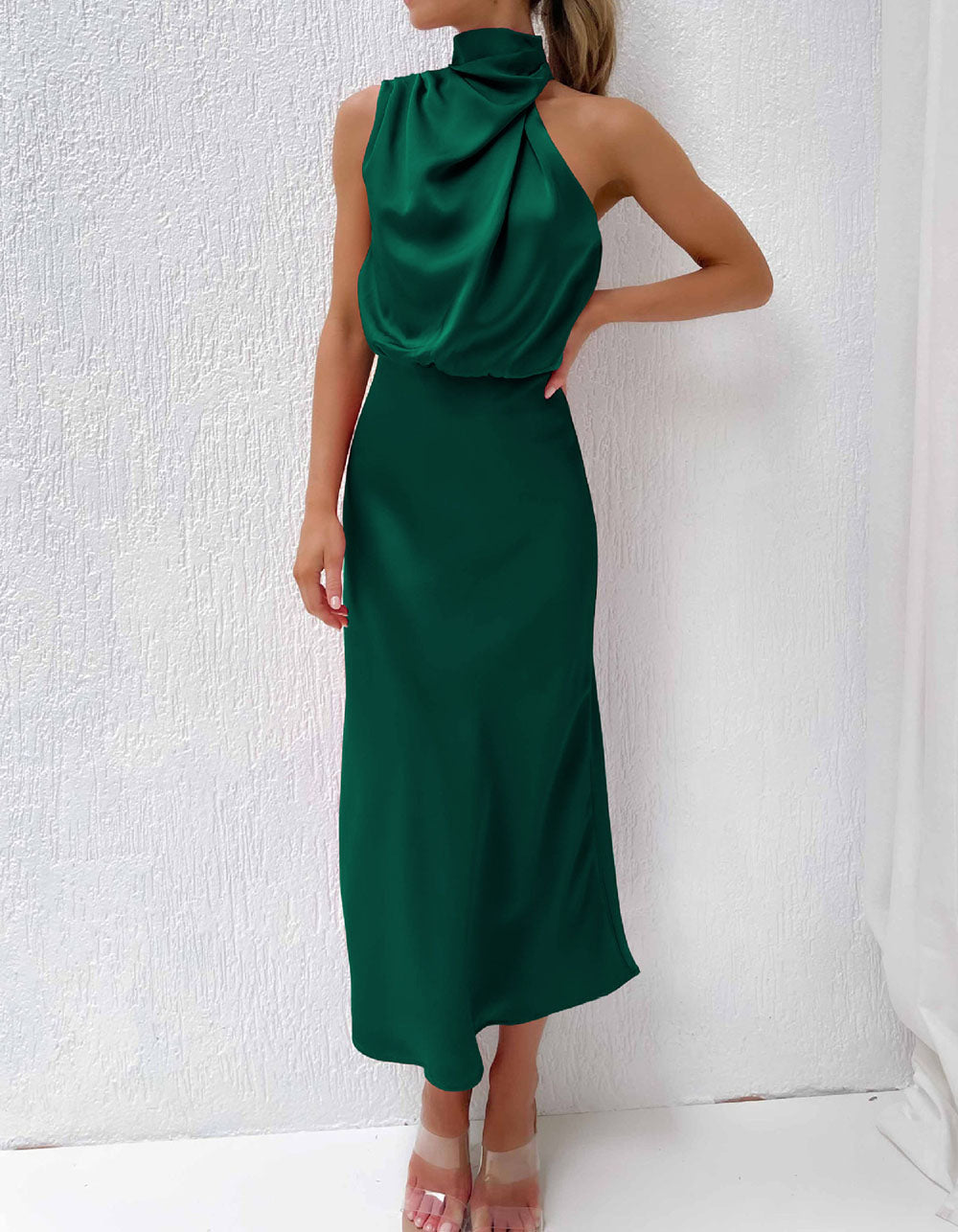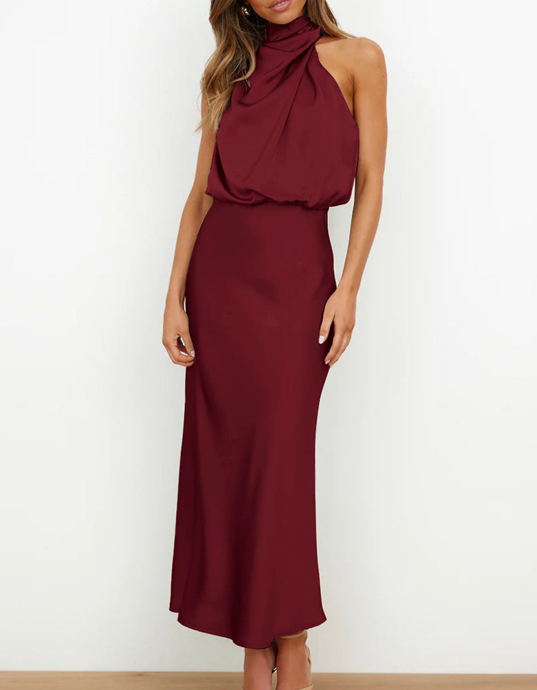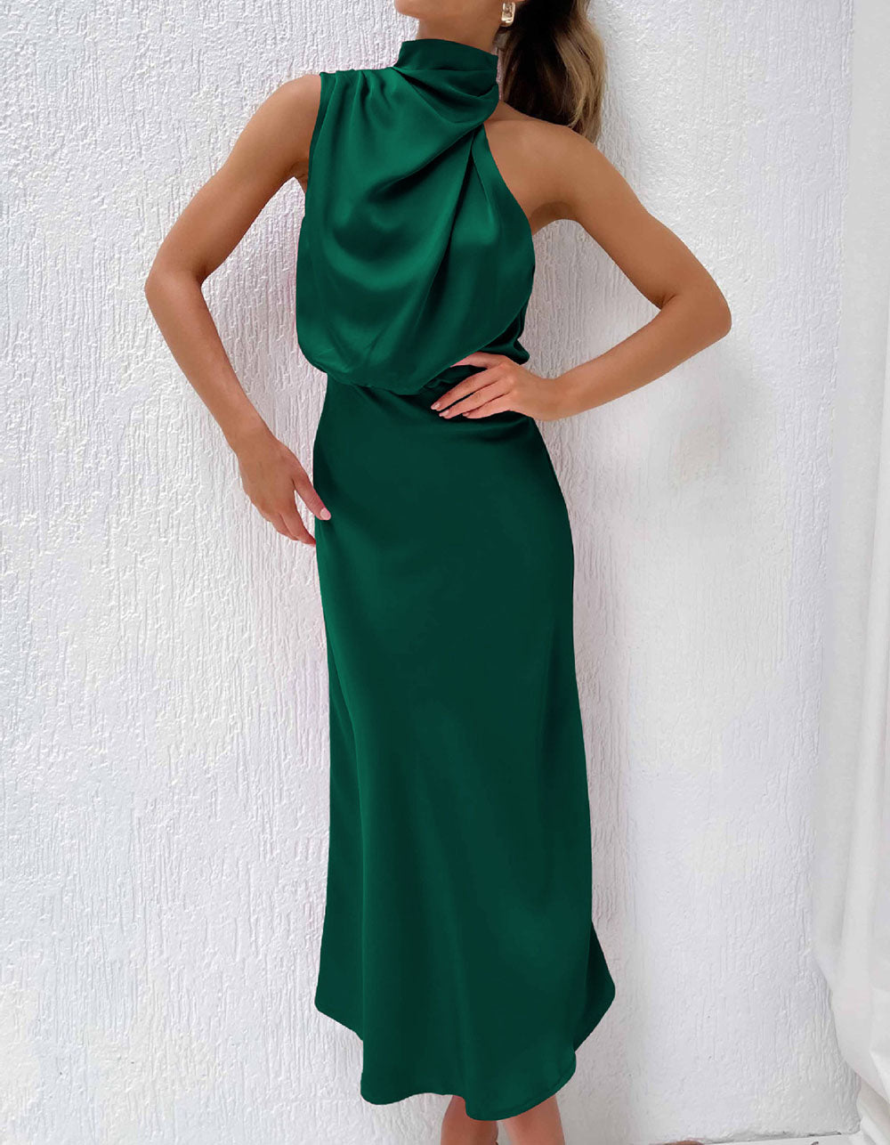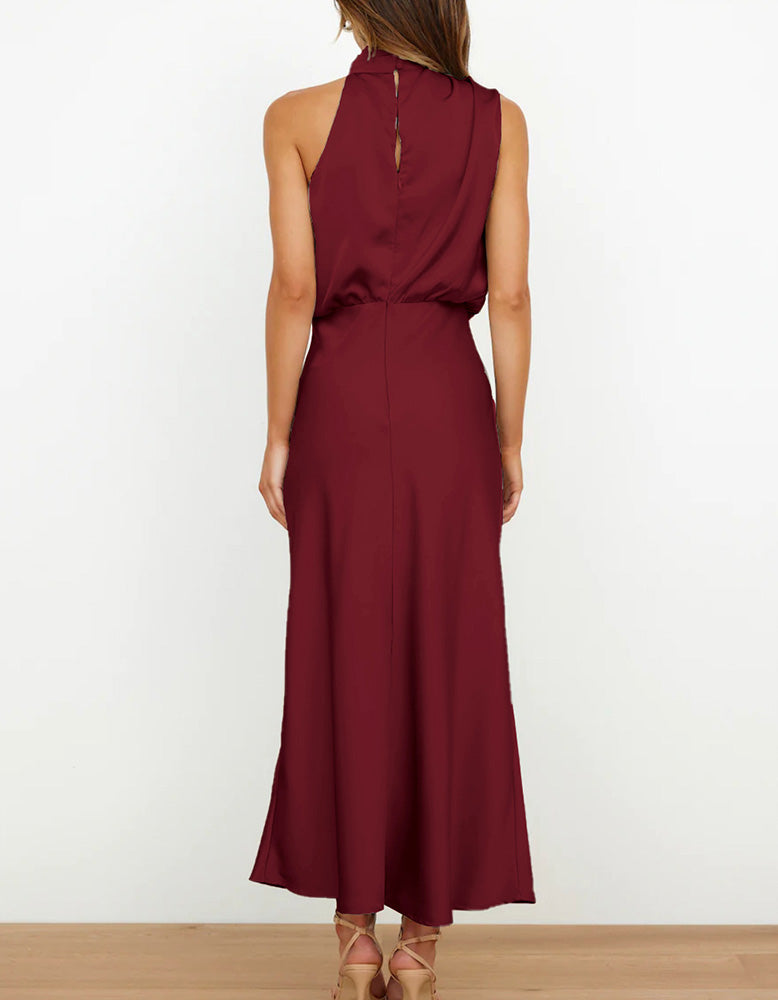 Enjoy standout style in any season with this Solid-color Semi-tall Collar Satin Sleeveless Party Long Dress. featuring a semi-tall neck. high waist. and a pencil hem shape. Crafted from Polyester and with a slight-stretch fabric. this elegant and casual dress is finished with a zipper closure for a secure fit. Available in Almond. Green. Red. and Black.