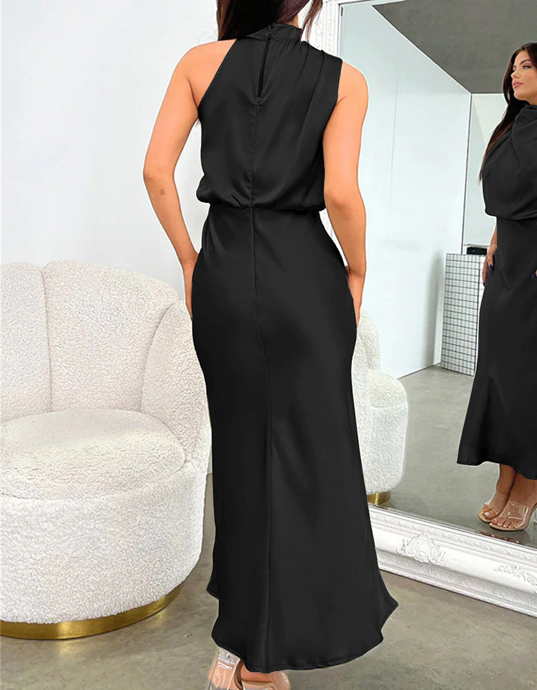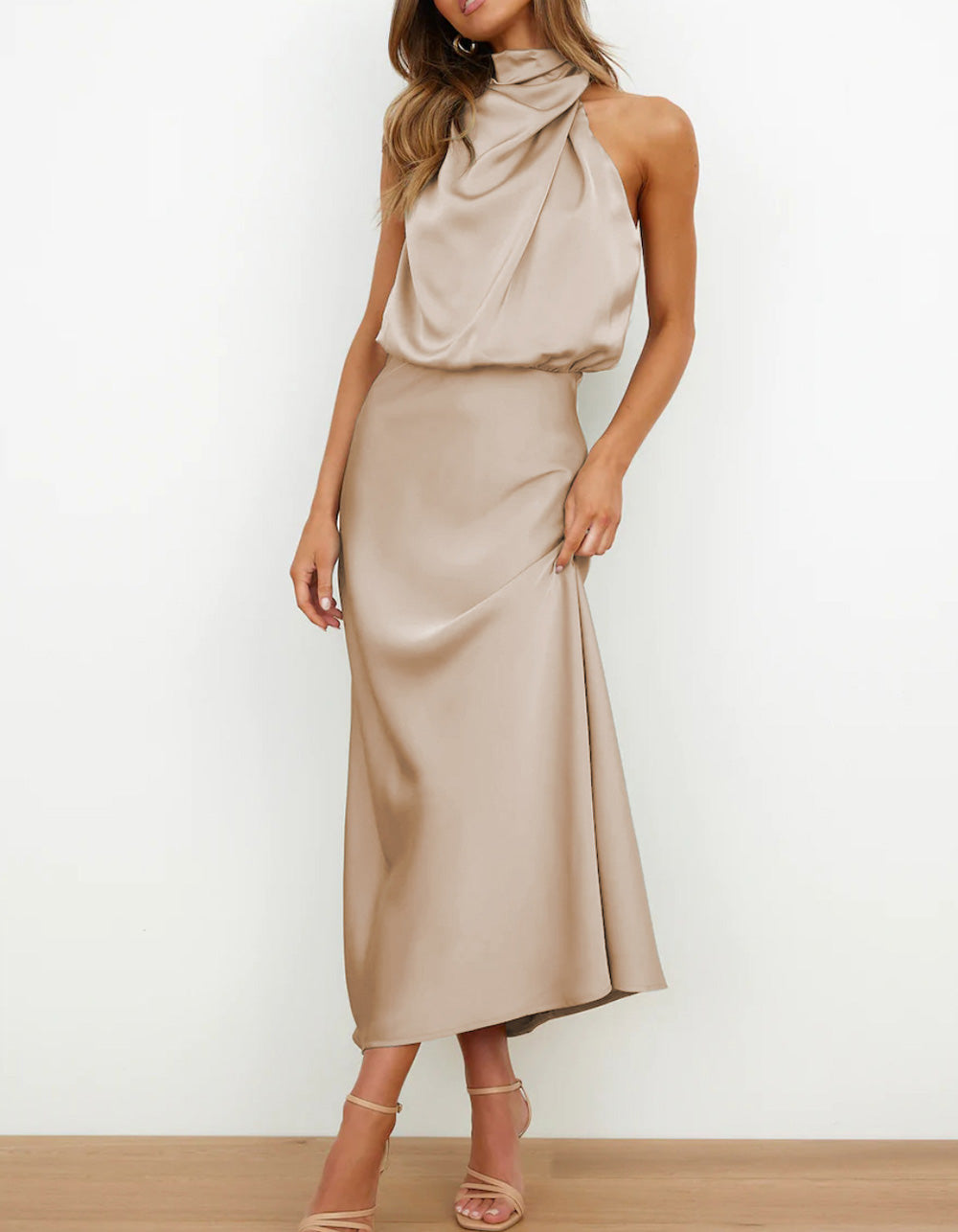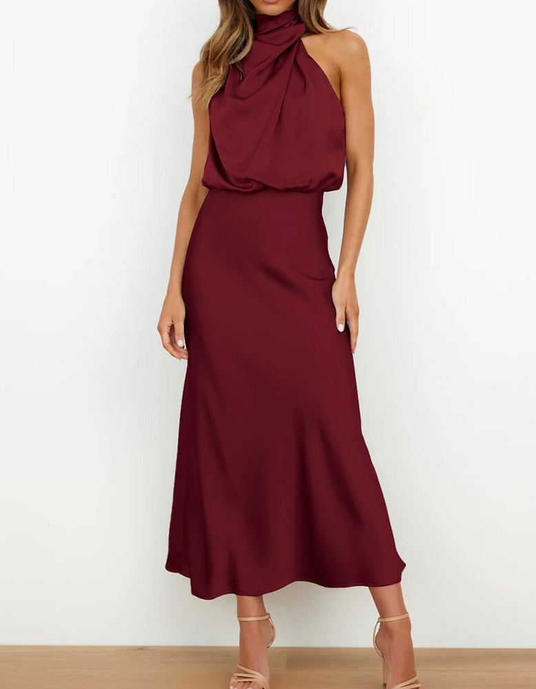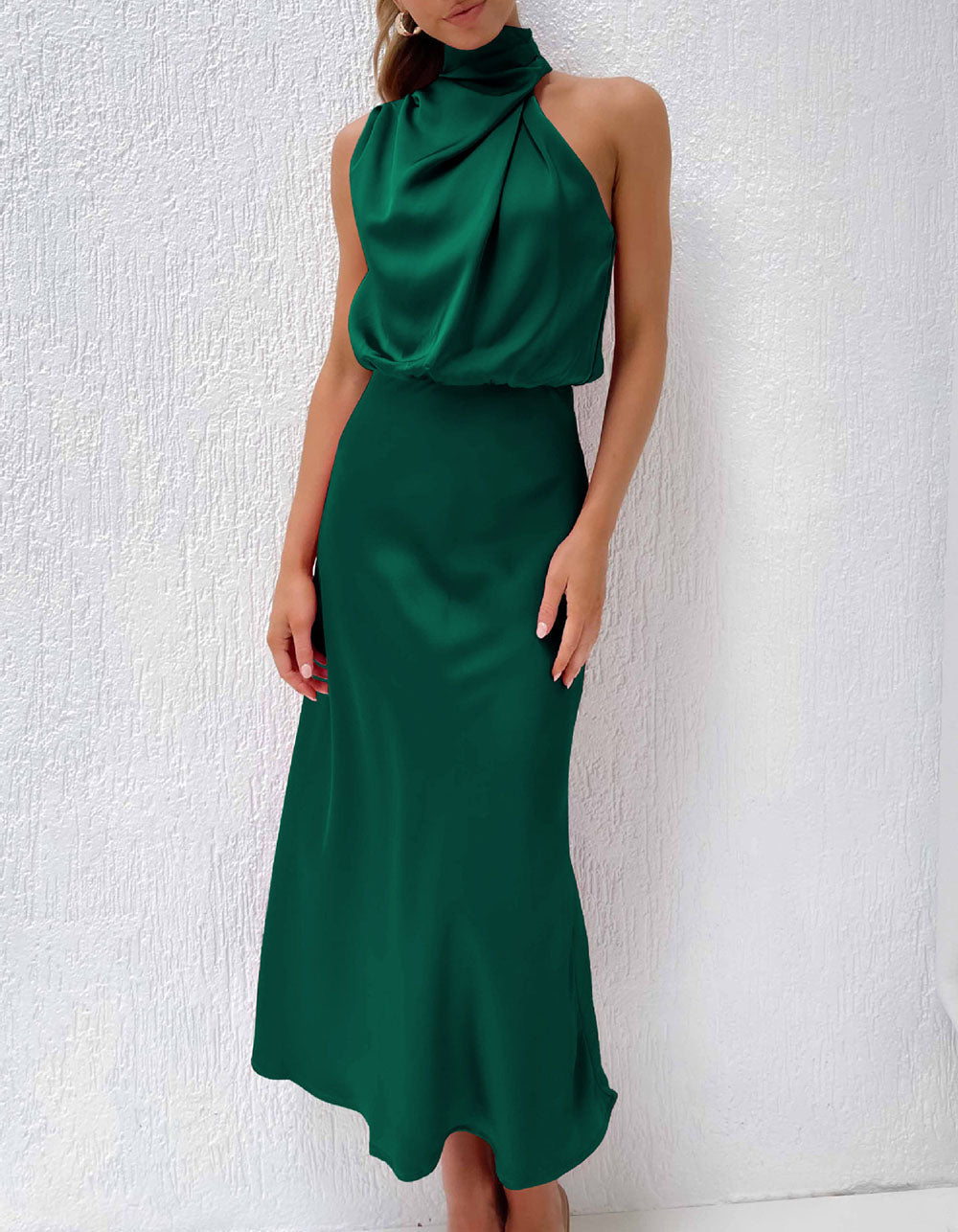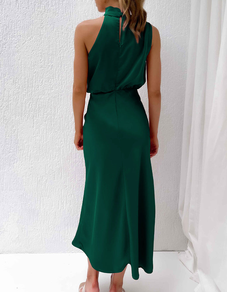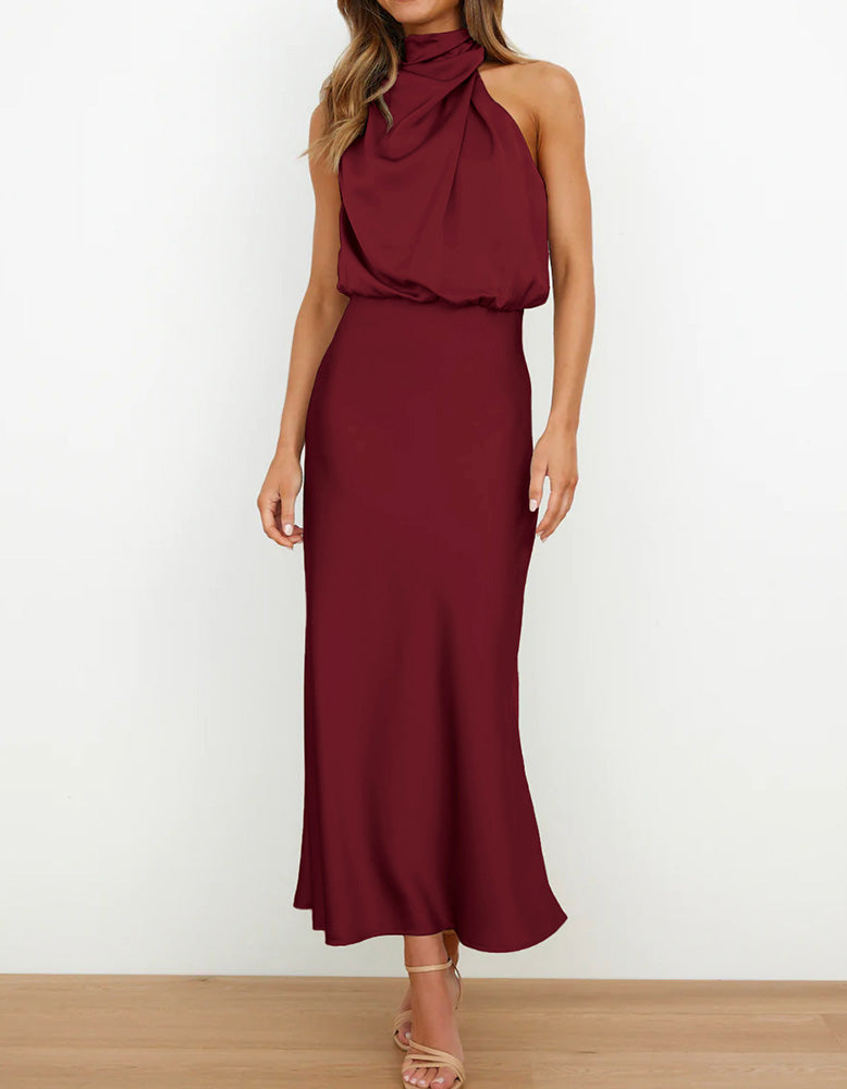 Enjoy standout style in any season with this Solid-color Semi-tall Collar Satin Sleeveless Party Long Dress. featuring a semi-tall neck. high waist. and a pencil hem shape. Crafted from Polyester and with a slight-stretch fabric. this elegant and casual dress is finished with a zipper closure for a secure fit. Available in Almond. Green. Red. and Black.