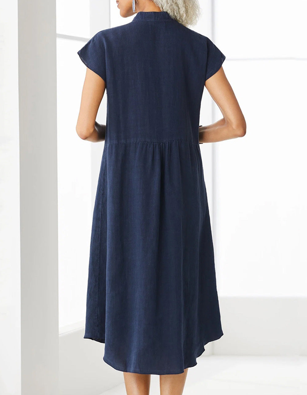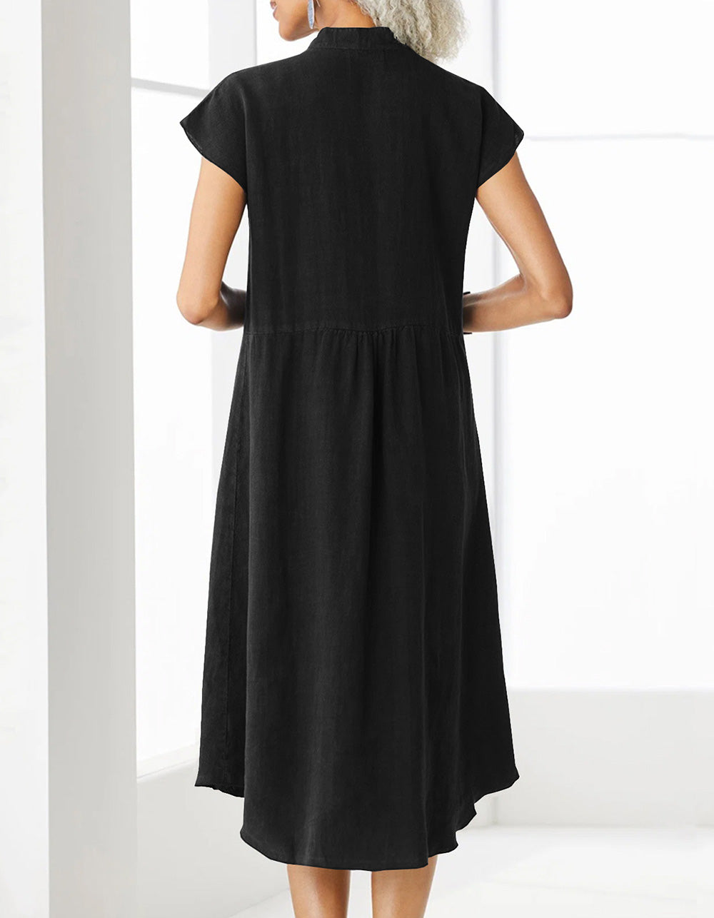This timeless A-line dress has just the right touch of style to take you from day to night. With its solid-colour construction. lapel neckline. button details. and subtle ruffle hem. you'll look chic and professional. Crafted from cotton and linen in dark blue. gray. black. and white colours. its mid-waist fit will flatter in any setting.