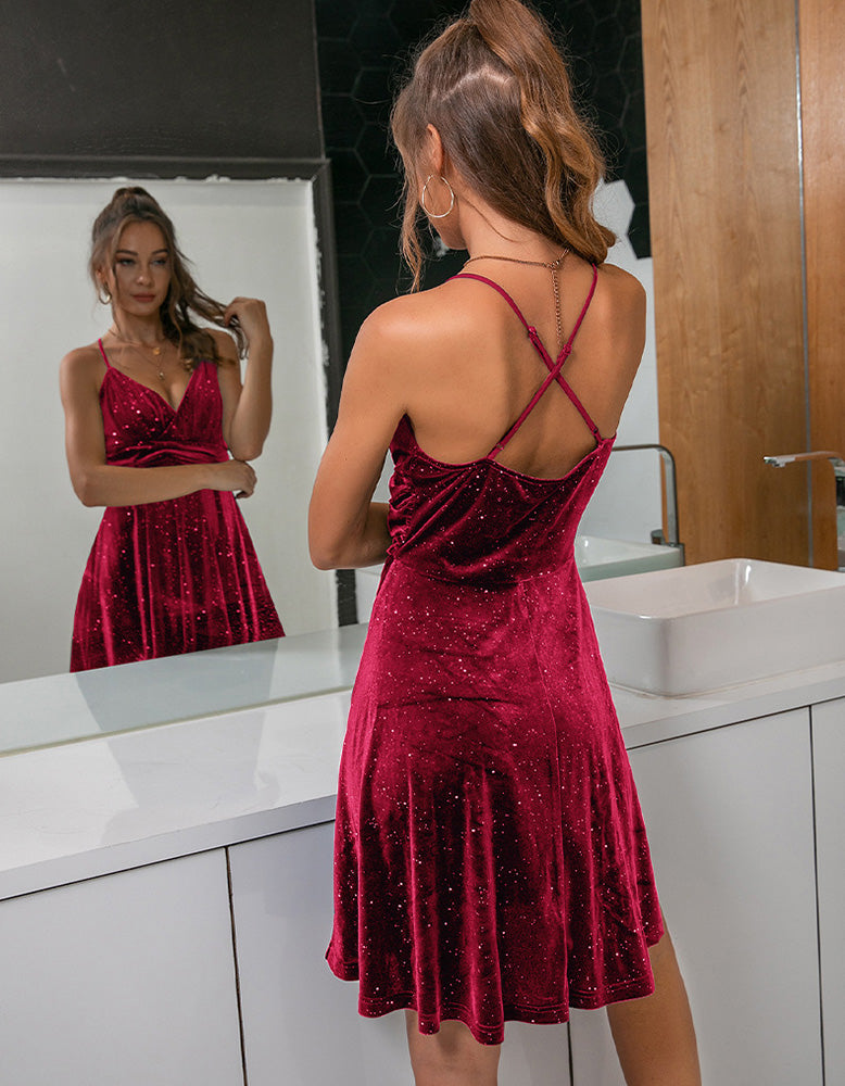 This Solid-color Strap Backless Gold Velvet Dinner Dress is perfect for any special occasion. It features a midi length with a pleated A-line silhouette. high waist. and ruffle hemline. Made of polyester with slight stretch. this dress is available in 4 elegant colors: blue. green. black. and claret.