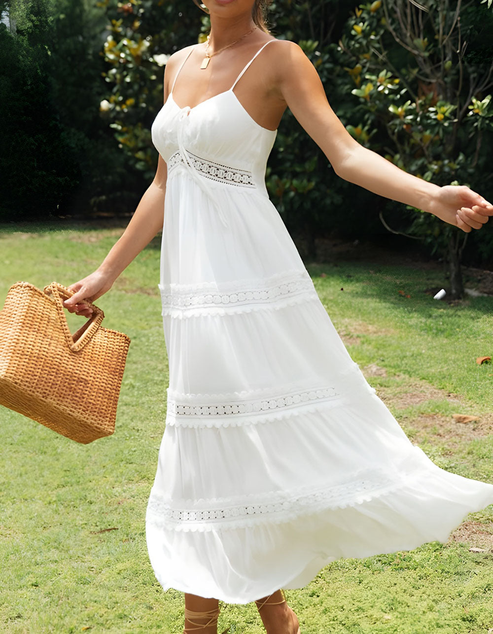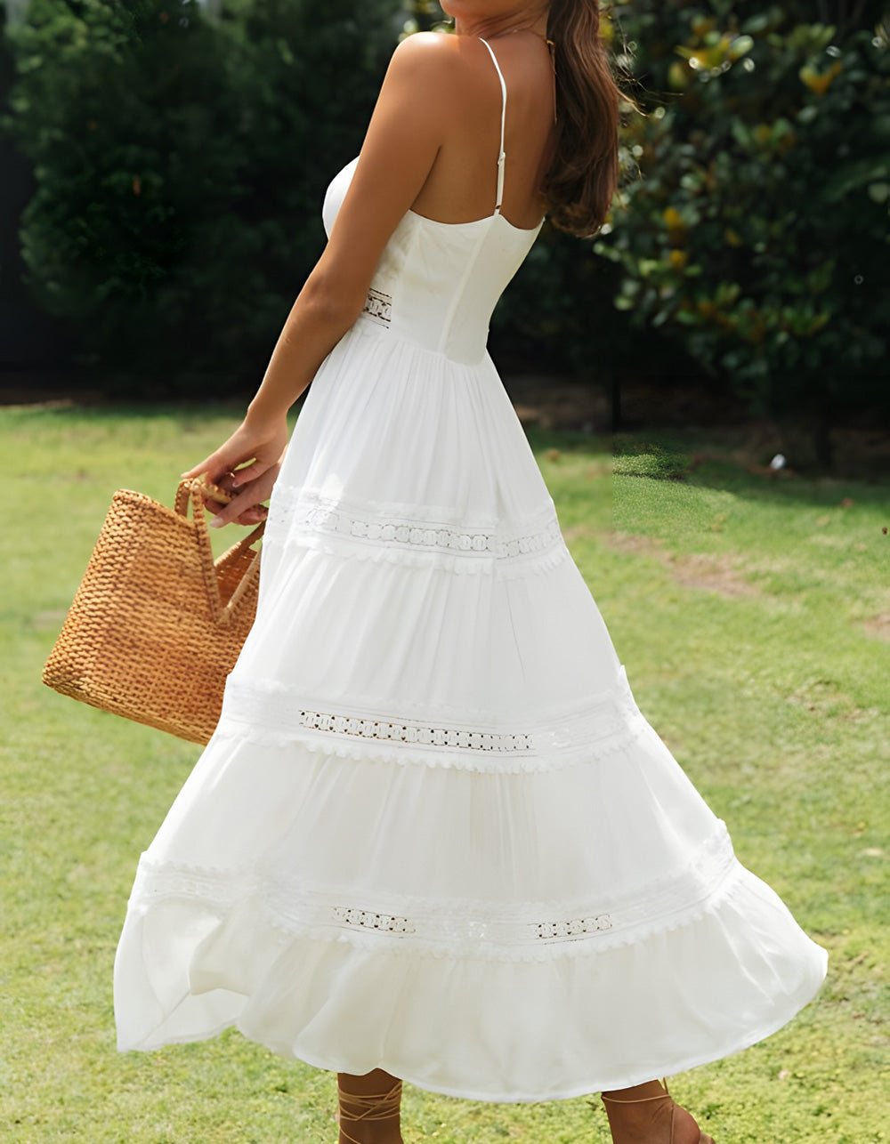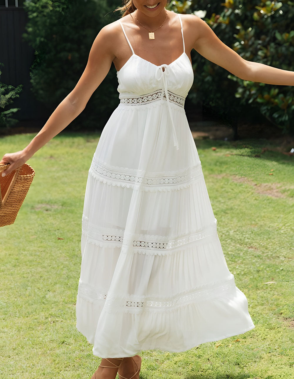 This sleek. Solid-color Strap Ruffle Backless Long A-Line Dress gives you the perfect combination of style. comfort and elegance. Crafted with Polyester fabric and featuring a classic A-Line silhouette. white color. sleeveless style. high waist. ruffle details. and backless design. this dress is sure to impress. Pair with your favorite accessories and make a lasting impression.