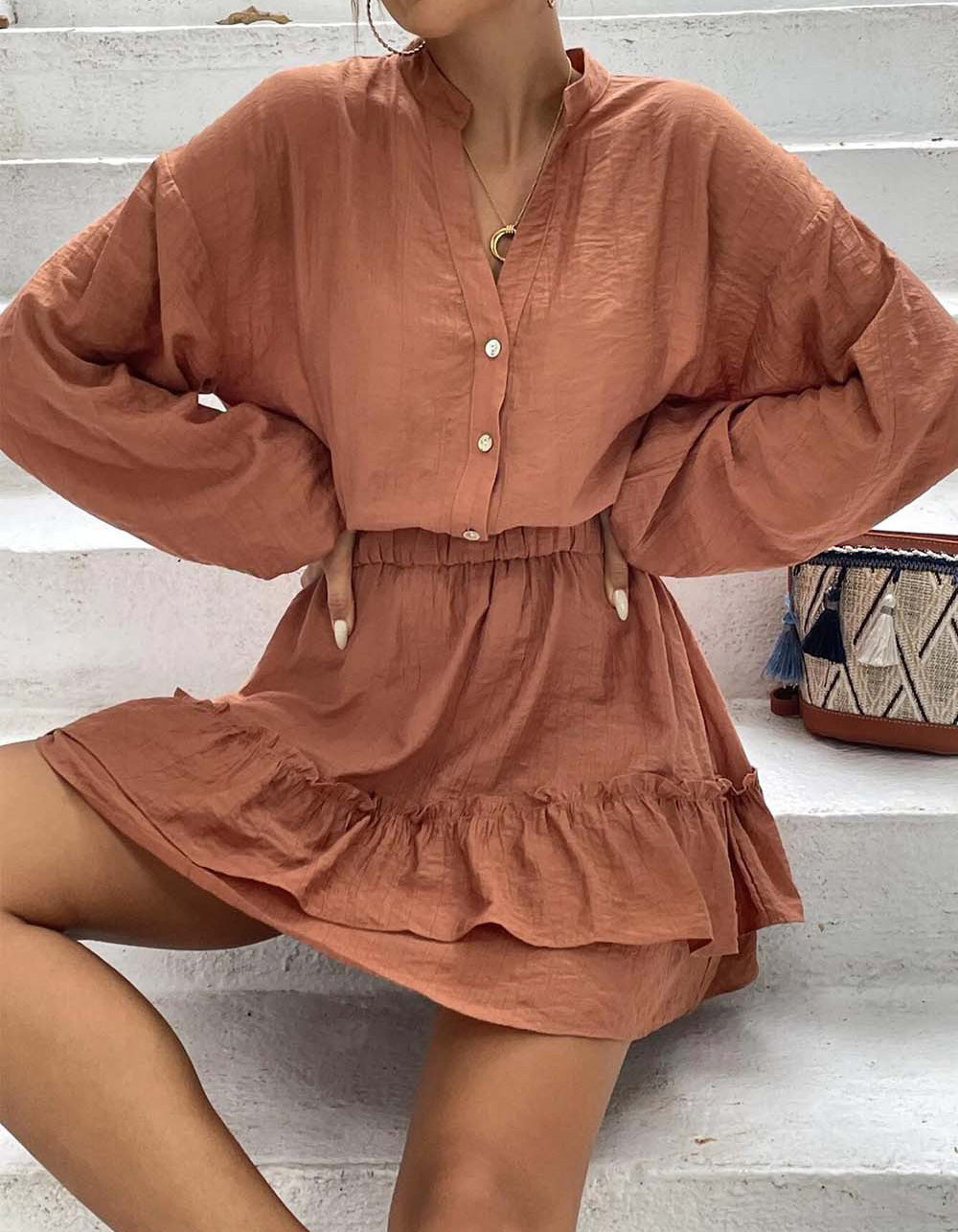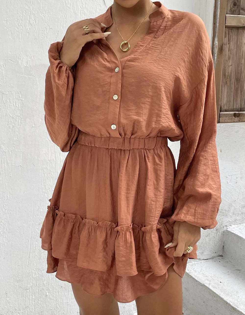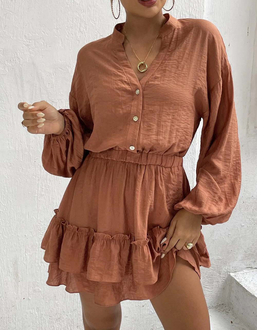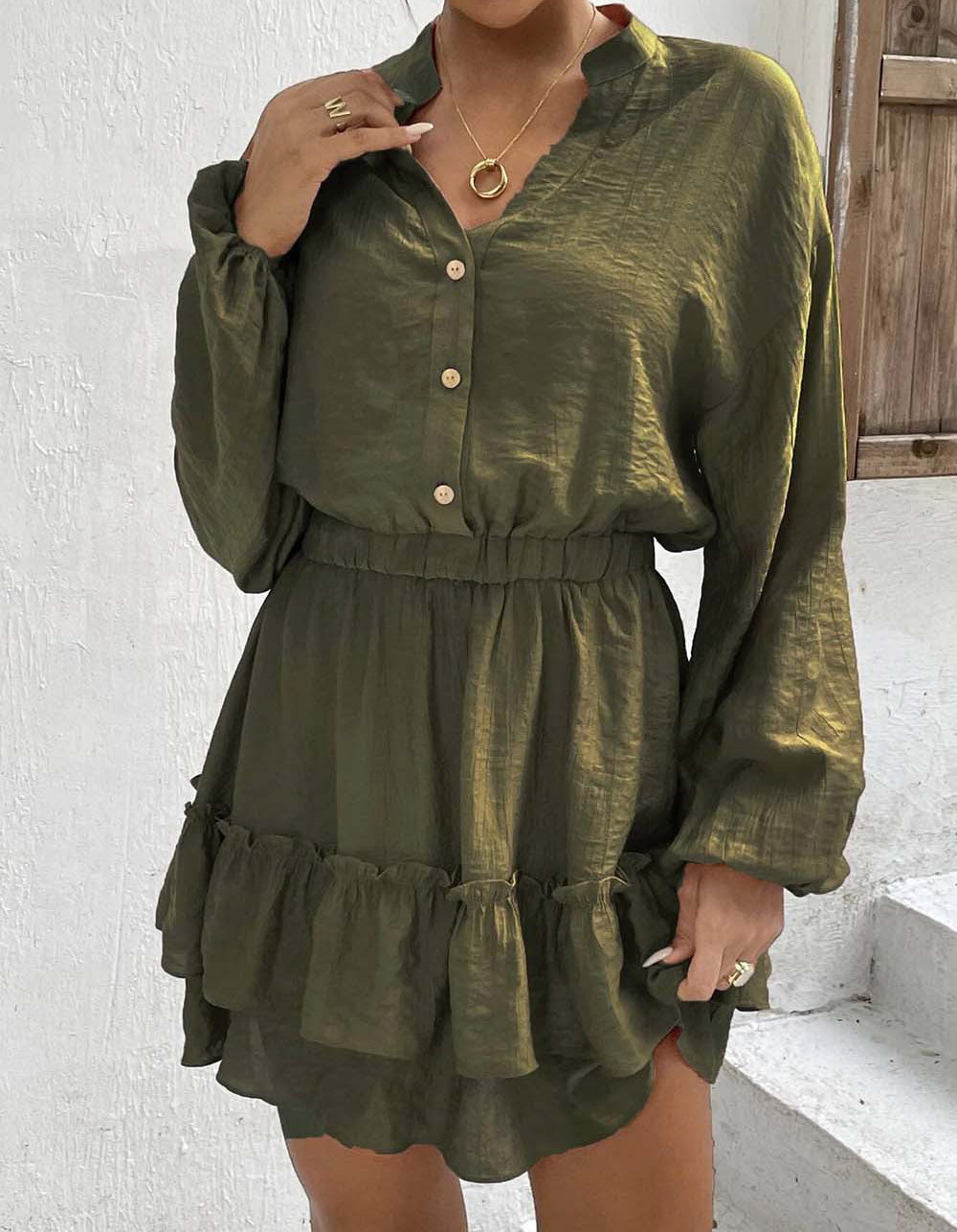 This Solid-color V Neck Long Sleeve Ruffle Short A-Line Dress from the Cute. Elegant. Casual collection offers a refined. timeless look. Crafted from lightweight polyester with a slight stretch. this dress is designed with a V-neckline. button details. and a mid-waist silhouette for a modern touch. The subtle ruffle hem adds a graceful finishing touch for a look that's perfect for any occasion. Available in red. green. and khaki.