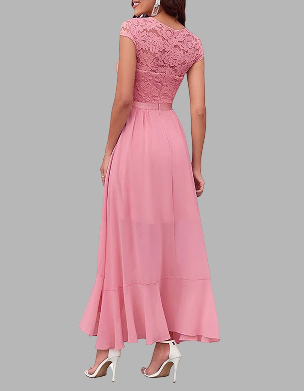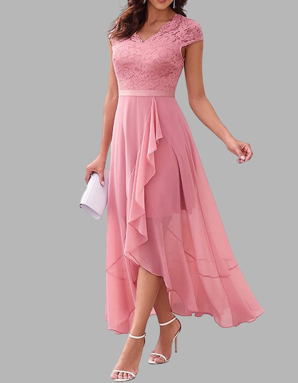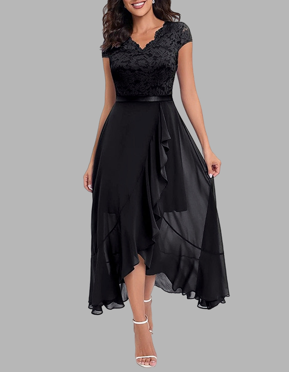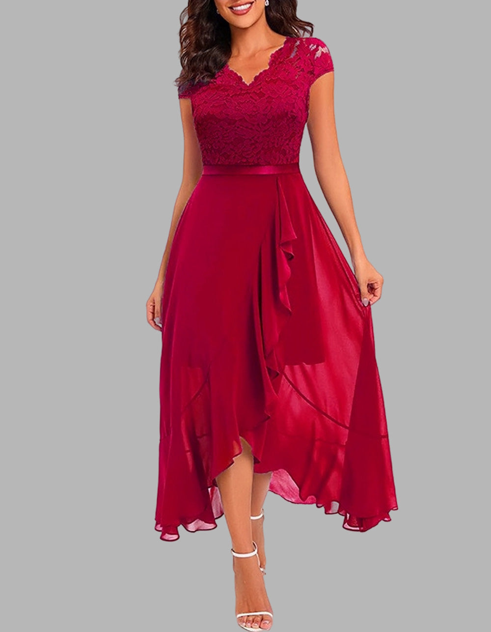 This chic dress brings a modern touch to your wardrobe with a solid-color. lace-accented A-line silhouette. Bold colors and unique detailing such as the asymmetrical hem and ruffled waistline create an elegant yet boldly confident look. Crafted from Polyester with slight-stretch for a comfortable fit. this must-have dress will be the perfect ensemble for any occasion.